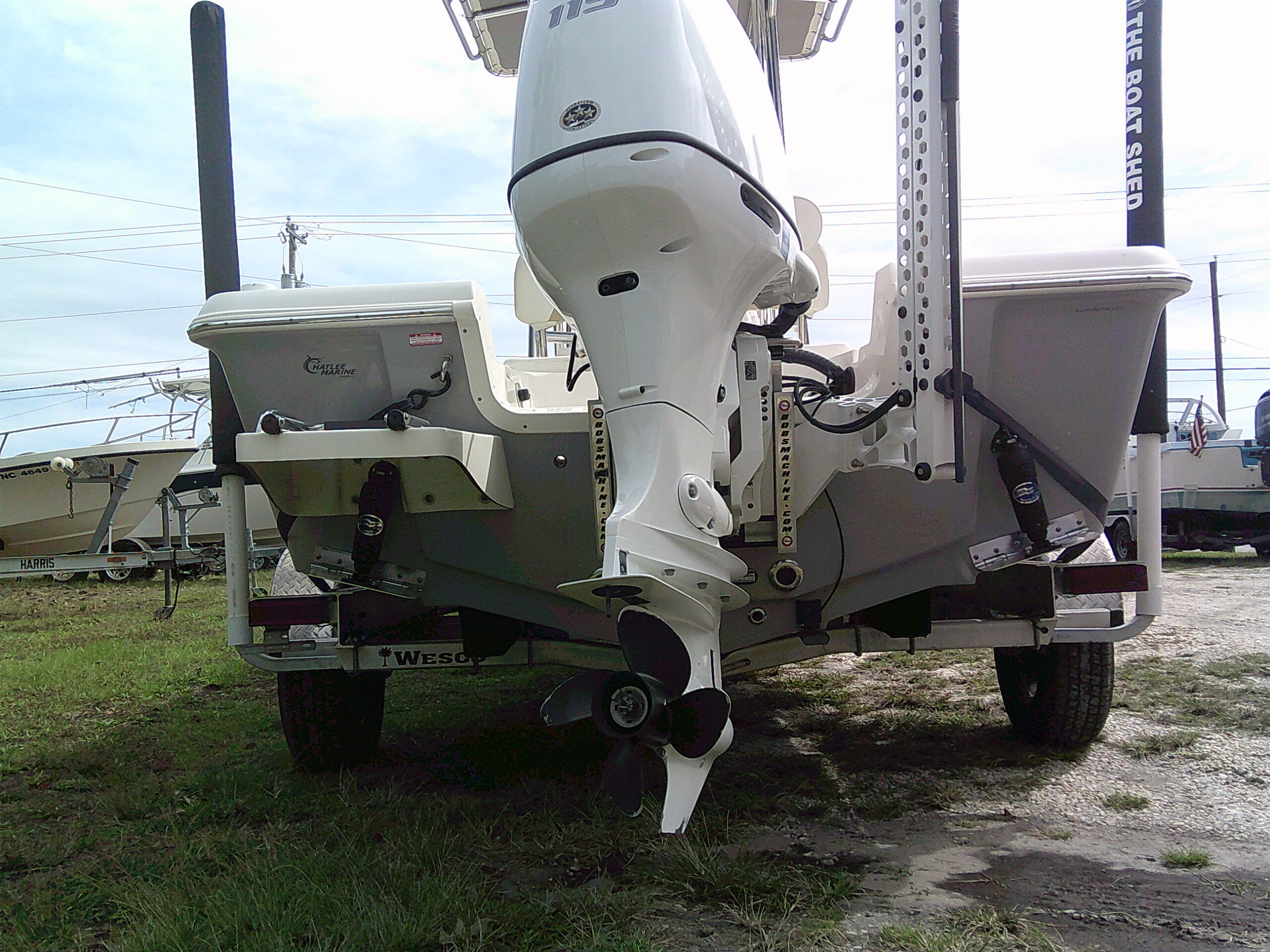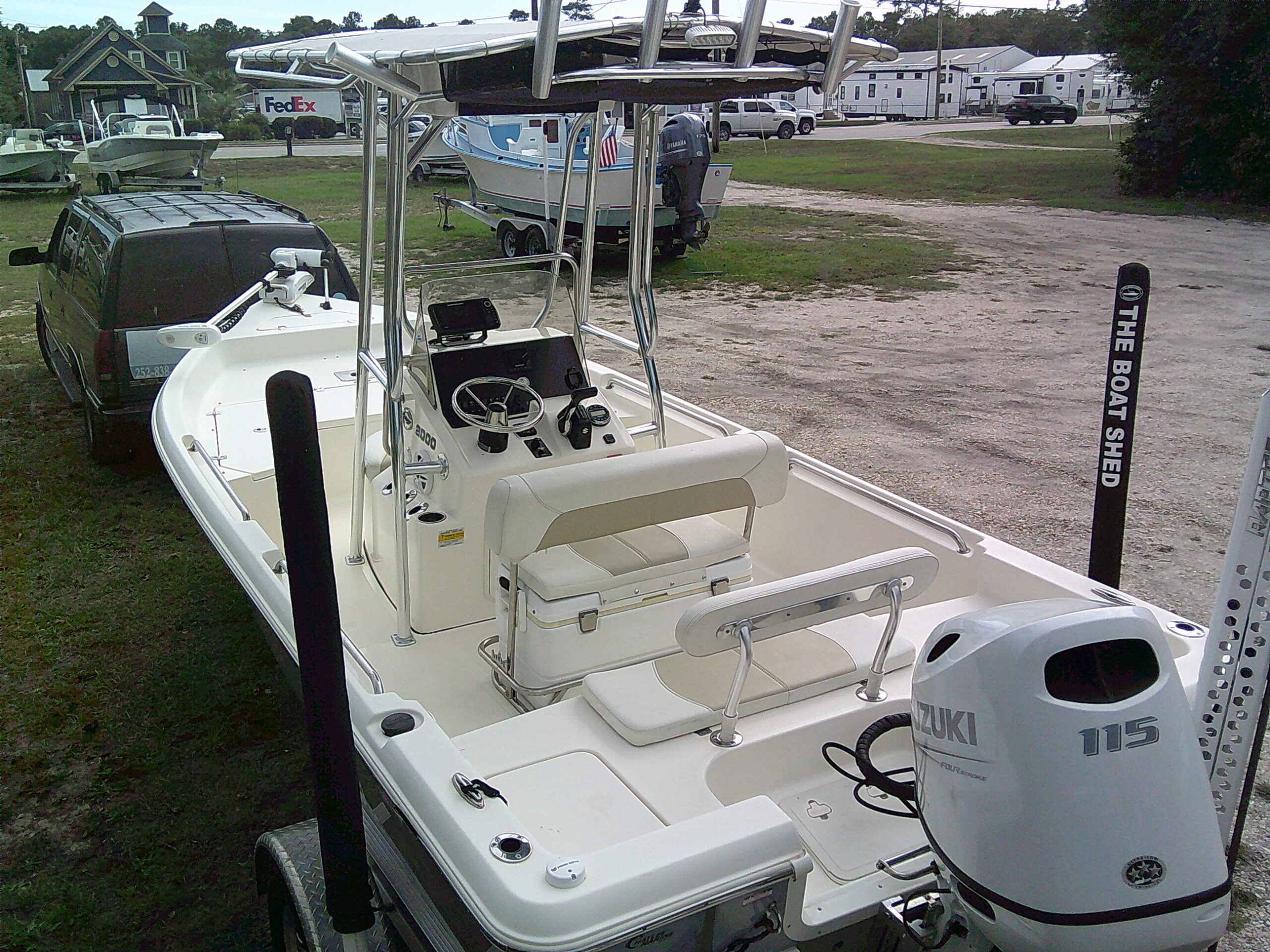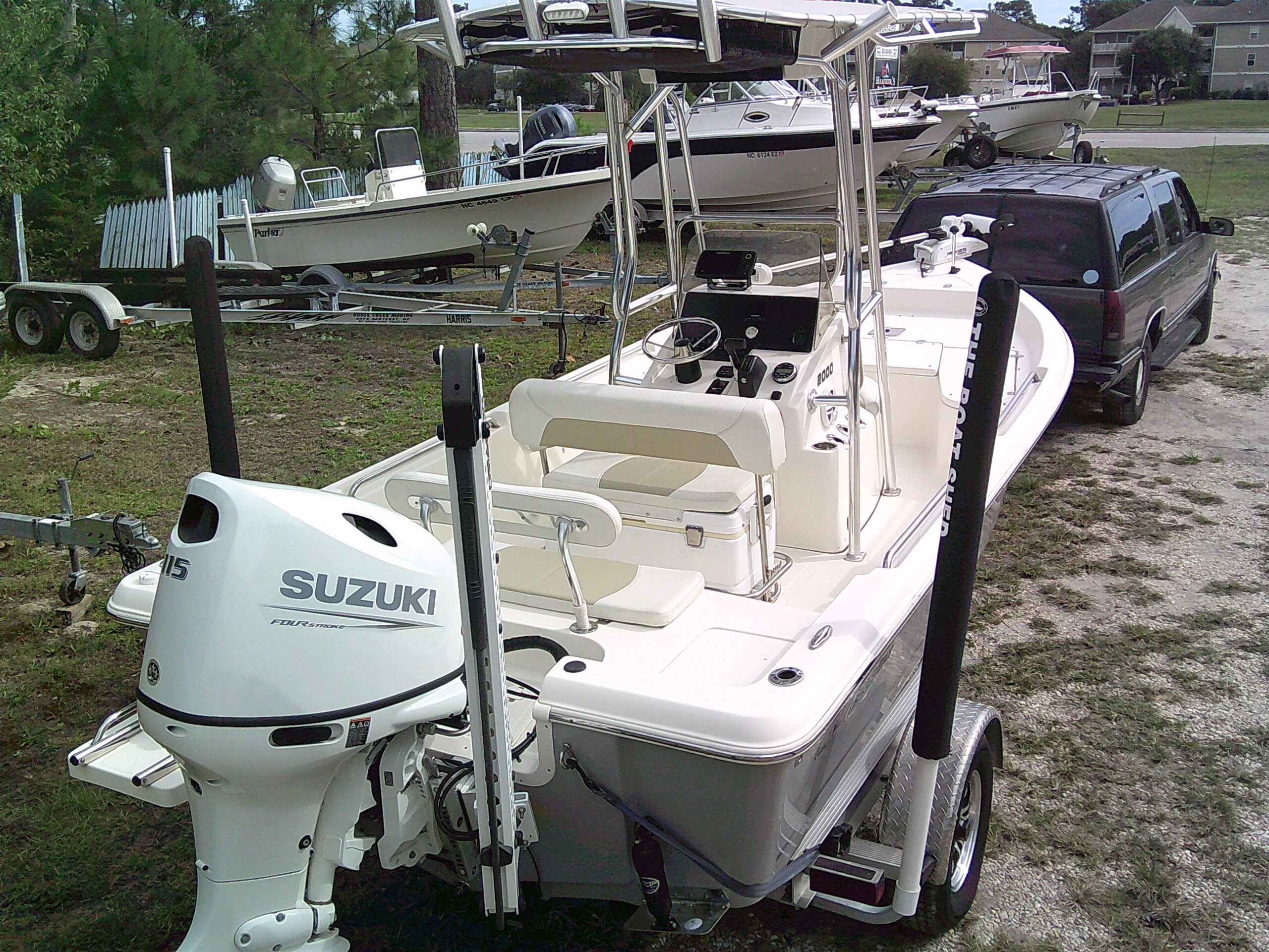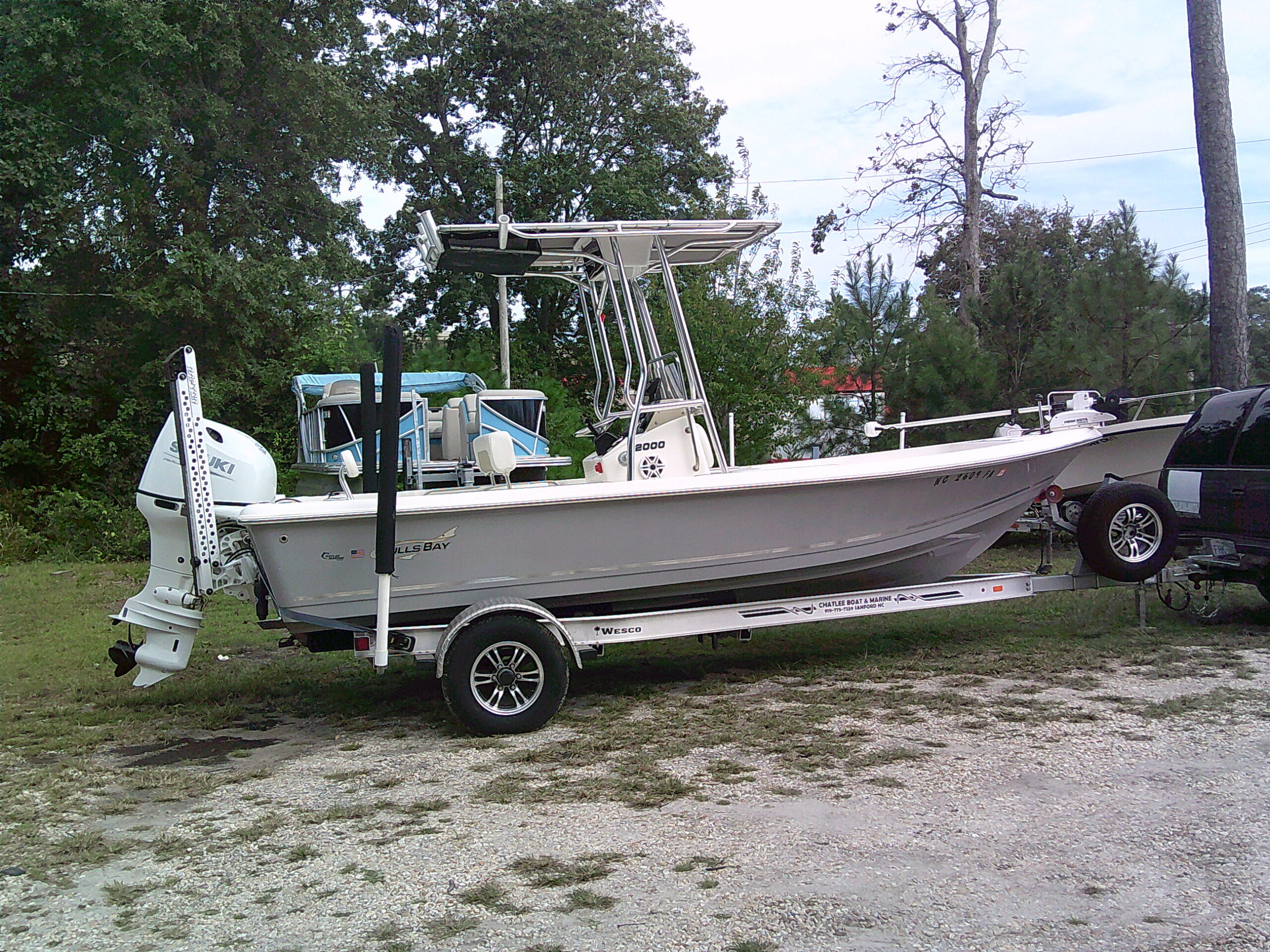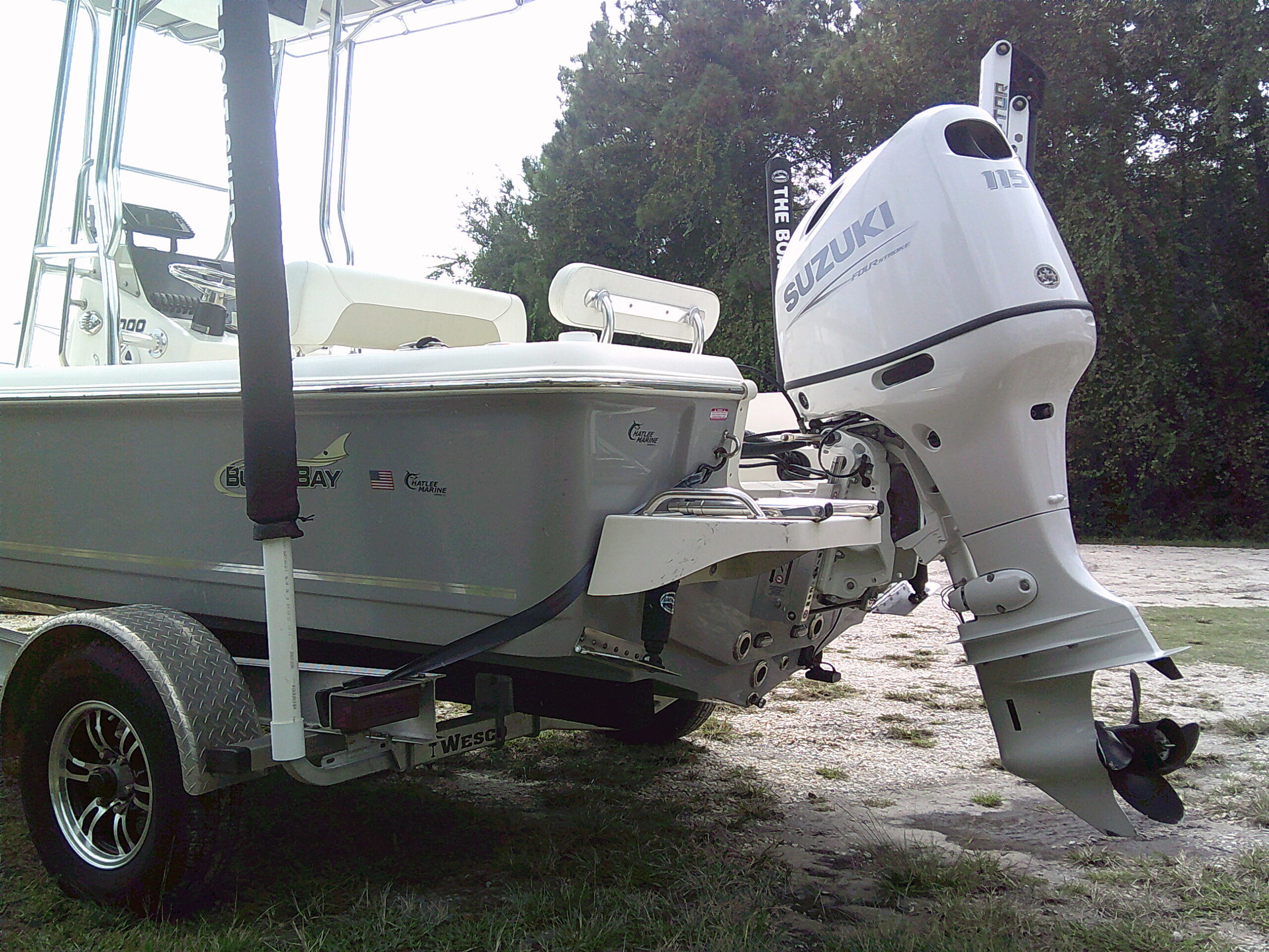 Vessel Info: Large Cushioned Forward Platform, Perfect for Throwing a Cast Net, Fishing or Sunning / Pop Up Cleats / Anchor Locker w/Anchor, Chain, Line / Minn Kota Terrova Trolling Motor, 24 Volt, 80 Lbs. Thrust / 3 Large Storage Boxes / Forward of Console Cushioned Seat/Cooler w/Back Rest / T-Top w/Electrical Box Forward and Aft Spreader Lights / Grab Rails, 6 Rod Holders, T-Bag / Console w/Wind Screen, Grab Rails, Gauges, Controls, Switch Panel, Stainless Steel Helm w/Hydraulic Steering, Storage, 6 Side Rod Holders, 2 Speakers, 2 Cup Holders / Cushioned Helm Bench Seat w/Swing Back Rest, Cooler / Gunnel Grab Rails / 2 Speakers / Large Cushioned Aft Platform w/Storage / Large Live Well / Removable Cushioned Back Rest / 4 Rod Holders / Self Bailing Deck / Minn Kota Raptor Anchor Pole w/Auto Adjust / 2 Batteries w/Switch / Under Water Lights / Jack Plate / Trim Tabs / Swim Platform w/Folding Ladder