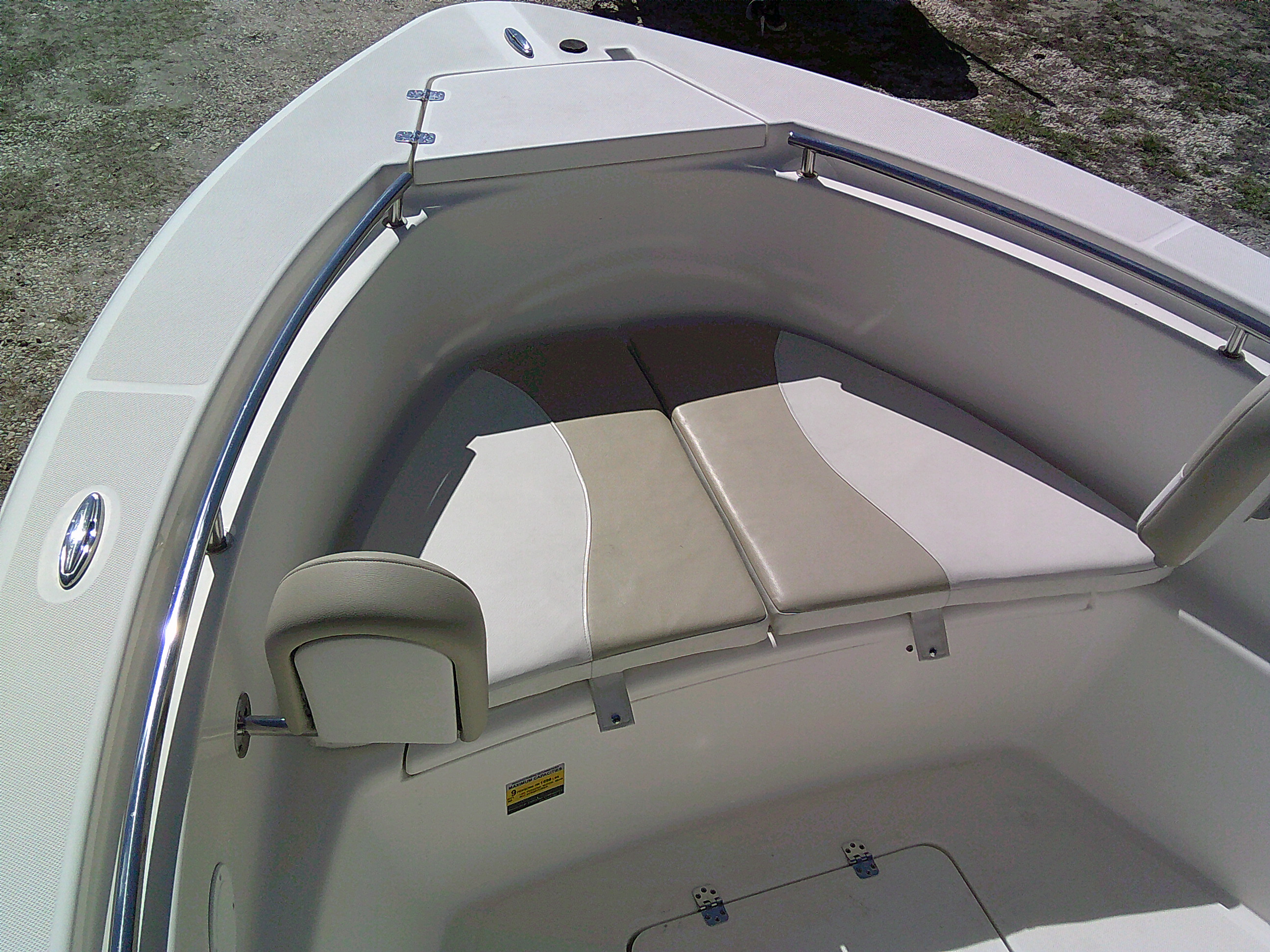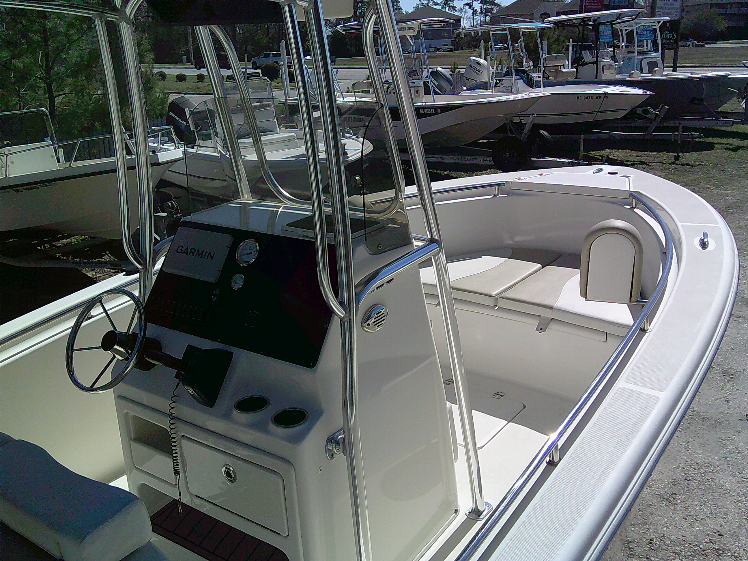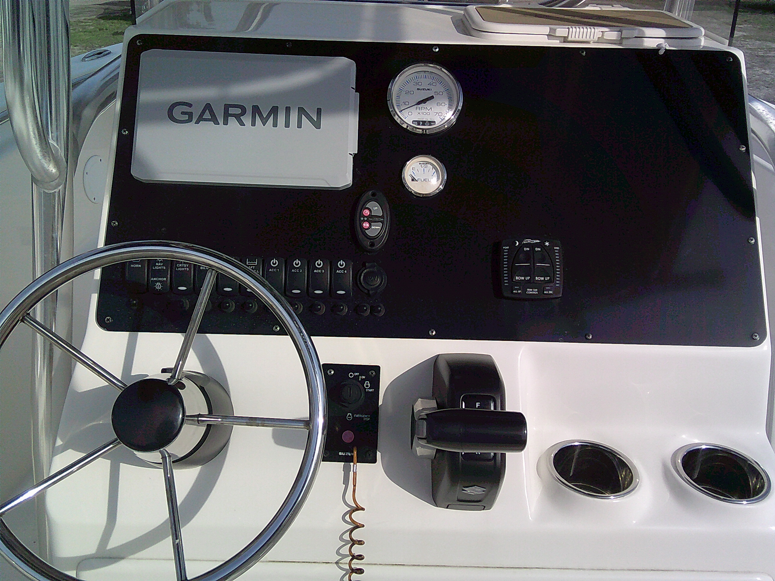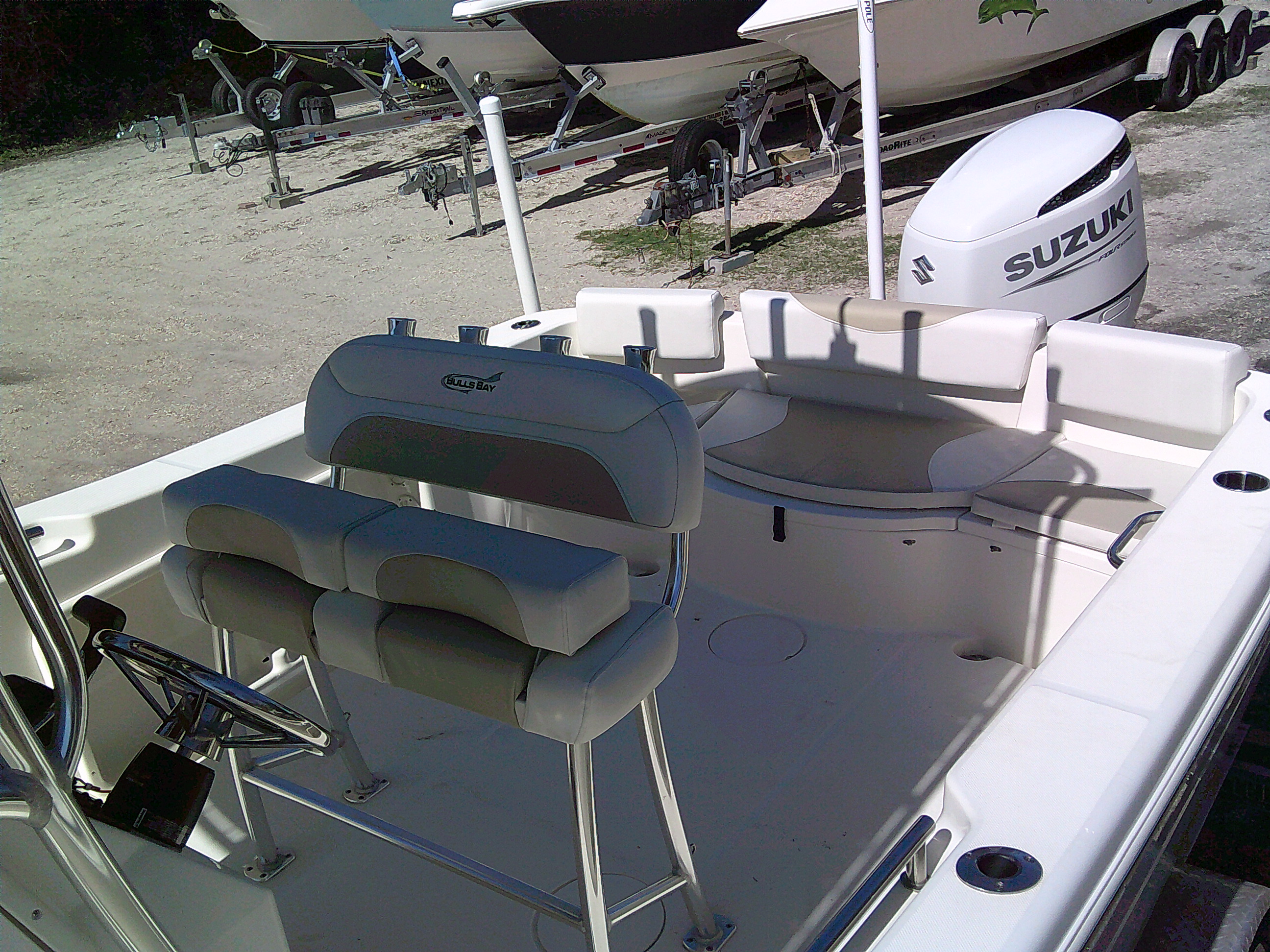 Vessel Info: Bow Deck w/Anchor Locker, Pop-Up Cleats / Cushioned Forward Seating w/Removable Back Rest, Grab Rails, Storage / Large in Deck Storage/Fish Box / Forward of Console Cushioned Folding Seat w/Back Rest / T-Top w/Electrical Box Forward and Aft Spreader Lights, Grab Rails, 6 Rod Holders / Console w/Wind Screen, Grab Rails, Gauges, Controls, Switch Panel, Stainless Steel Helm w/Hydraulic Steering, Console Storage Large enough for a Porty Potty, 2 Cup Holders, Foot Rest / Cushioned Leaning Post w/Folding Bolsters, Back Rest, 4 Rod Holders, Cooler Storage / 4 in Gunner Rod Holders / Under Gunner Rod Storage / Cushioned Aft Seating w/Back Rest, Storage, Live Well, Cup Holders, Grab Rails / Self Bailing Deck / 2 Batteries w/Switch / RAW Water Wash Down / Aft Platform w/Swim Platform, Folding Swim Ladder / Blade Power Pole / Trim Tabs