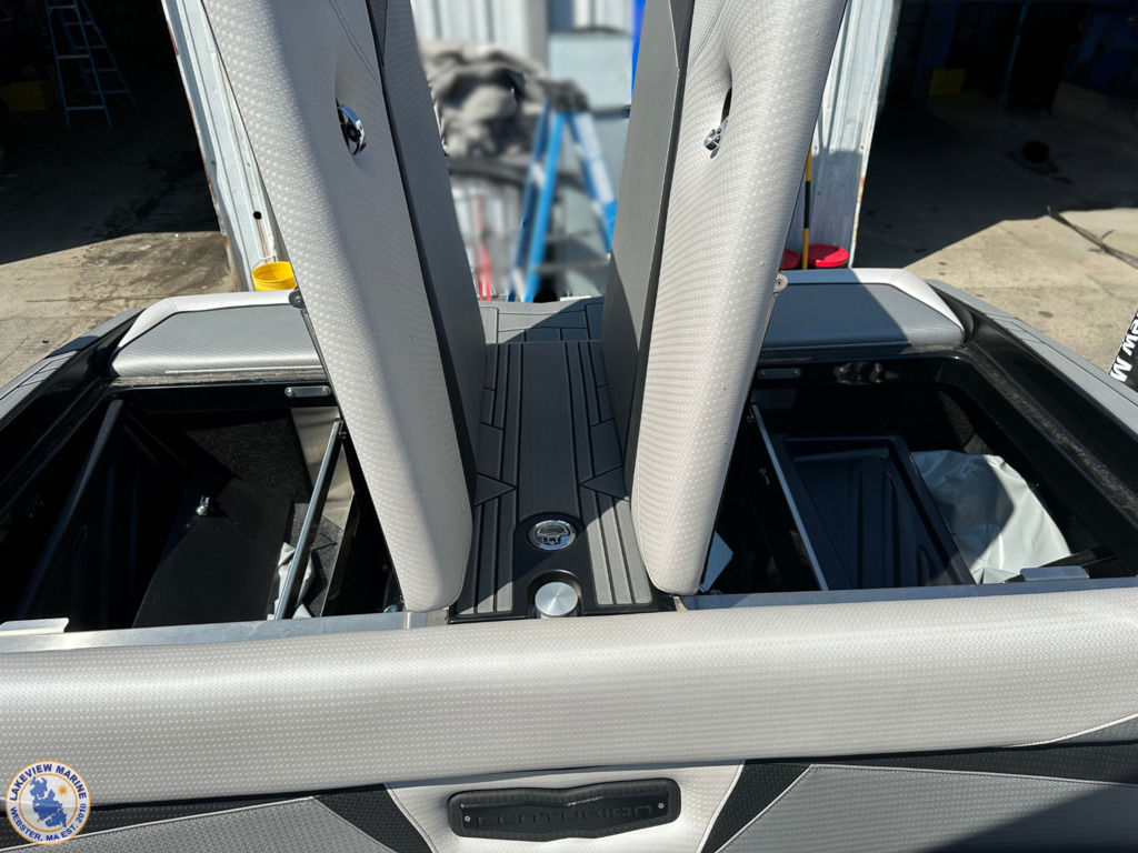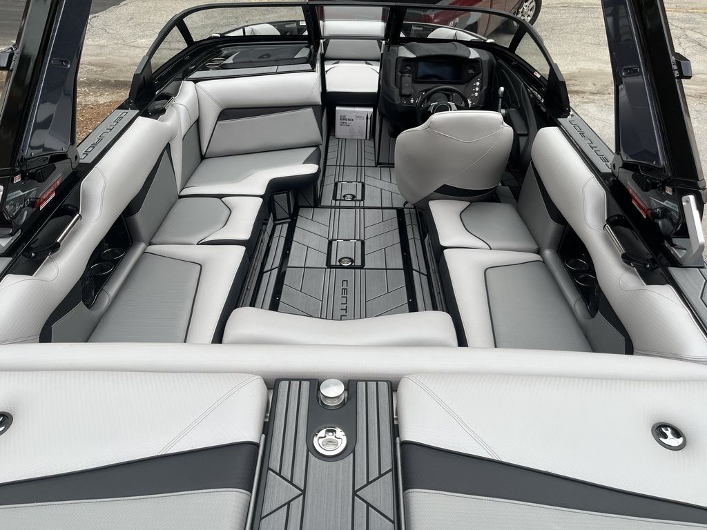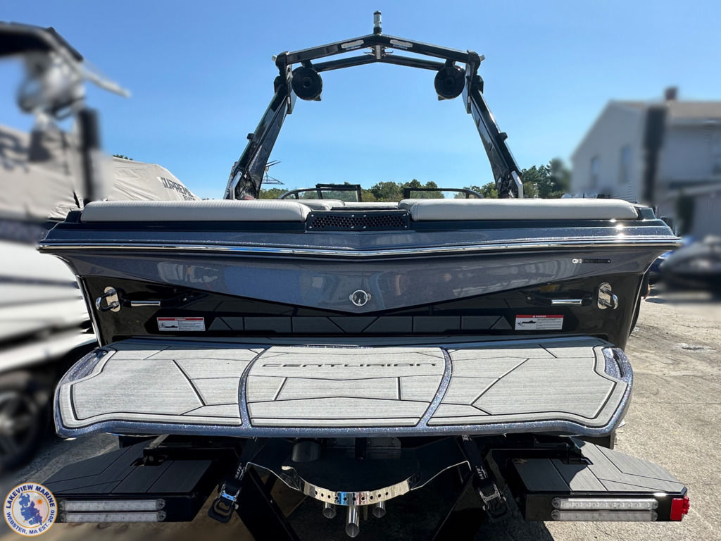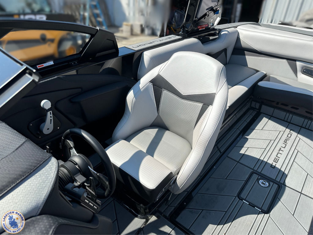 Centurion’s Vi22 extends a nod toward nostalgia with its slightly retro style, while delivering unprecedented performance for today’s wake surfers. Built on the Opti-V Hull, this sleek beauty offers more displacement with less ballast and is balanced in and behind the boat thanks to the optimized running surface. Even with 4600 pounds of available ballast, the lower profile Vi22 sits comfortably above the water without the risk of taking on water over the transom or bow when encountering professional-level surf waves. RAMFILL is available to fill and drain the subfloor ballast quickly, so more than half the ballast can be filled in just 90 seconds. Quick- Launch gets this 22-footer to plane in just six seconds.