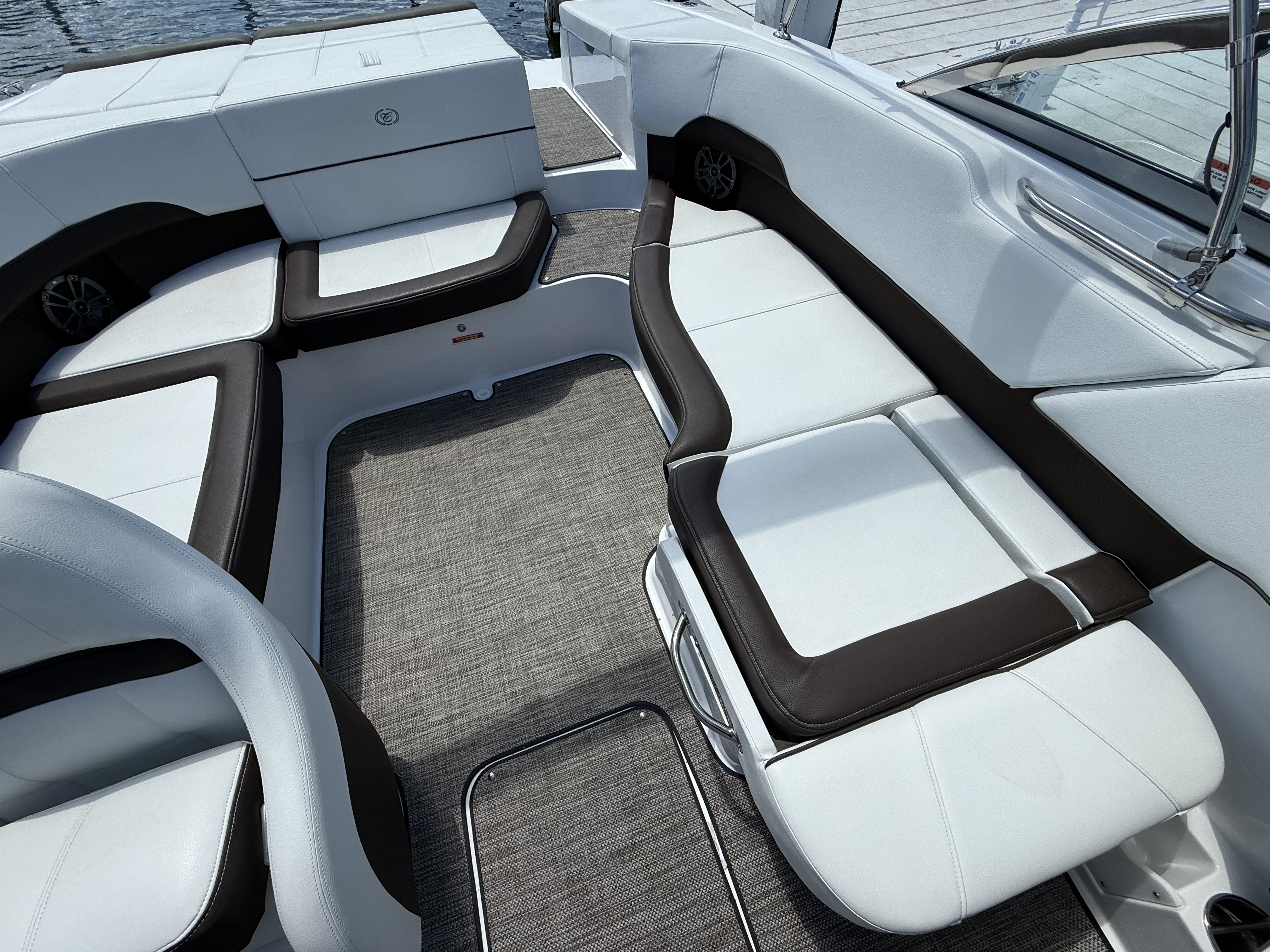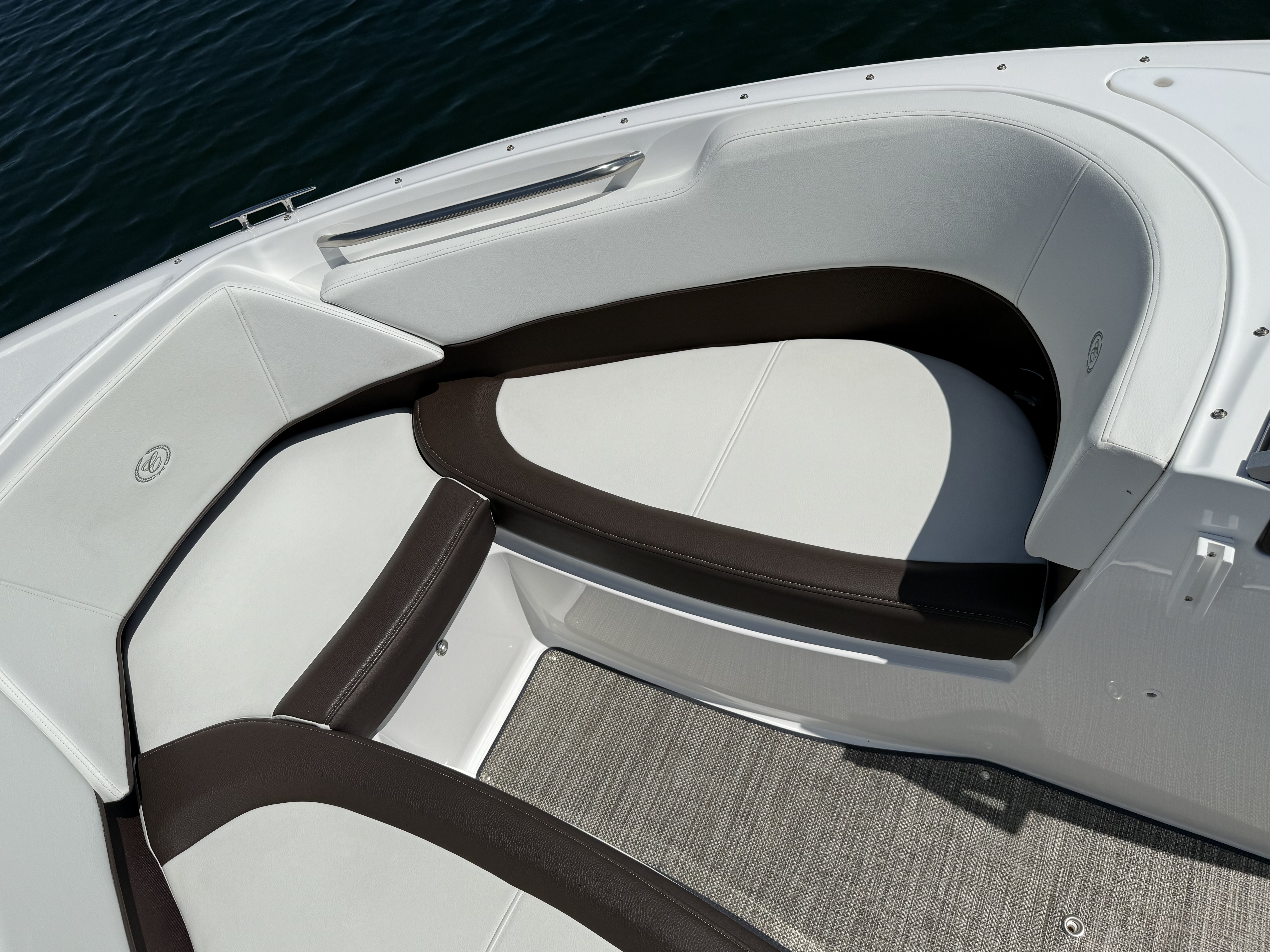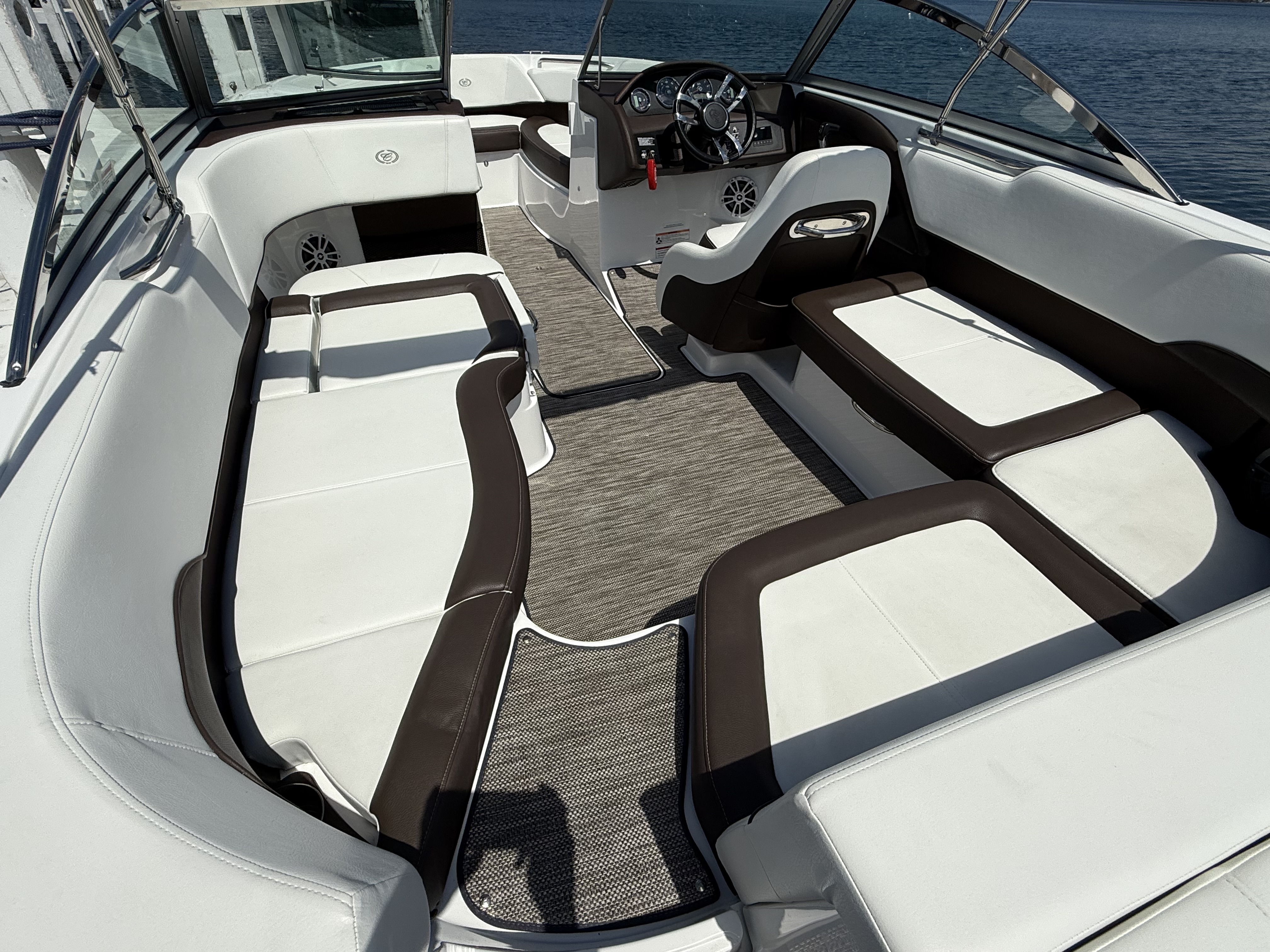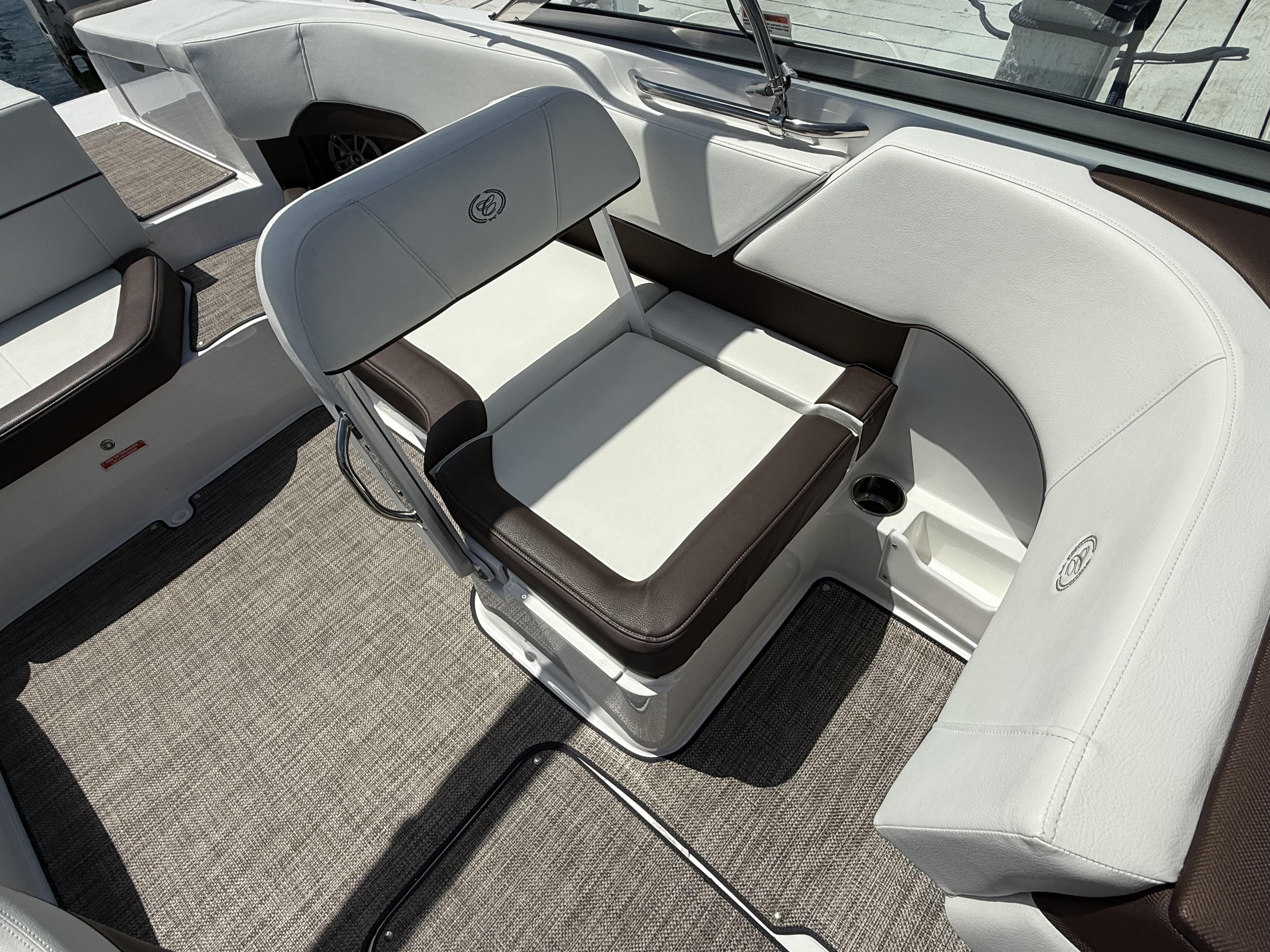 This boat comes loaded with premium upgrades, including a Bimini top for sun protection, bow and cockpit tonneau covers for all-weather shielding, a flip-down swim step for effortless water access, and sea grass floor covering for a sleek, comfortable interior. A flagpole with flag adds a classic touch, while the dual battery switch with ACR ensures reliable power whenever you need it.