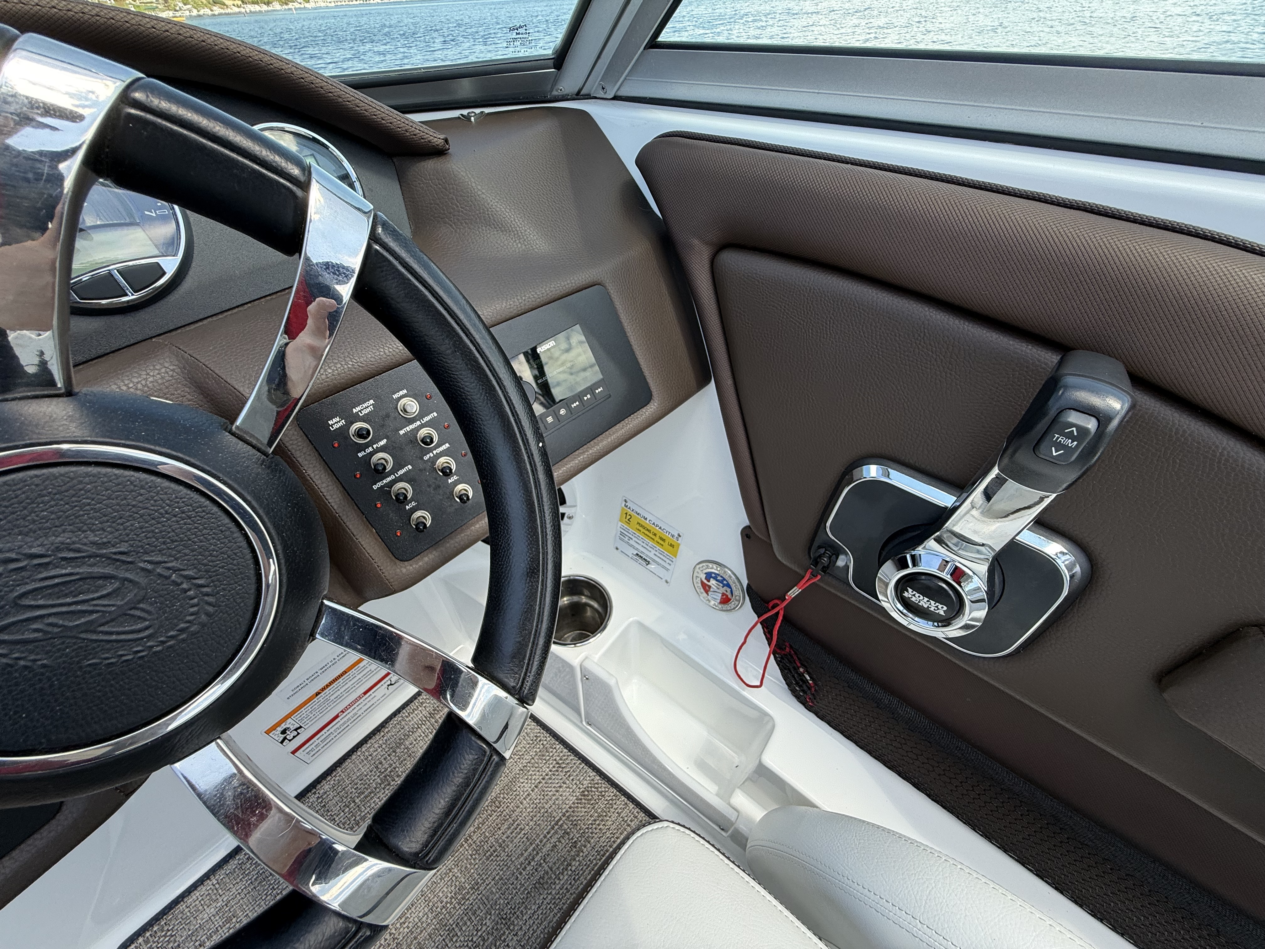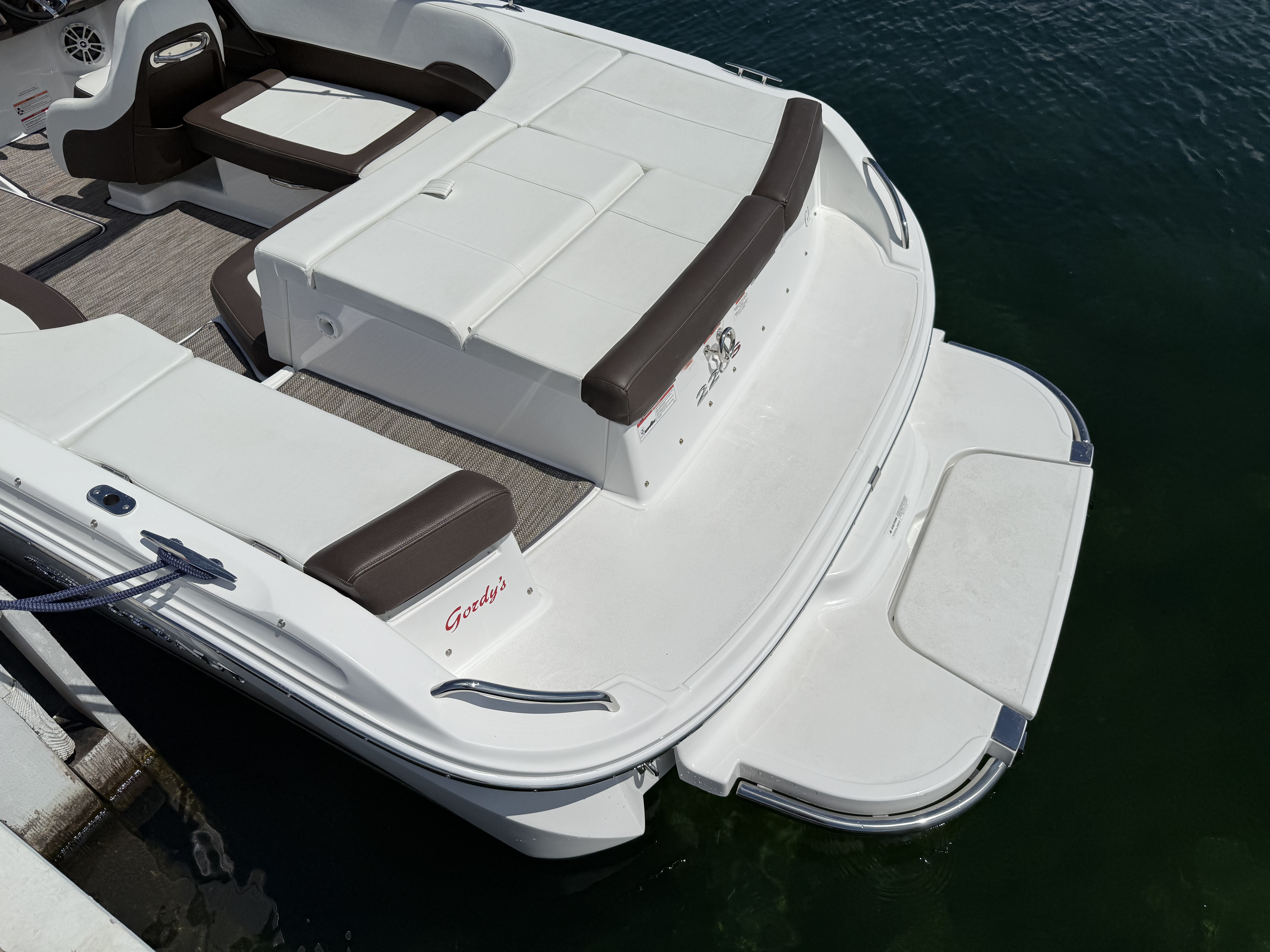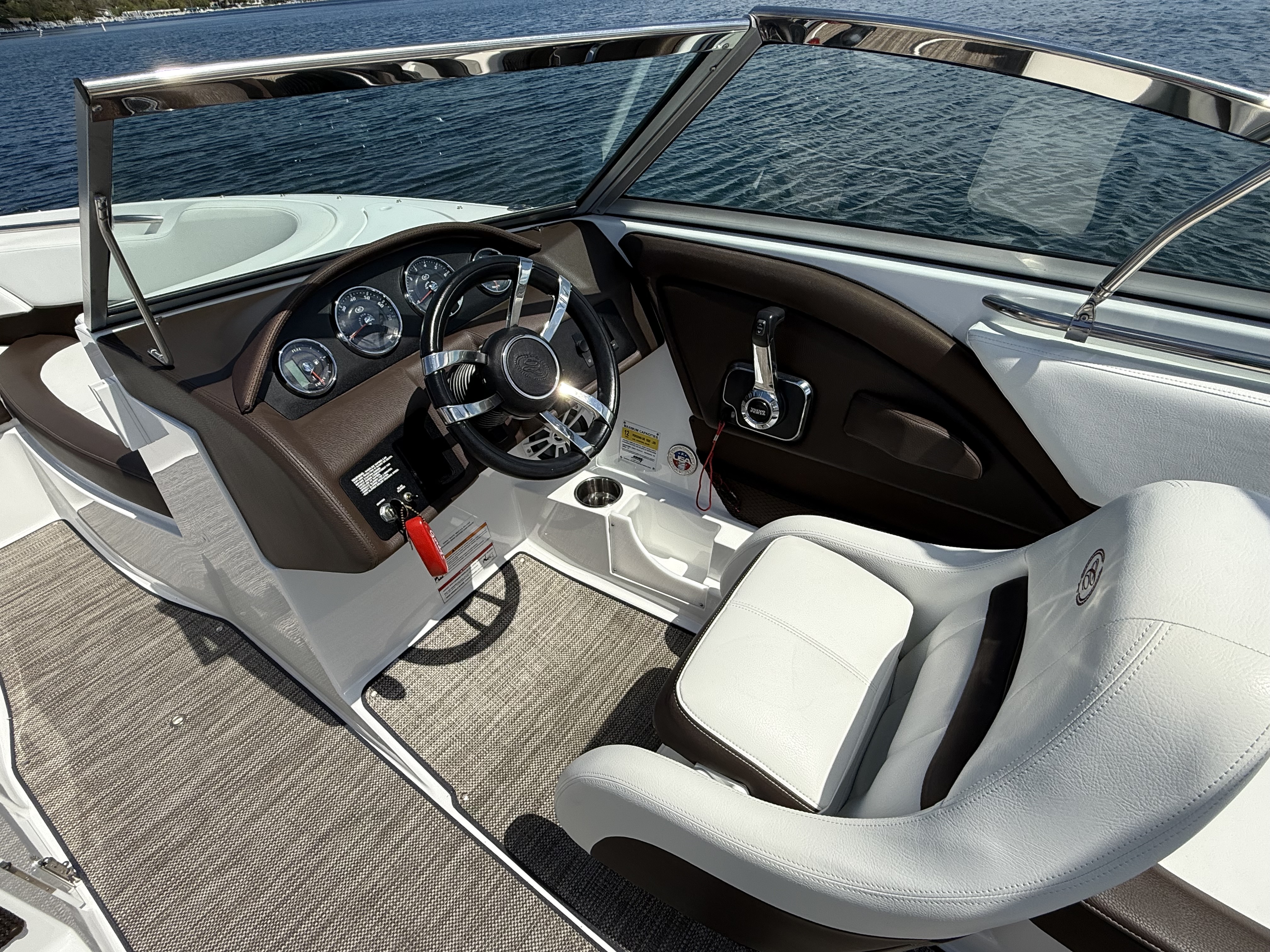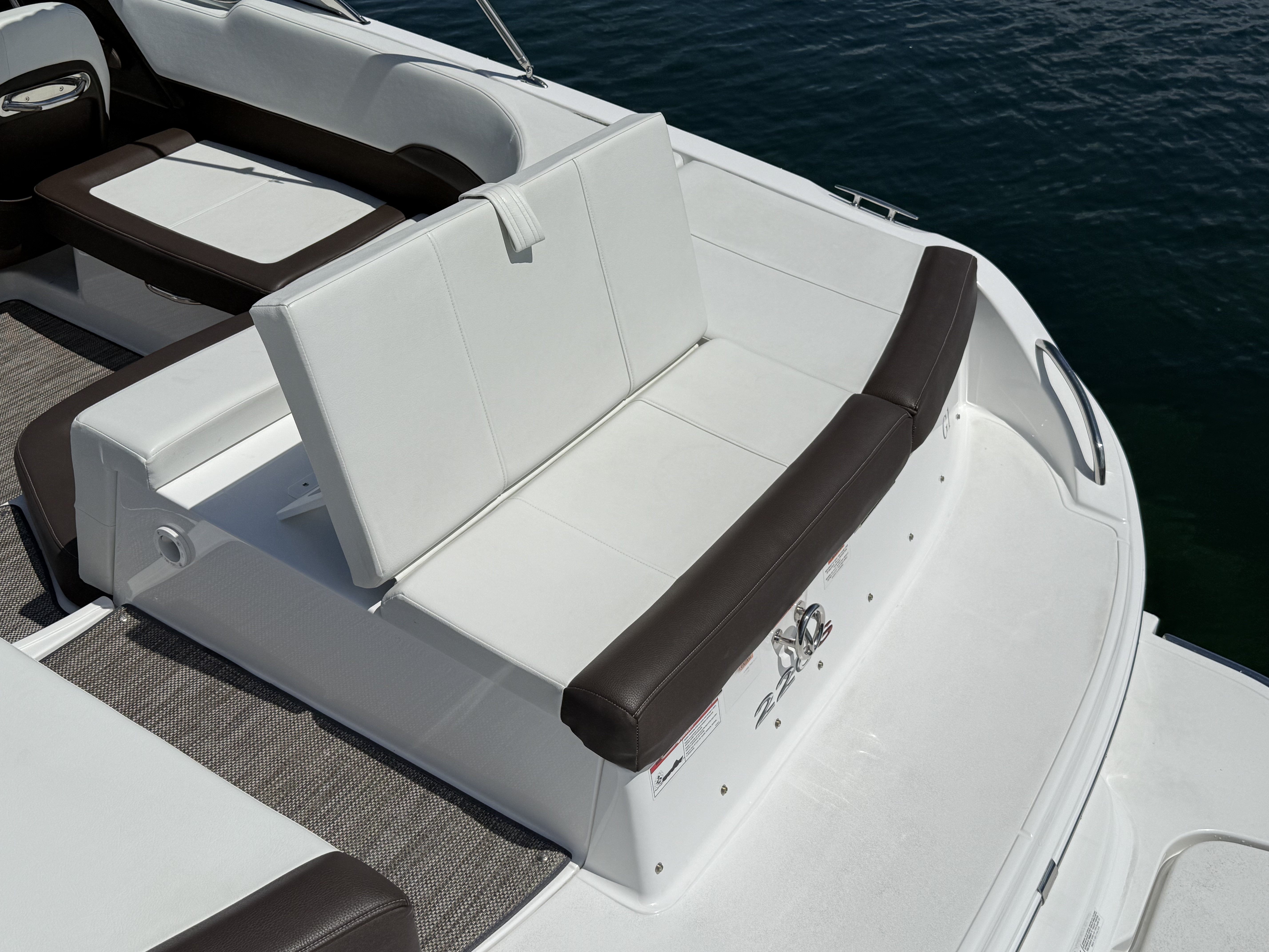 This boat comes loaded with premium upgrades, including a Bimini top for sun protection, bow and cockpit tonneau covers for all-weather shielding, a flip-down swim step for effortless water access, and sea grass floor covering for a sleek, comfortable interior. A flagpole with flag adds a classic touch, while the dual battery switch with ACR ensures reliable power whenever you need it.