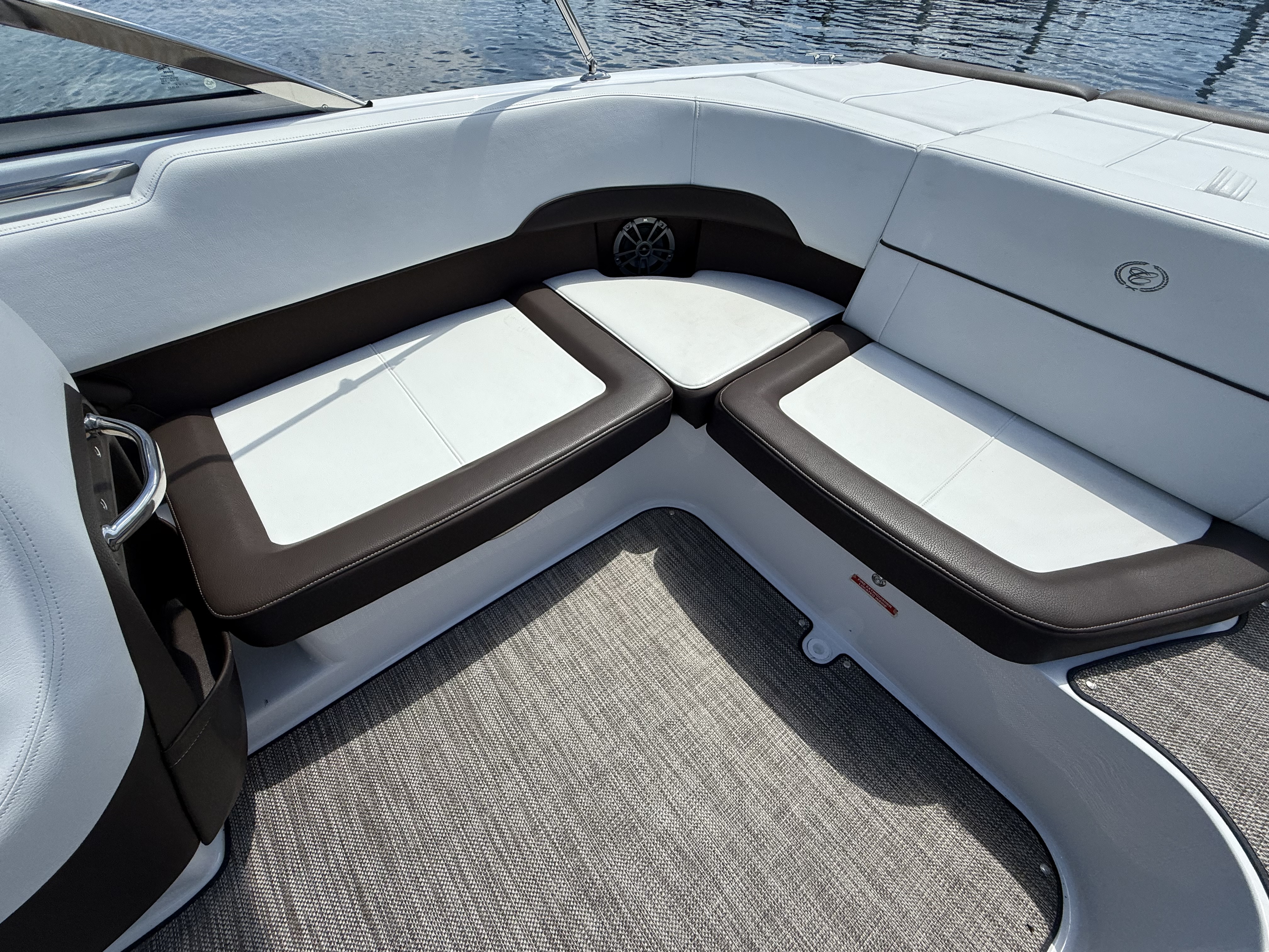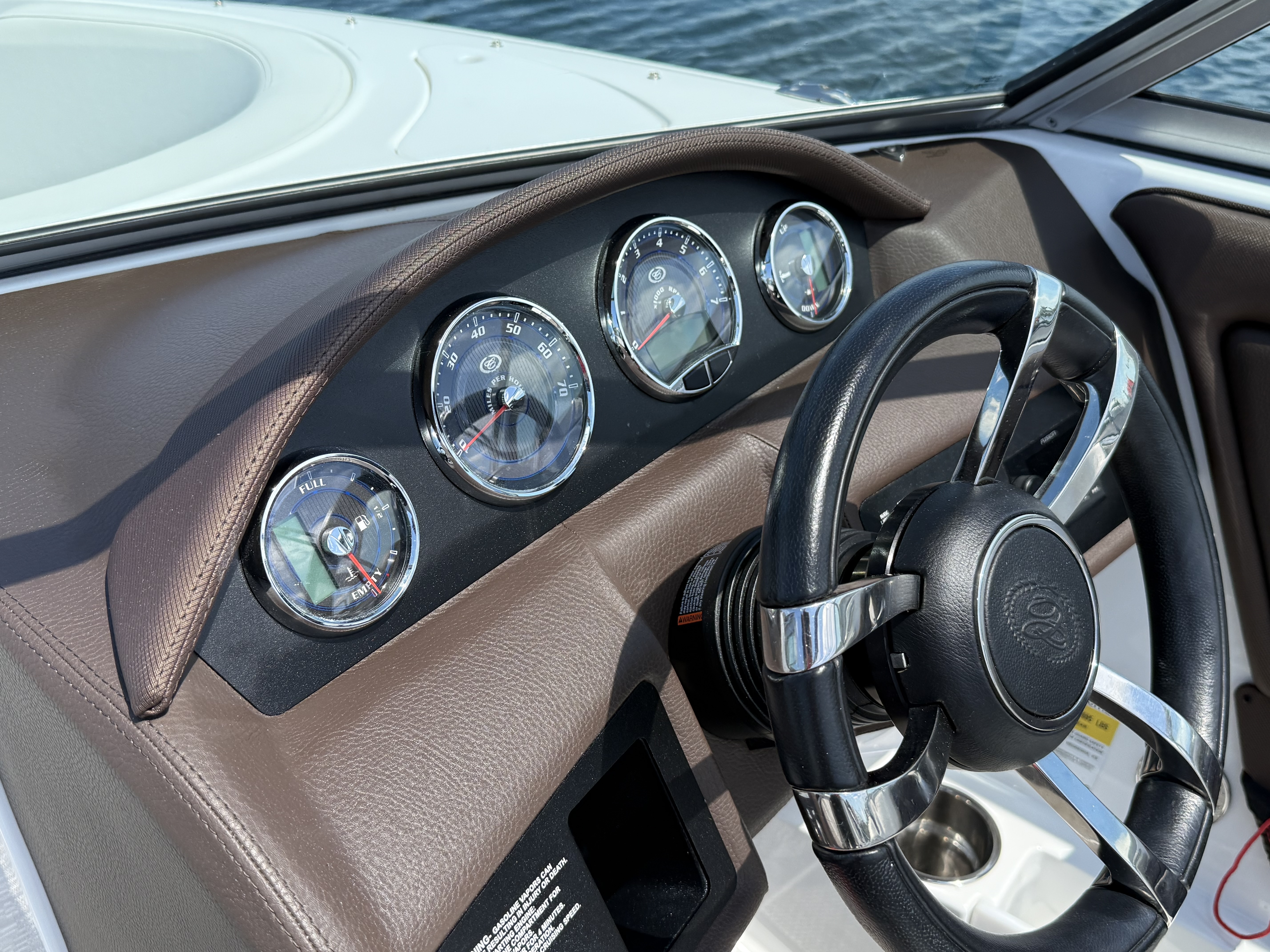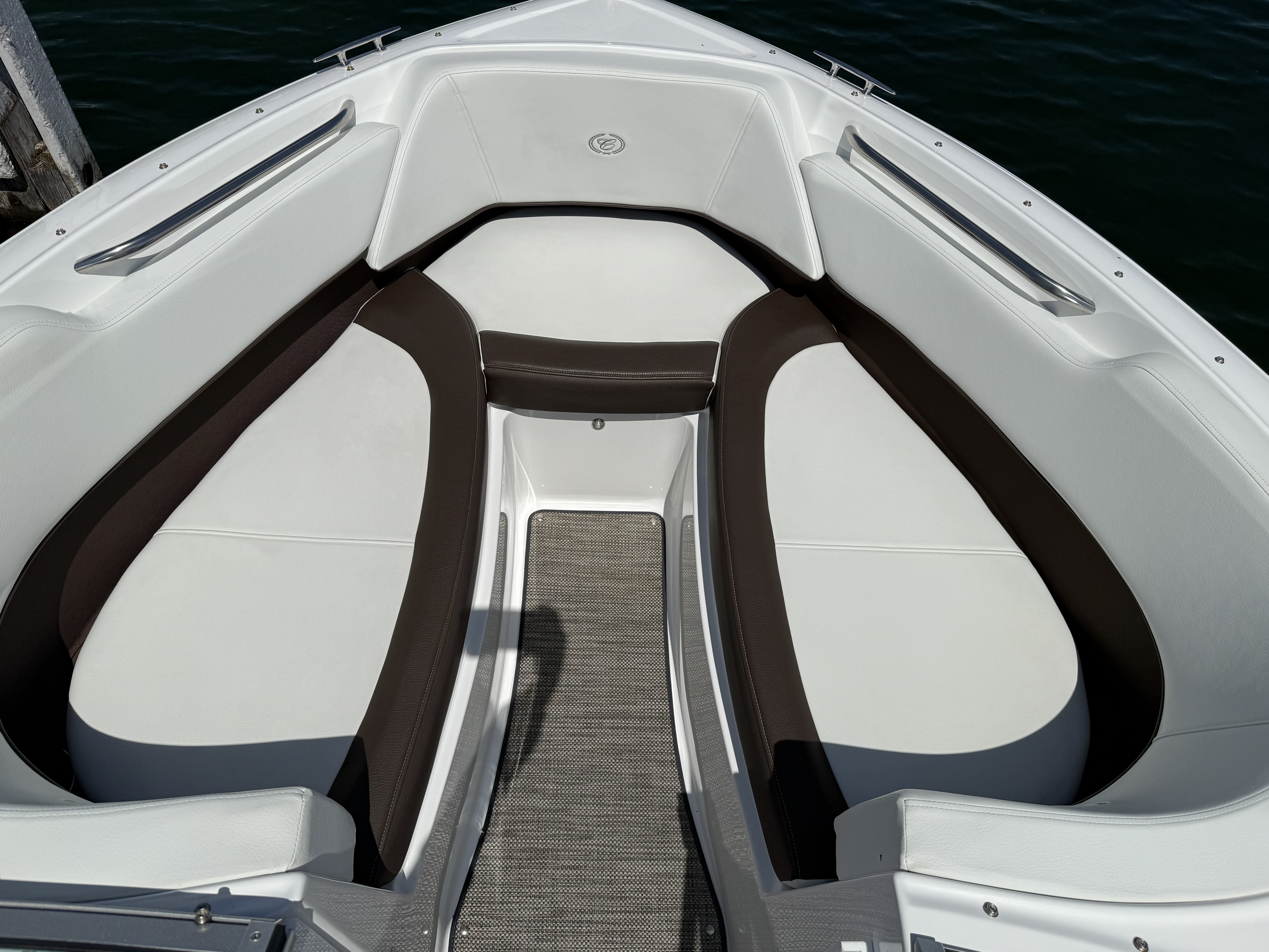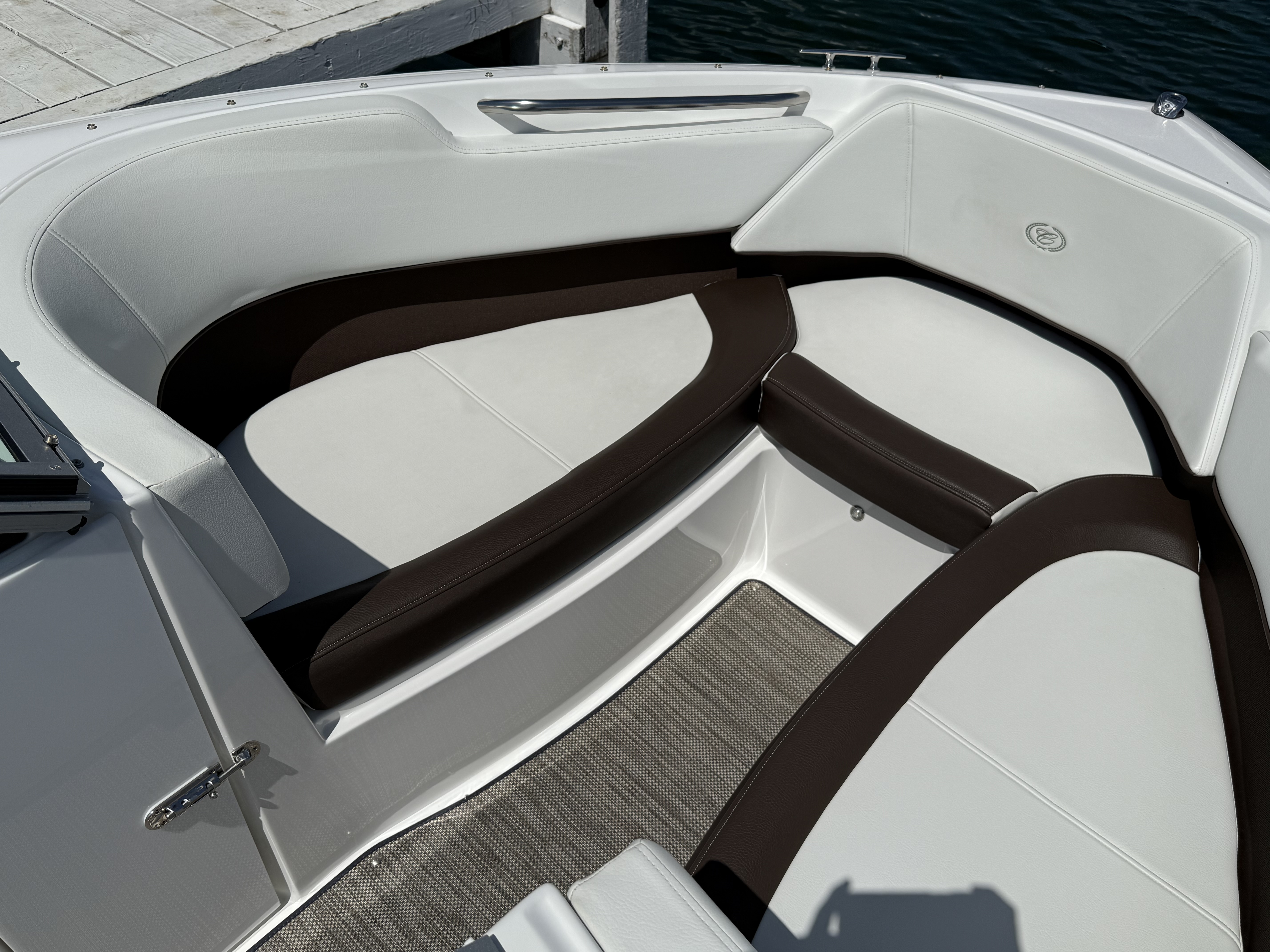 This boat comes loaded with premium upgrades, including a Bimini top for sun protection, bow and cockpit tonneau covers for all-weather shielding, a flip-down swim step for effortless water access, and sea grass floor covering for a sleek, comfortable interior. A flagpole with flag adds a classic touch, while the dual battery switch with ACR ensures reliable power whenever you need it.