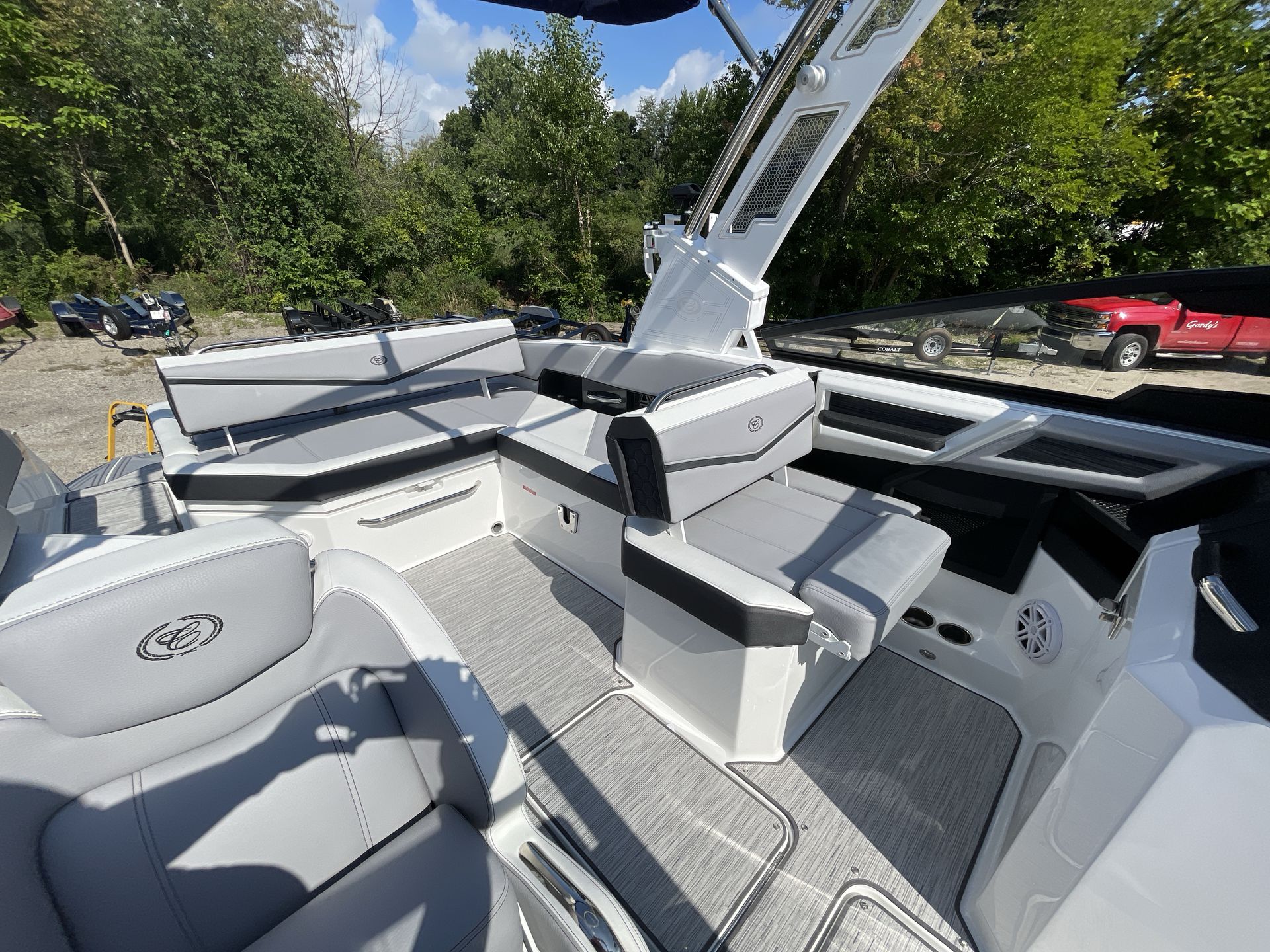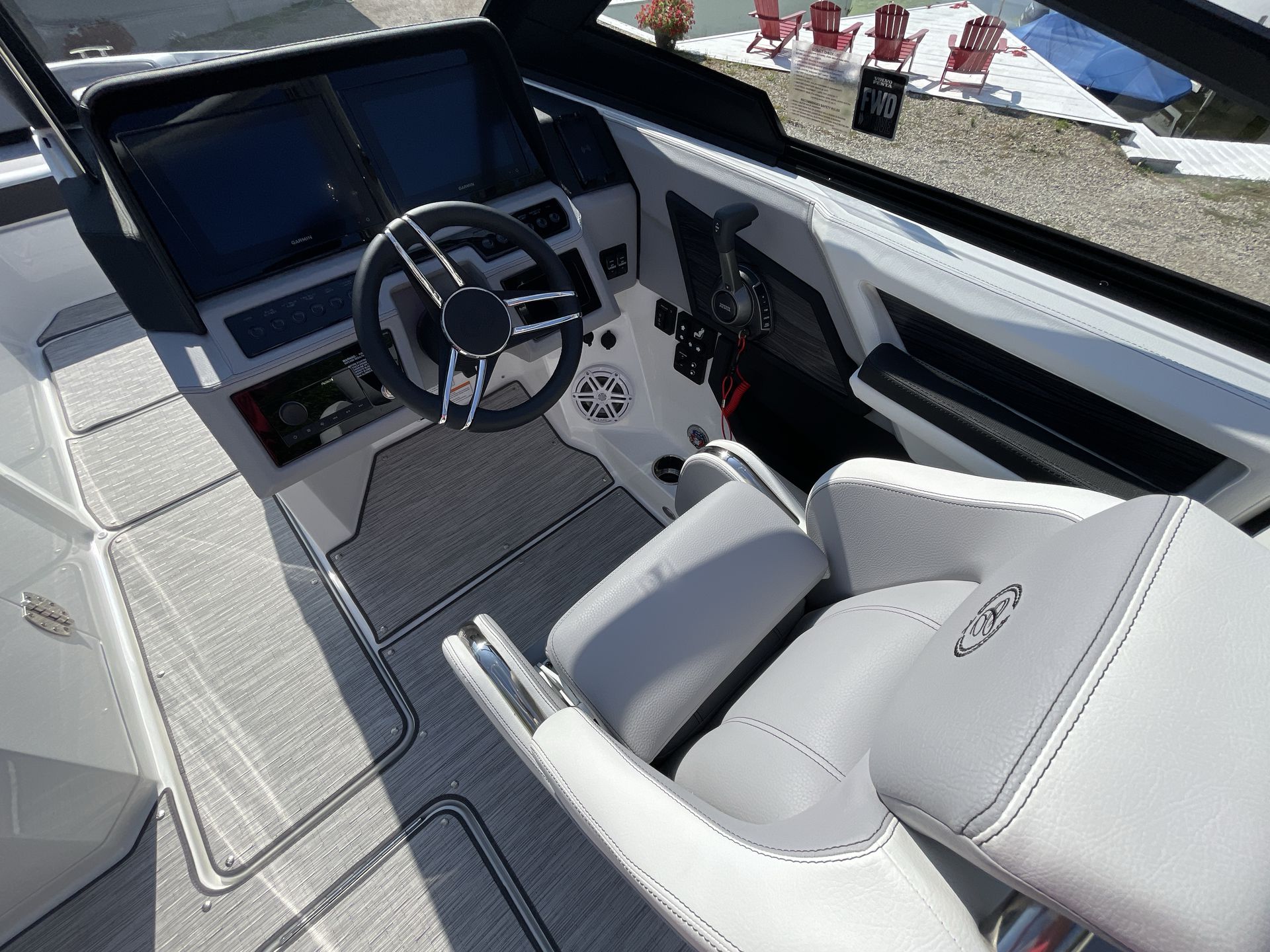 Step inside and you'll find a luxurious Summit and Frost interior that is both comfortable and stylish. The glass cockpit features dual Garmin screens, providing you with all the information you need to navigate the waterways with ease. And with the wireless phone charger with holder, you can stay connected while on the go.