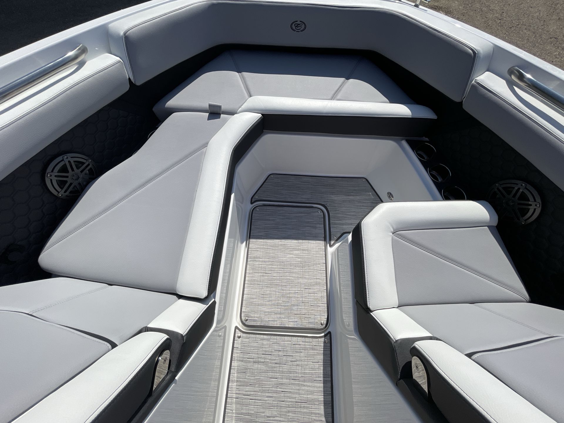 But the fun doesn't stop there. The R6 Surf also features a premium sound system with transom speakers, allowing you to enjoy your favorite music while out on the water. The trim tabs and windlass all chain anchor provide added safety and control.