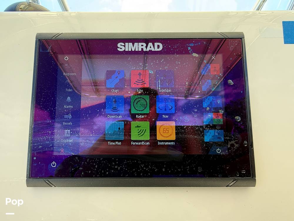 For cruising and convenience, the boat also has a sturdy T-top for shade, a Simrad navigation display, VHF radio, a MercMonitor engine display, trim tabs for smooth handling, and a Boss Audio stereo system with speakers. You'll also find a swim platform with a ladder and ample storage compartments throughout the bow area, making it easy to keep your gear organized and your deck clutter-free.