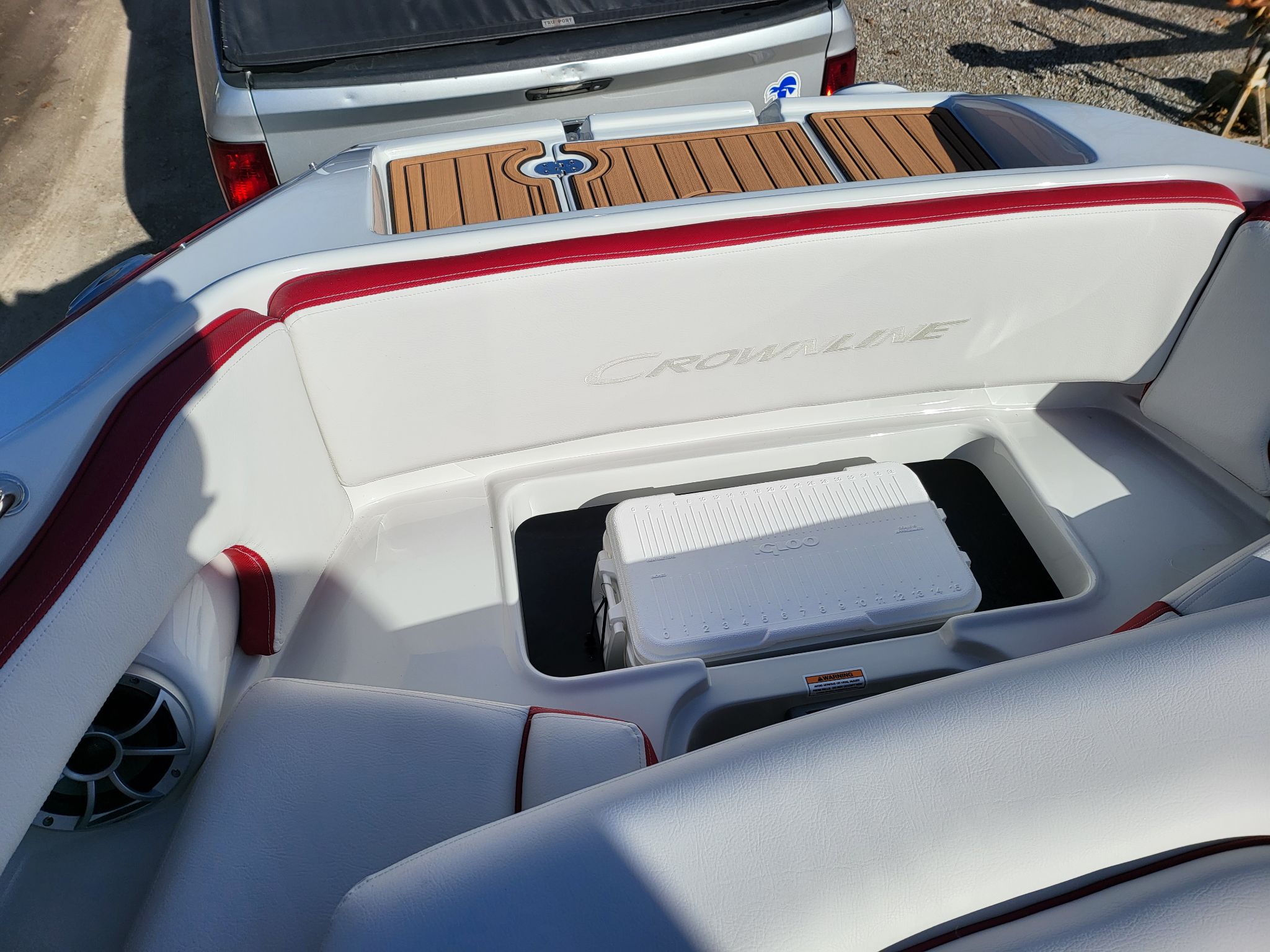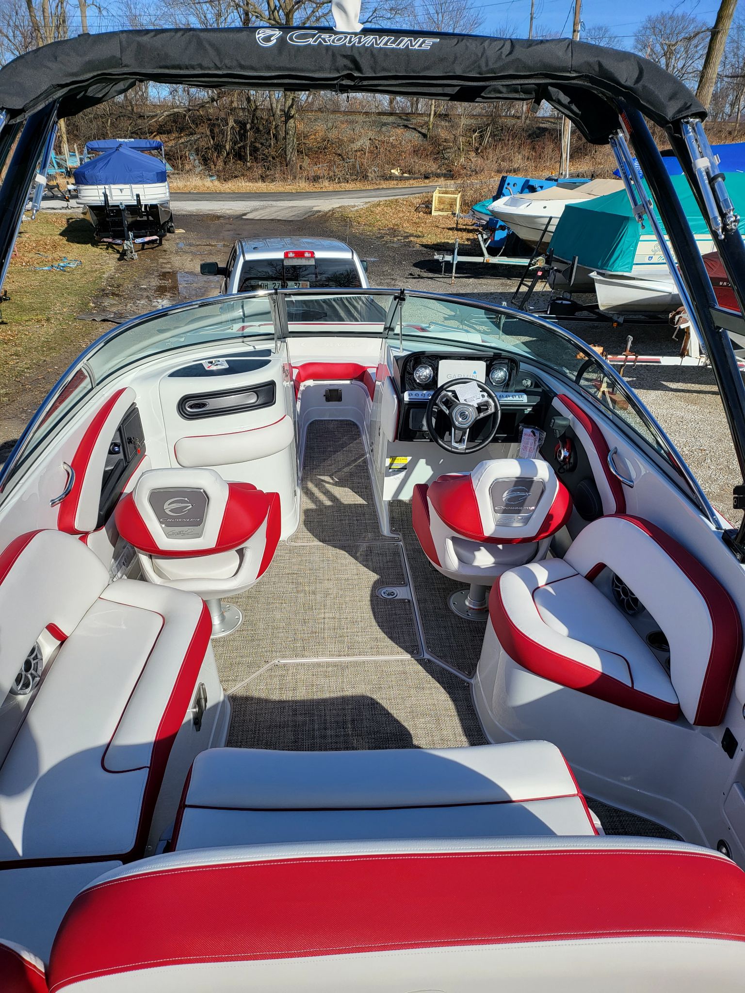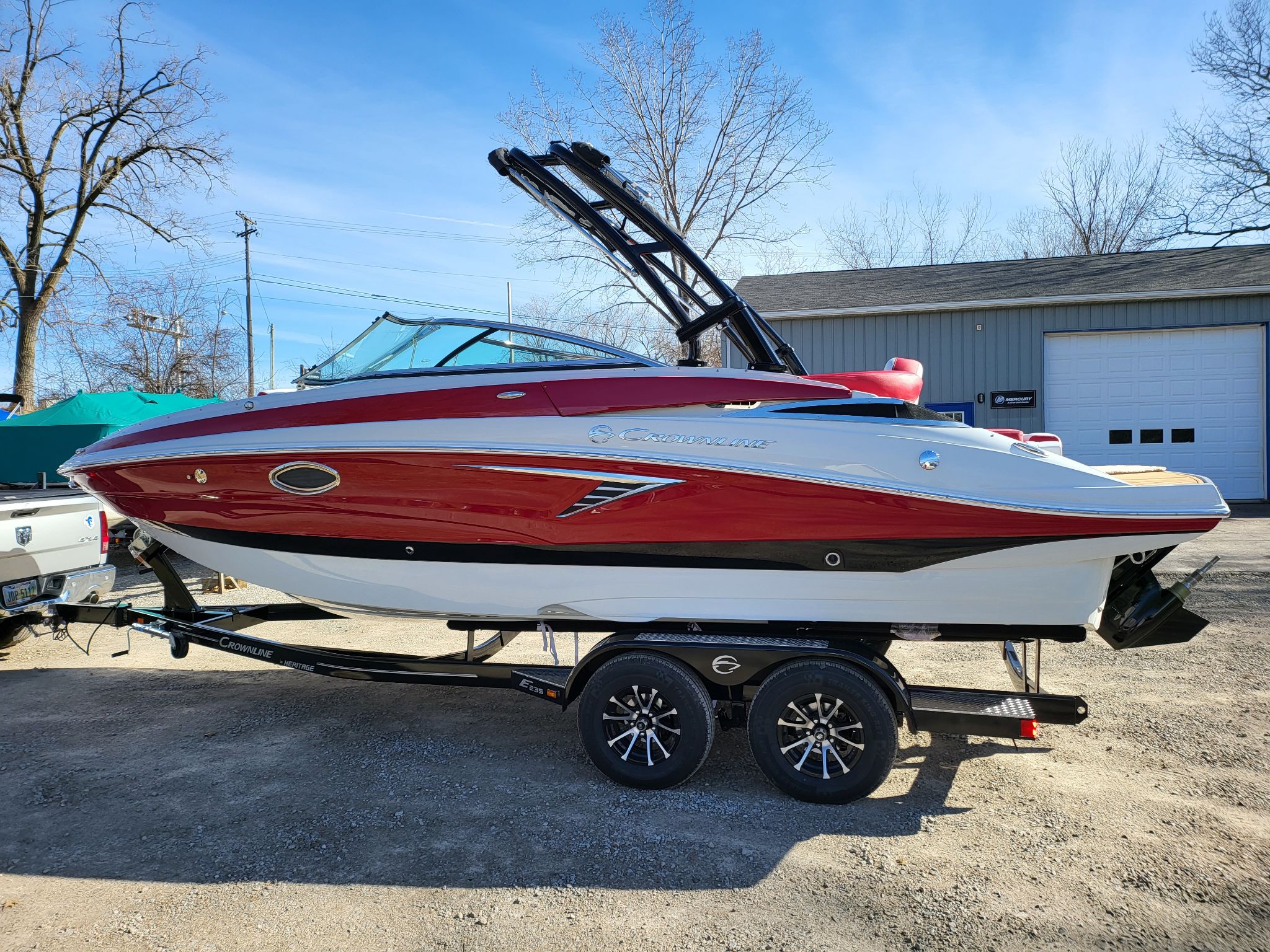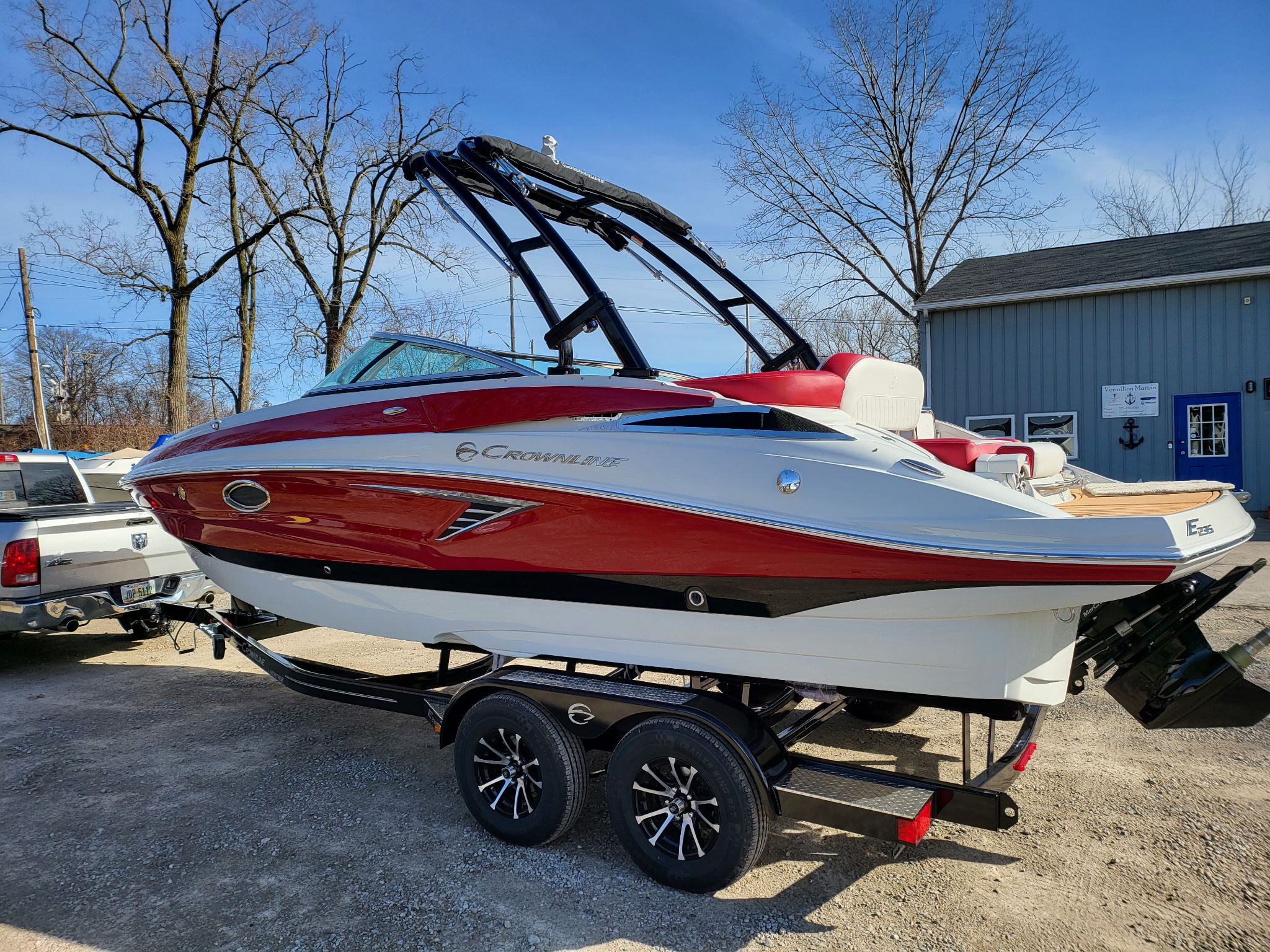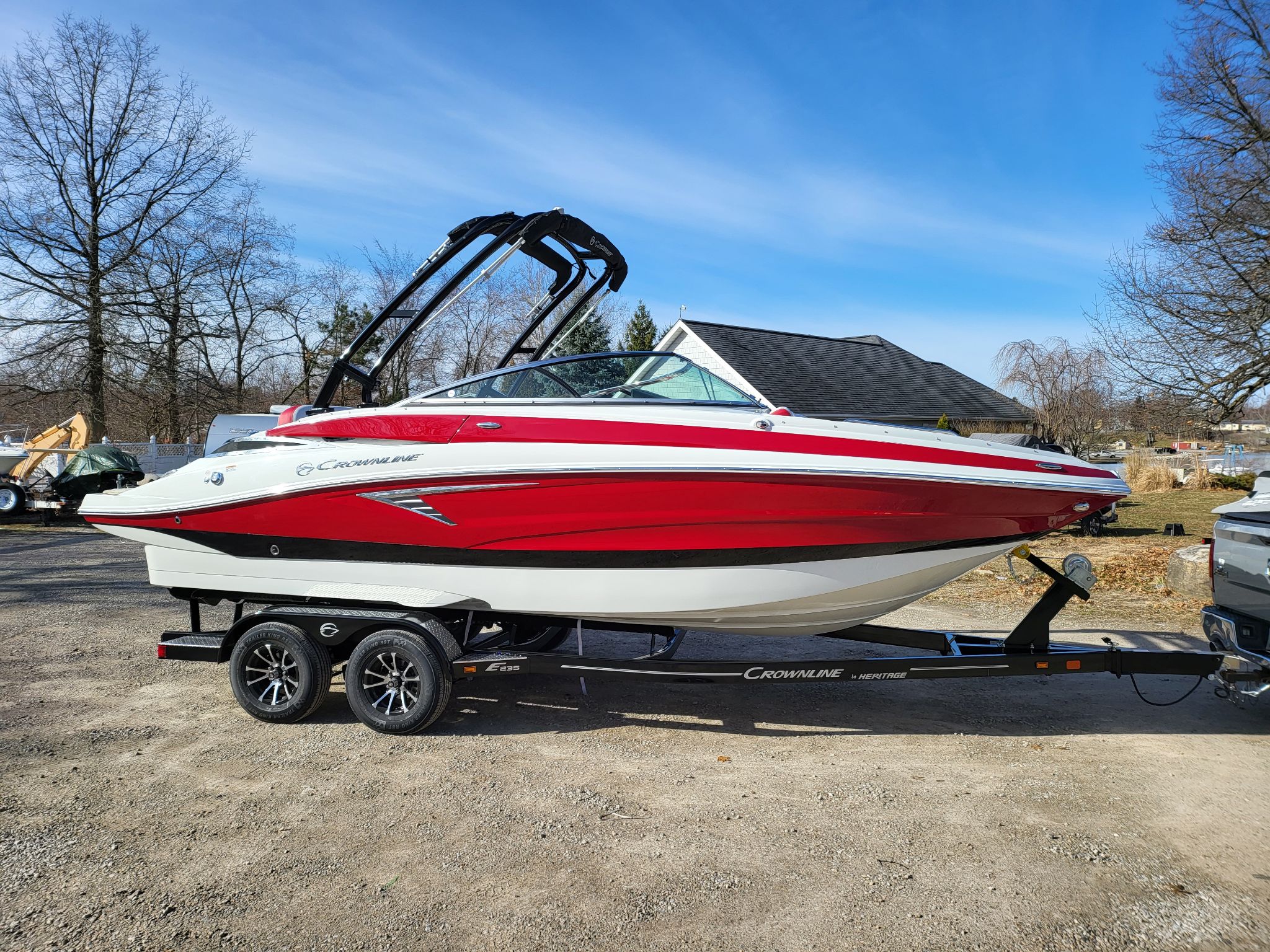 Low Low Pricing! This Crownline includes all the standard Crownline features plus: Pump out head, separate bow and cockpit cover, foldable wakeboard tower, teak look flooring. 35 Gallon Fuel Tank. Includes custom matched Heritage trailer with deluxe wheels and fenders.MERCRUISER 6.2L Bravo III (300HP)