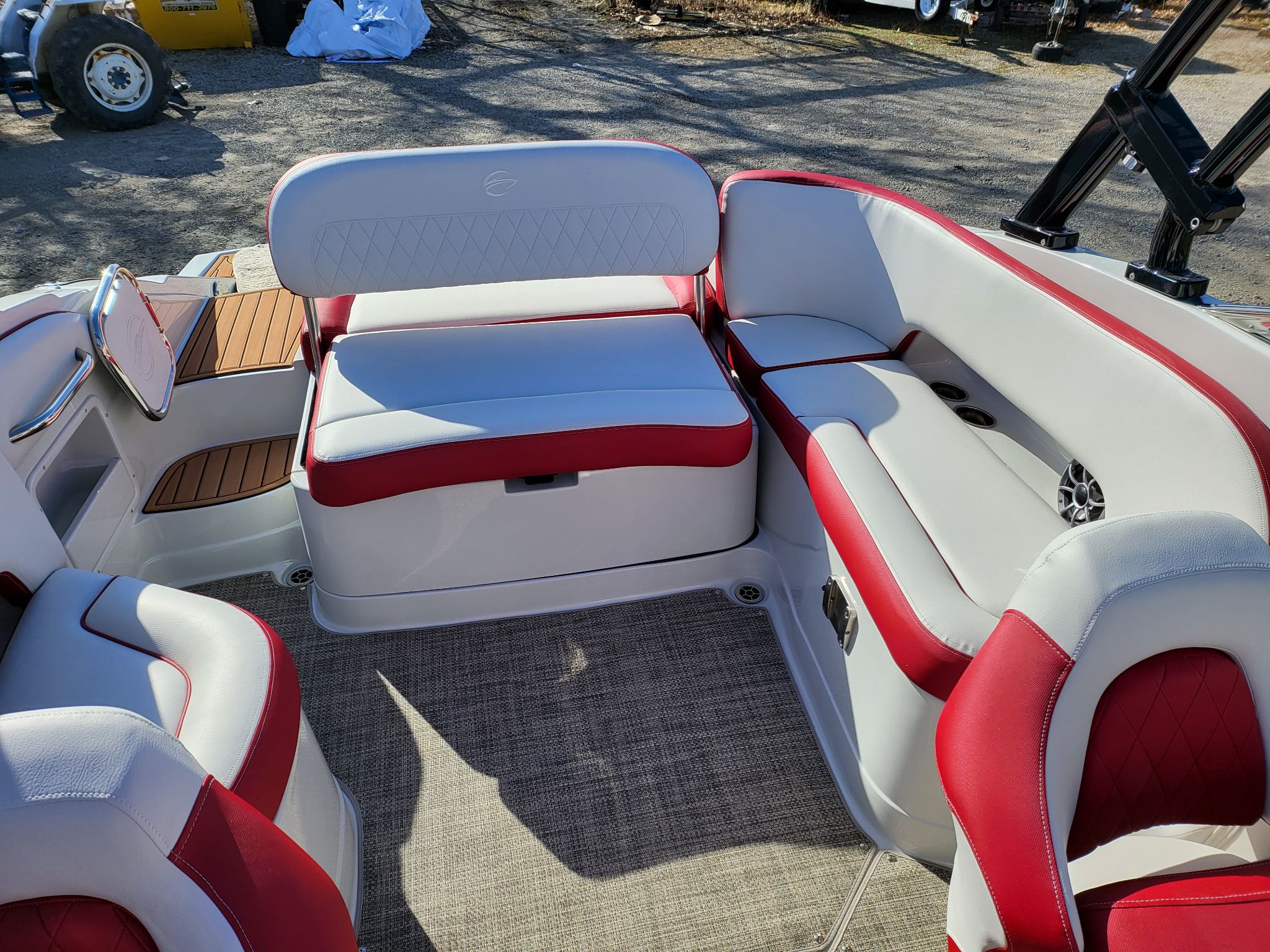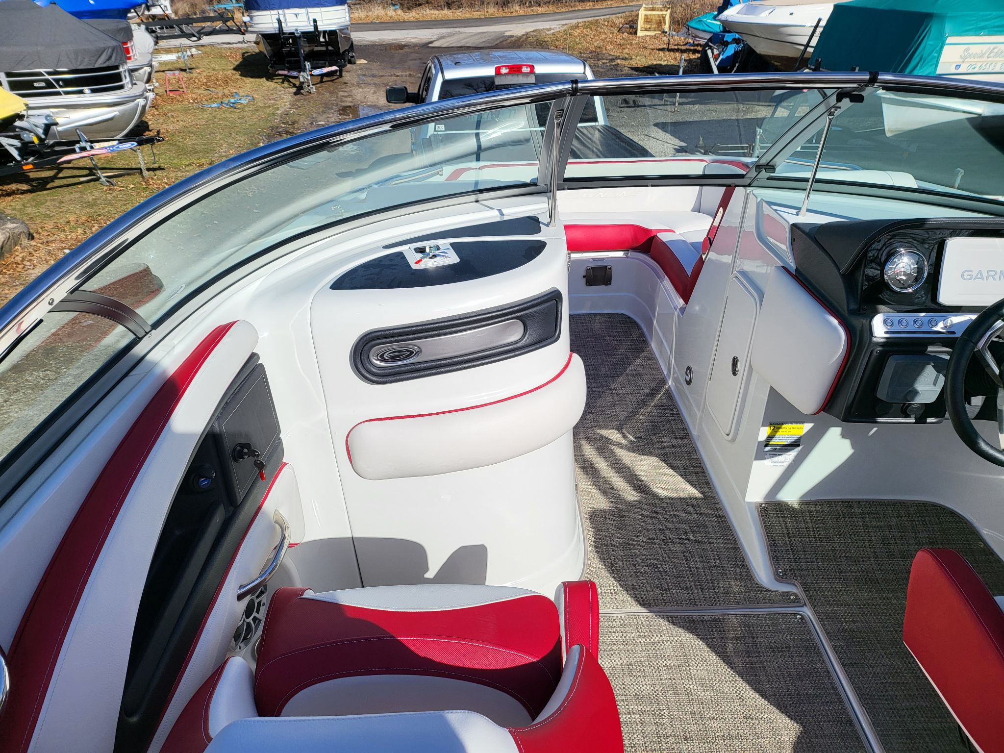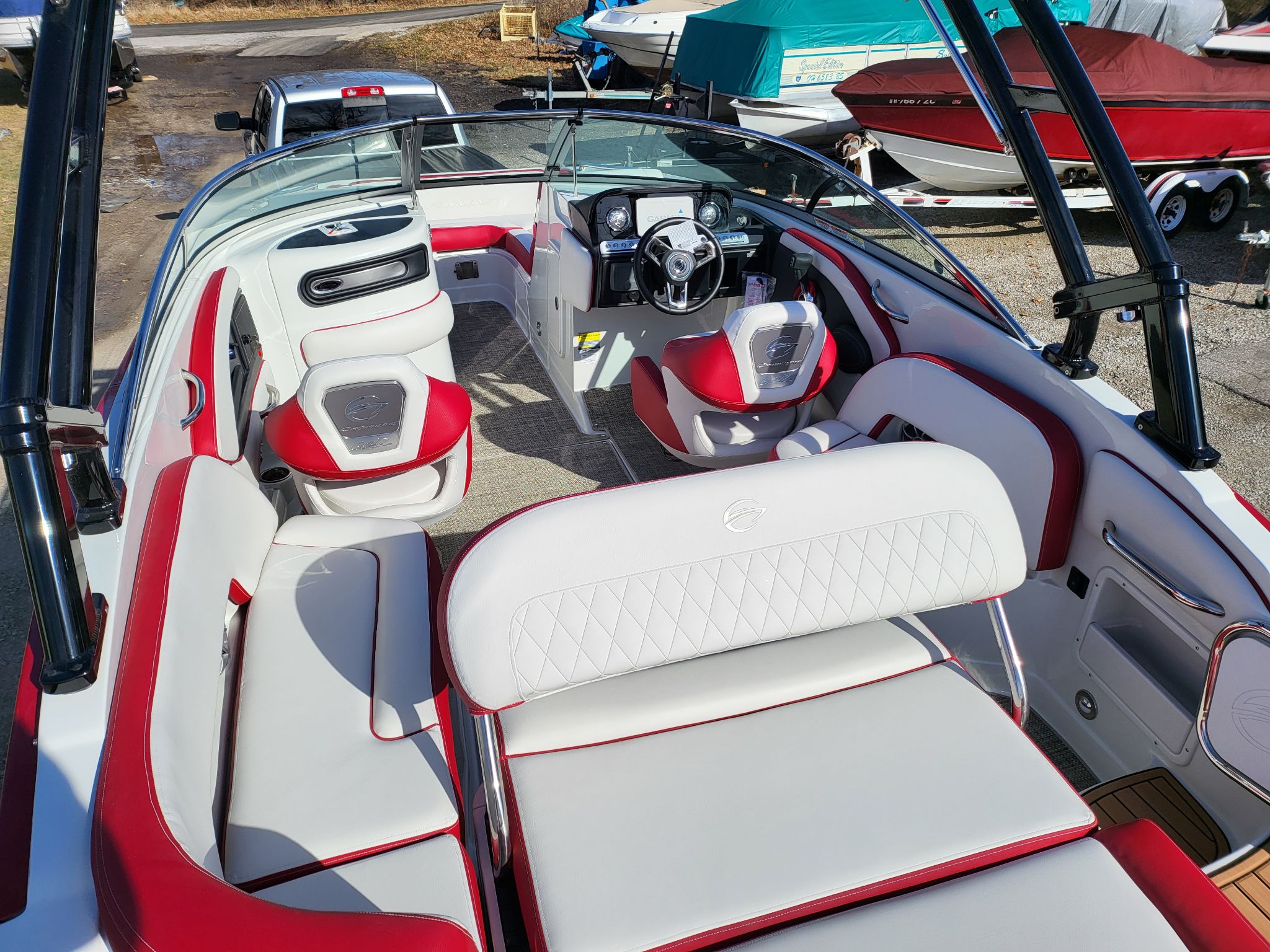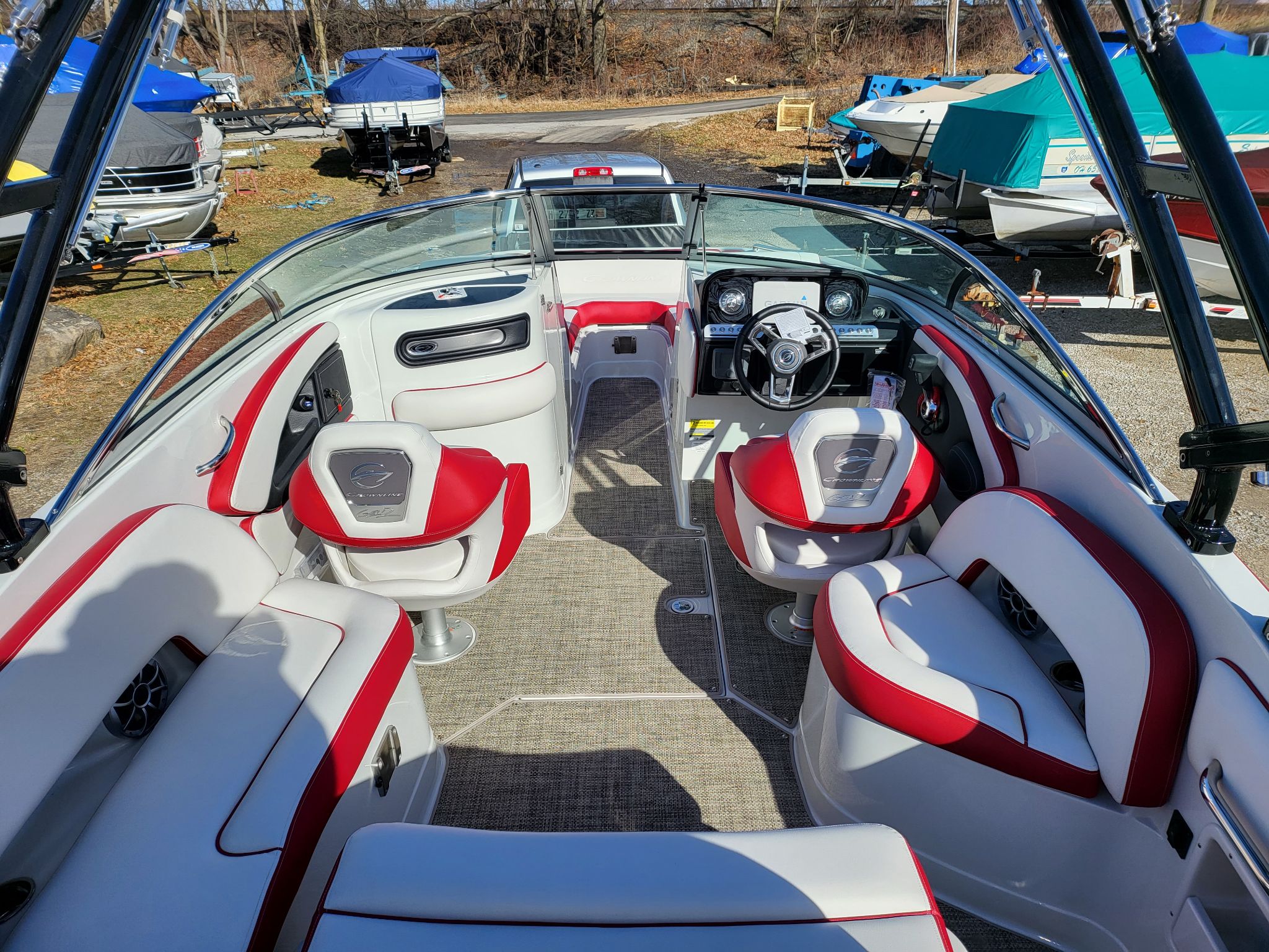 Low Low Pricing! This Crownline includes all the standard Crownline features plus: Pump out head, separate bow and cockpit cover, foldable wakeboard tower, teak look flooring. 35 Gallon Fuel Tank. Includes custom matched Heritage trailer with deluxe wheels and fenders.MERCRUISER 6.2L Bravo III (300HP)