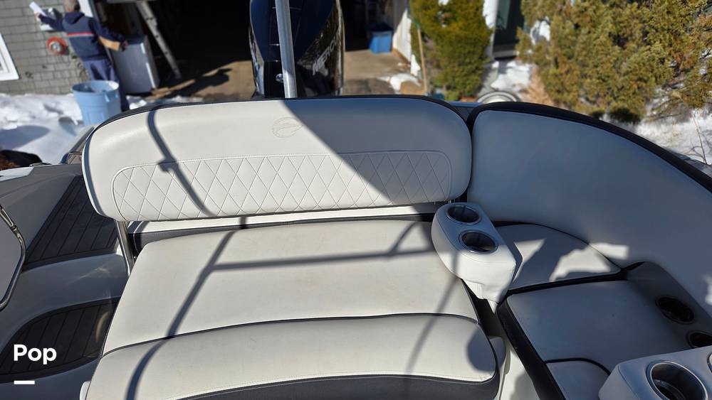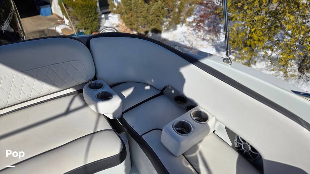 Comfort and convenience are everywhere you look in the cockpit. The boat features a Bimini top for welcome shade on sunny days and ample drink holders throughout the seating areas to keep everyone refreshed.