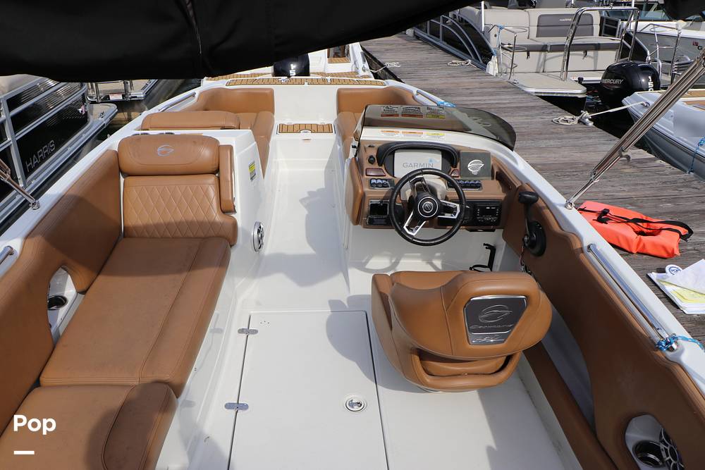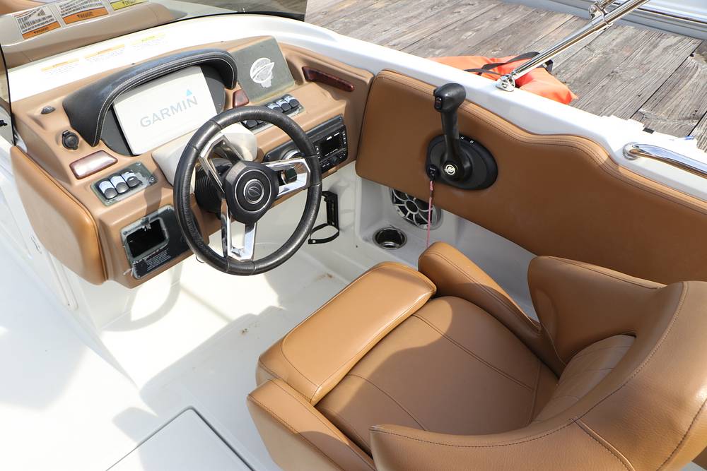 At the sporty starboard helm console, the Captain rides in style and comfort in the adjustable sport bucket helm seat with flip-up bolster. The Helm console has a sport-tilt steering wheel, a read Garmin GPS Chartplotter digital display, and a large lockable storage compartment below.