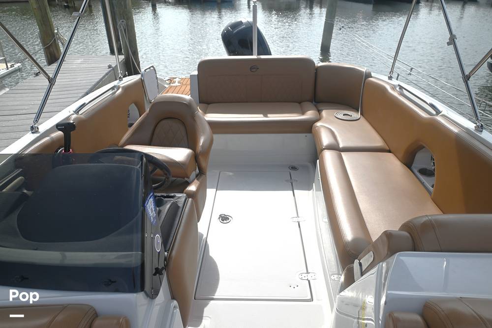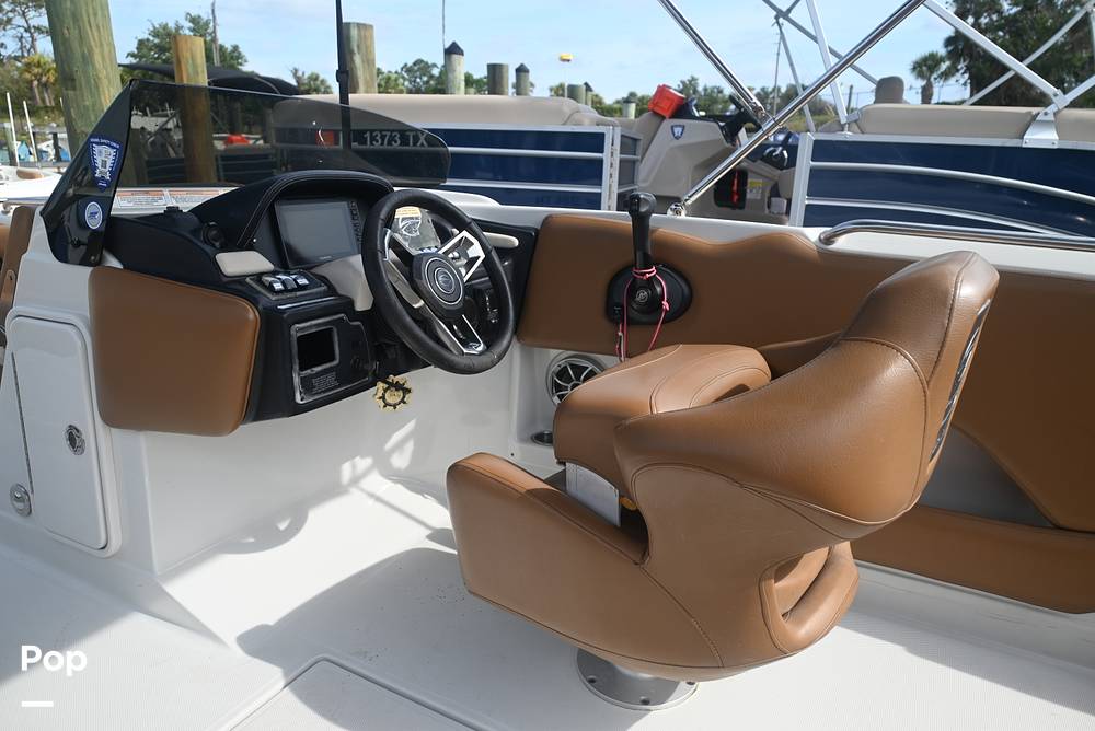 At the sporty starboard helm console, the Captain rides in style and comfort in the adjustable sport bucket helm seat with flip-up bolster. The Helm console has a sport-tilt steering wheel, a Garmin GPS Chartplotter digital display, and a large lockable storage compartment below.