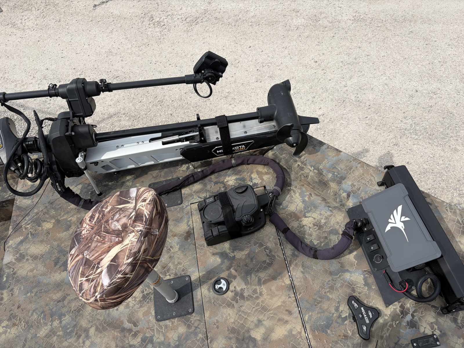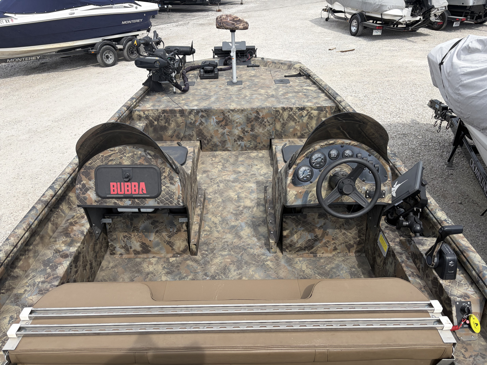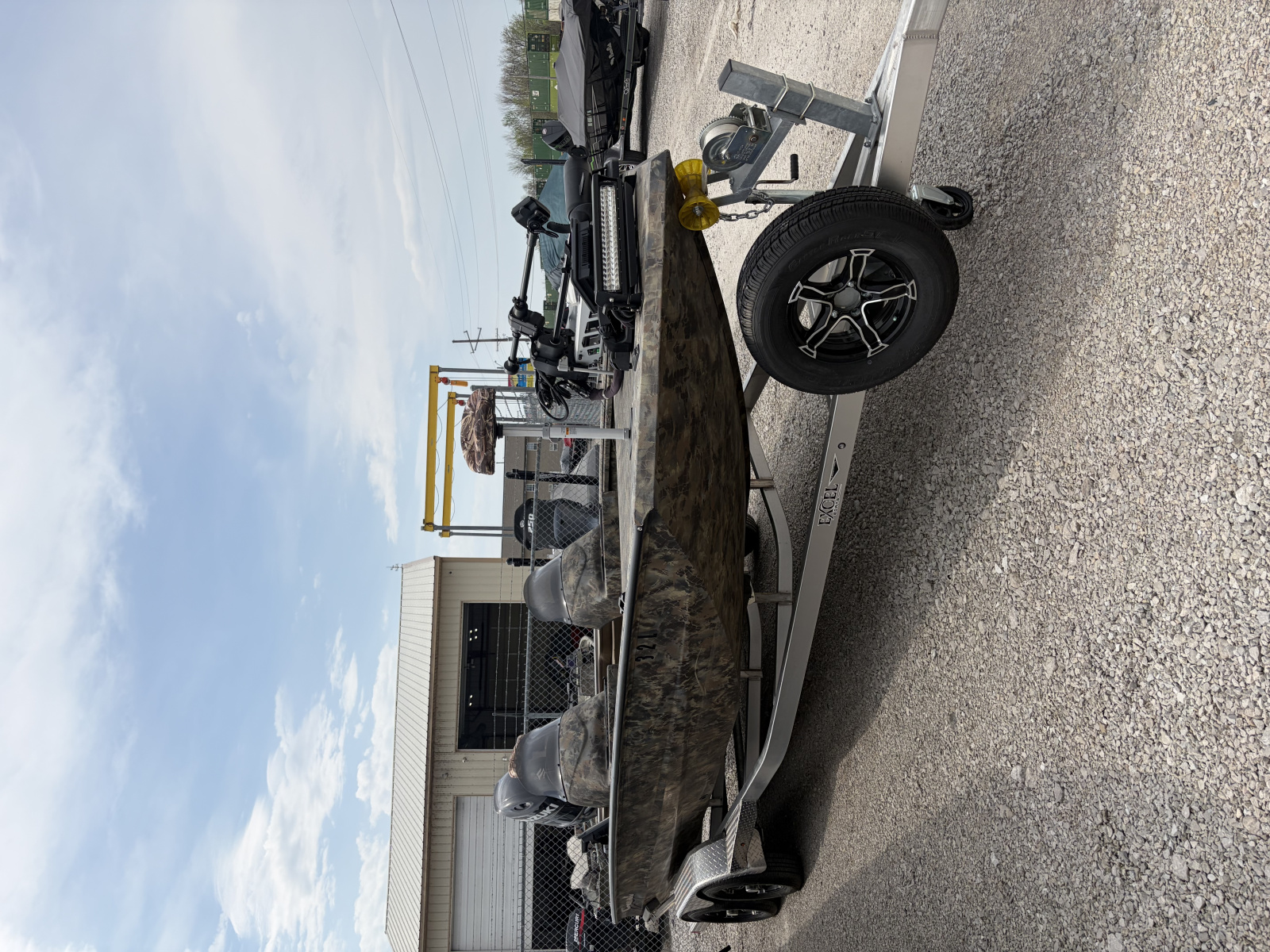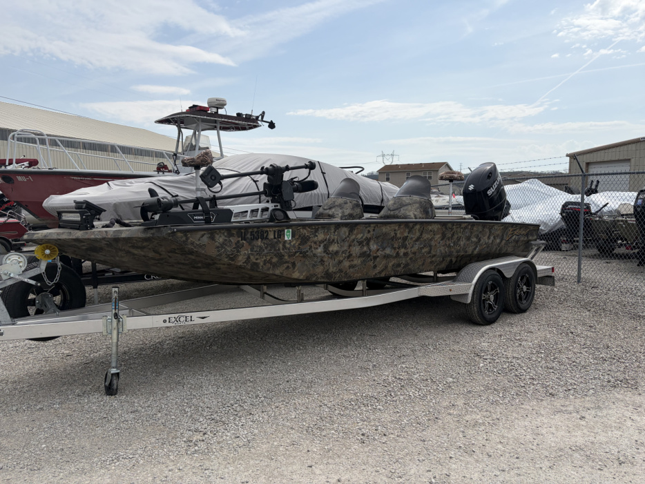 2023 Excel 2172 Cat with 2025 Suzuki DF175 and tandem axle trailer, Minnkota 24 volt 80lb Ultrex trolling motor, Humminbird xplore 12 at console, Humminbird Xplore 9, Mega Live on turret with foot control.