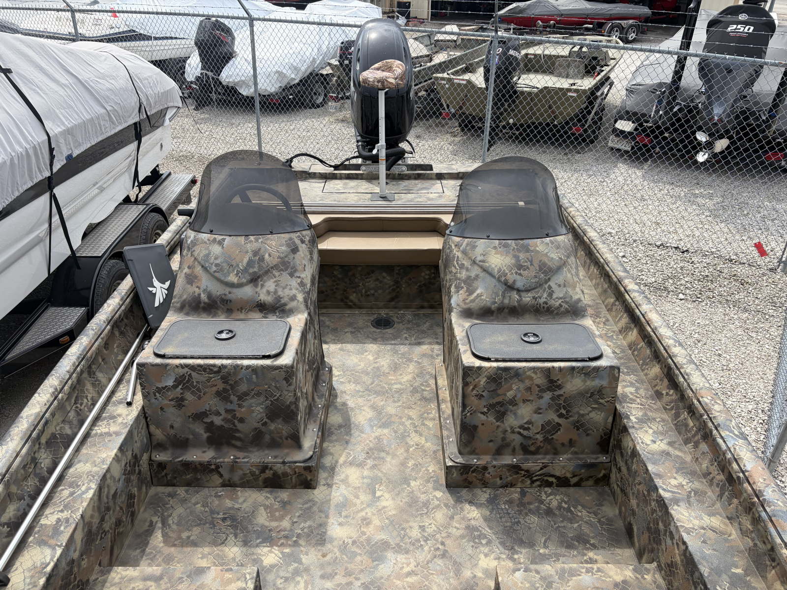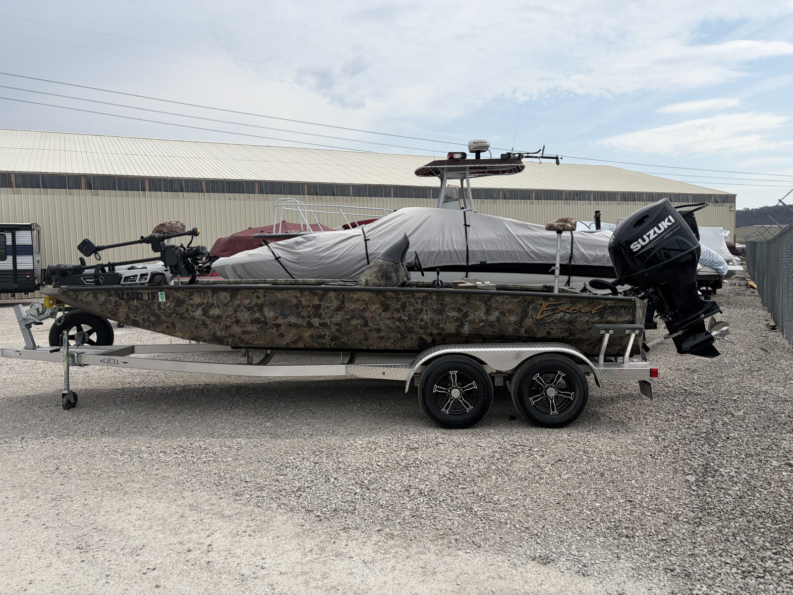 2023 Excel 2172 Cat with 2025 Suzuki DF175 and tandem axle trailer, Minnkota 24 volt 80lb Ultrex trolling motor, Humminbird xplore 12 at console, Humminbird Xplore 9, Mega Live on turret with foot control.