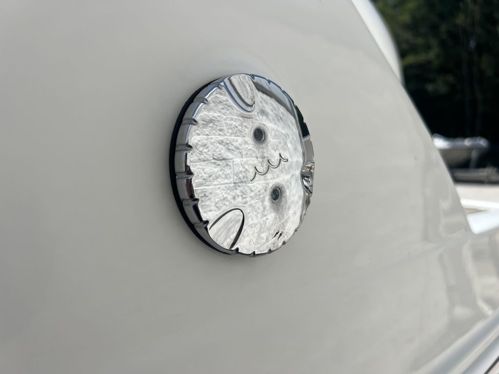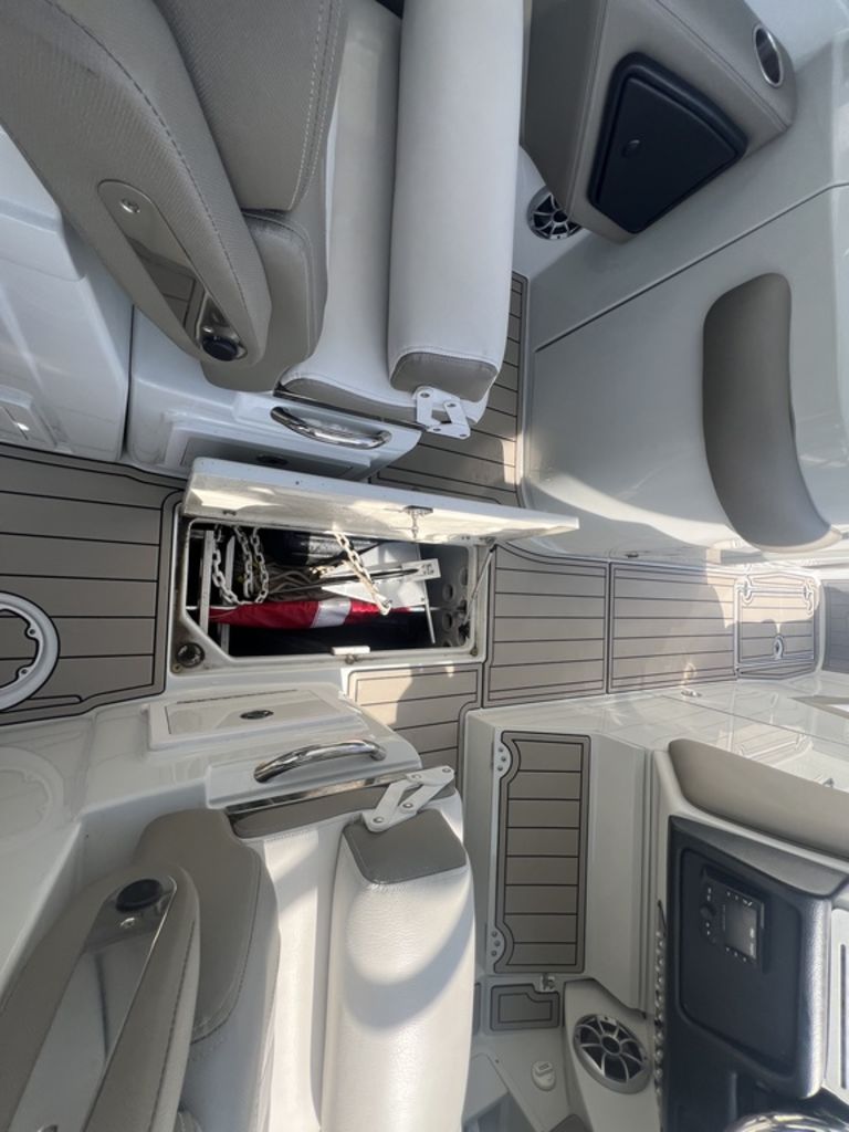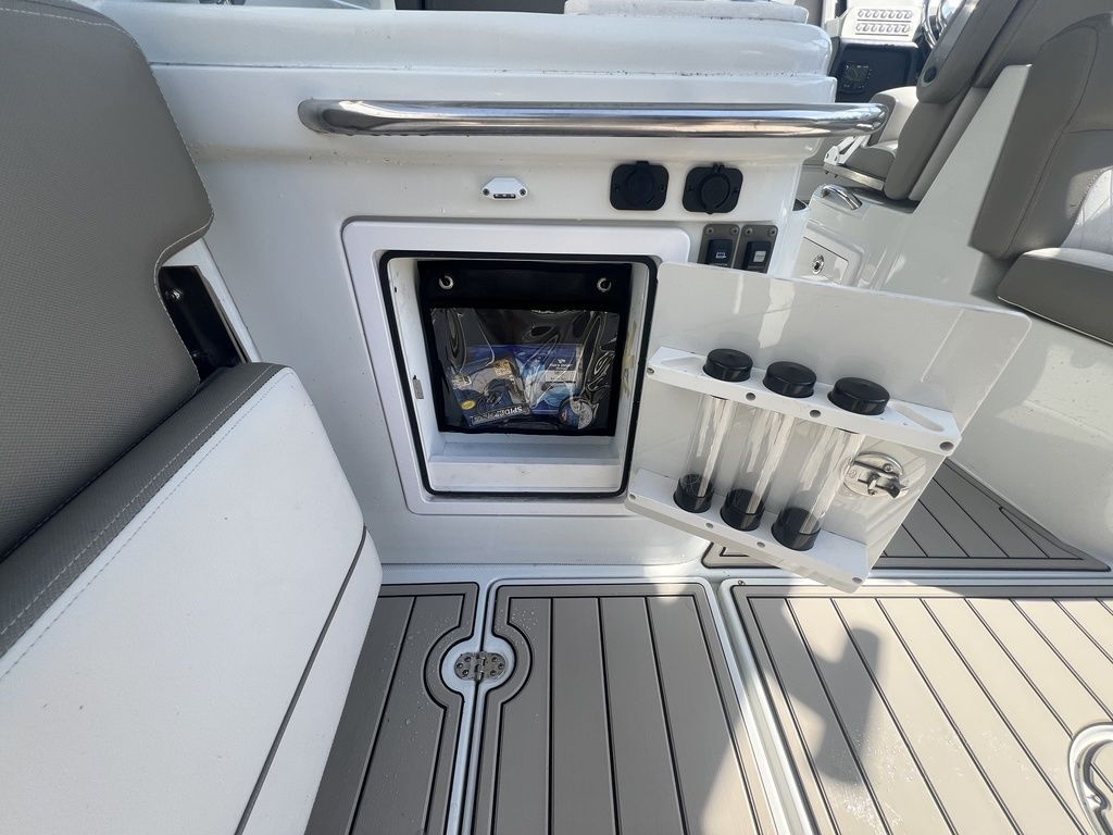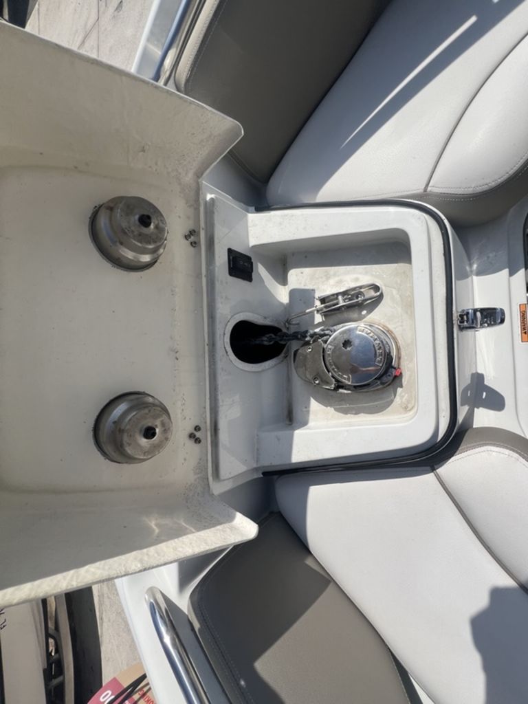 This well-appointed vessel features a spacious cockpit with plush seating, abundant storage, and a fully equipped galley perfect for extended days on the water. The enclosed head compartment offers added comfort with a freshwater sink and marine toilet. Anglers will appreciate the large livewell, rod holders, and in-floor fish boxes.