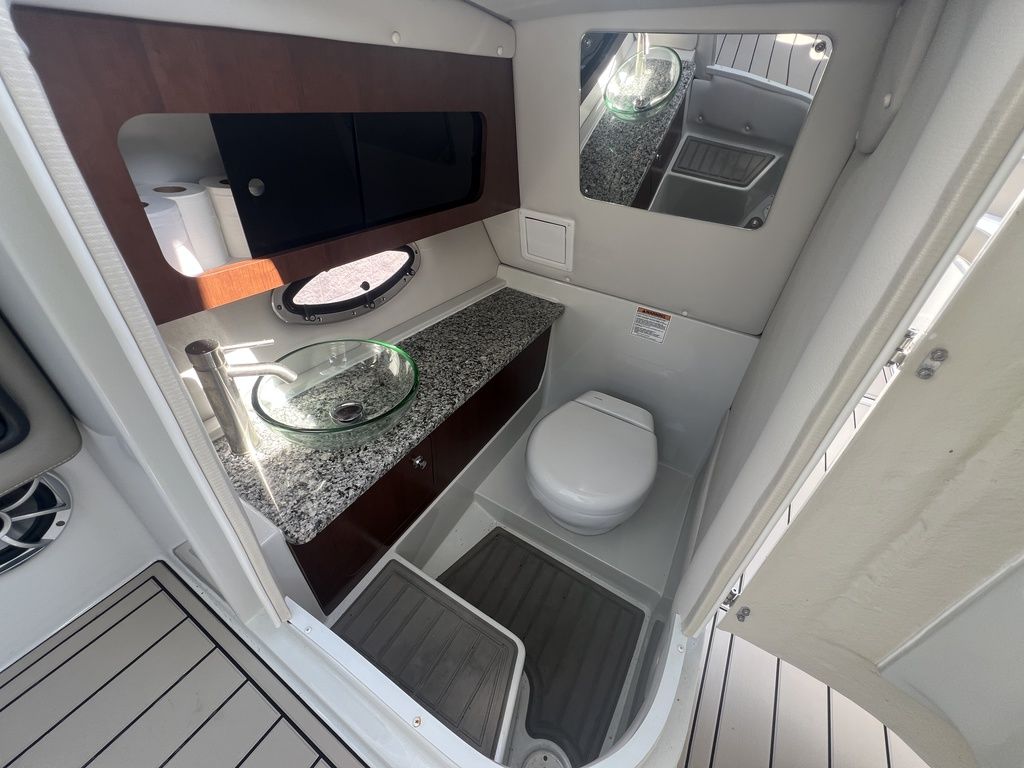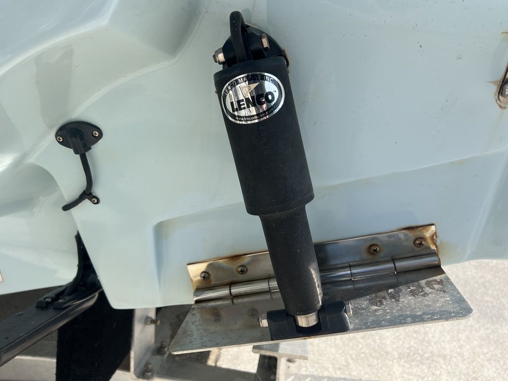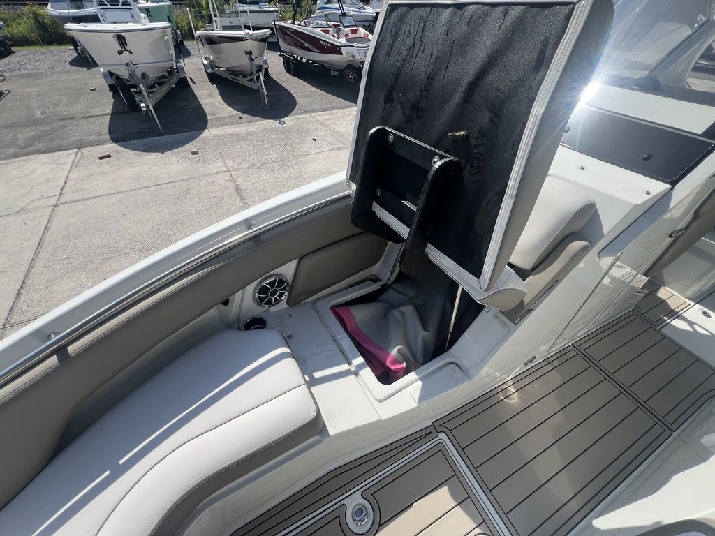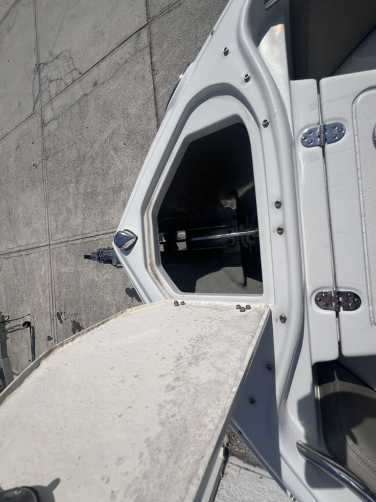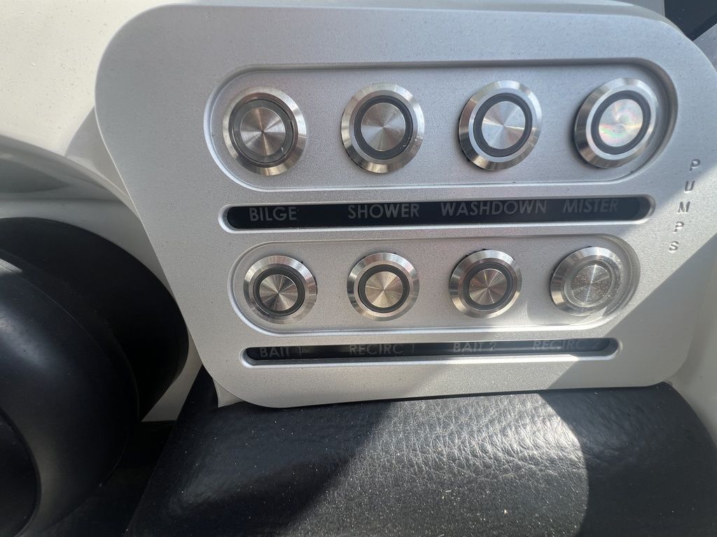 This well-appointed vessel features a spacious cockpit with plush seating, abundant storage, and a fully equipped galley perfect for extended days on the water. The enclosed head compartment offers added comfort with a freshwater sink and marine toilet. Anglers will appreciate the large livewell, rod holders, and in-floor fish boxes.