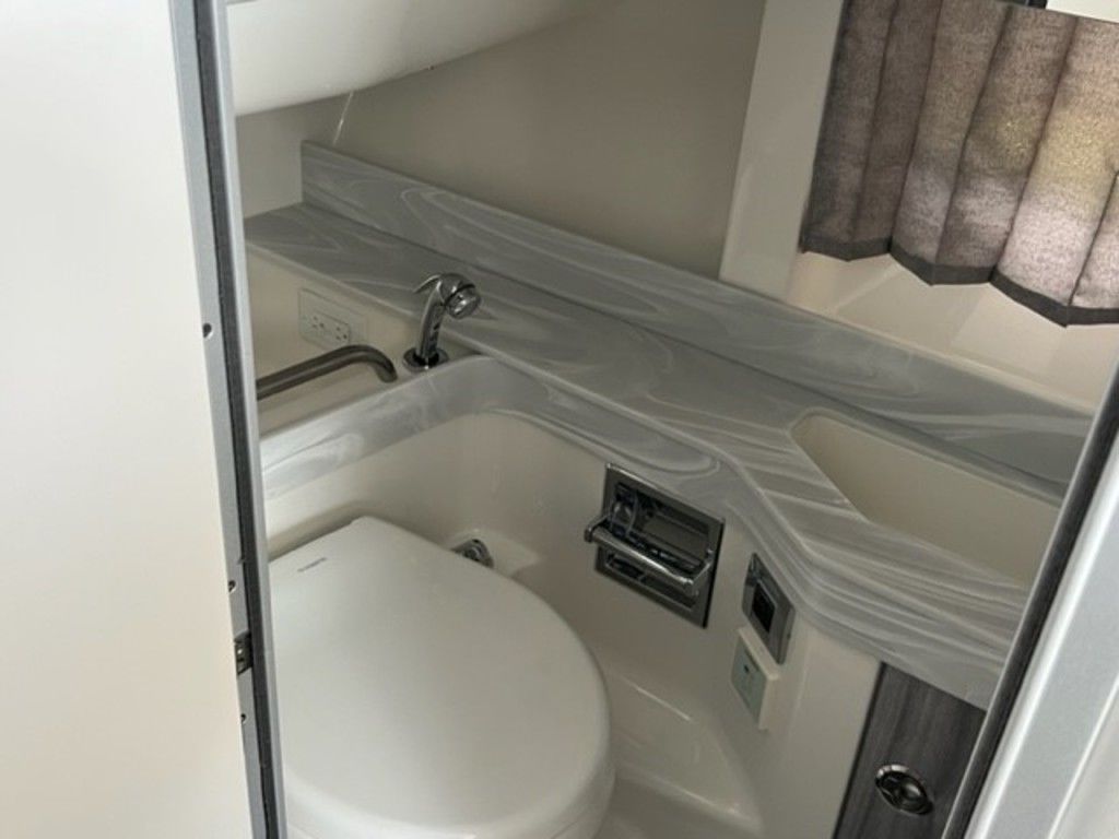 Full Size Head- The head compartment come with a VacuFlush® head unit, 37-gallon holding tank and dockside pumpout, It also features a vanity, custom molded sink with faucet, Corian counter top, retractable showerhead, exhaust fan and woodgrain-finish flooring.