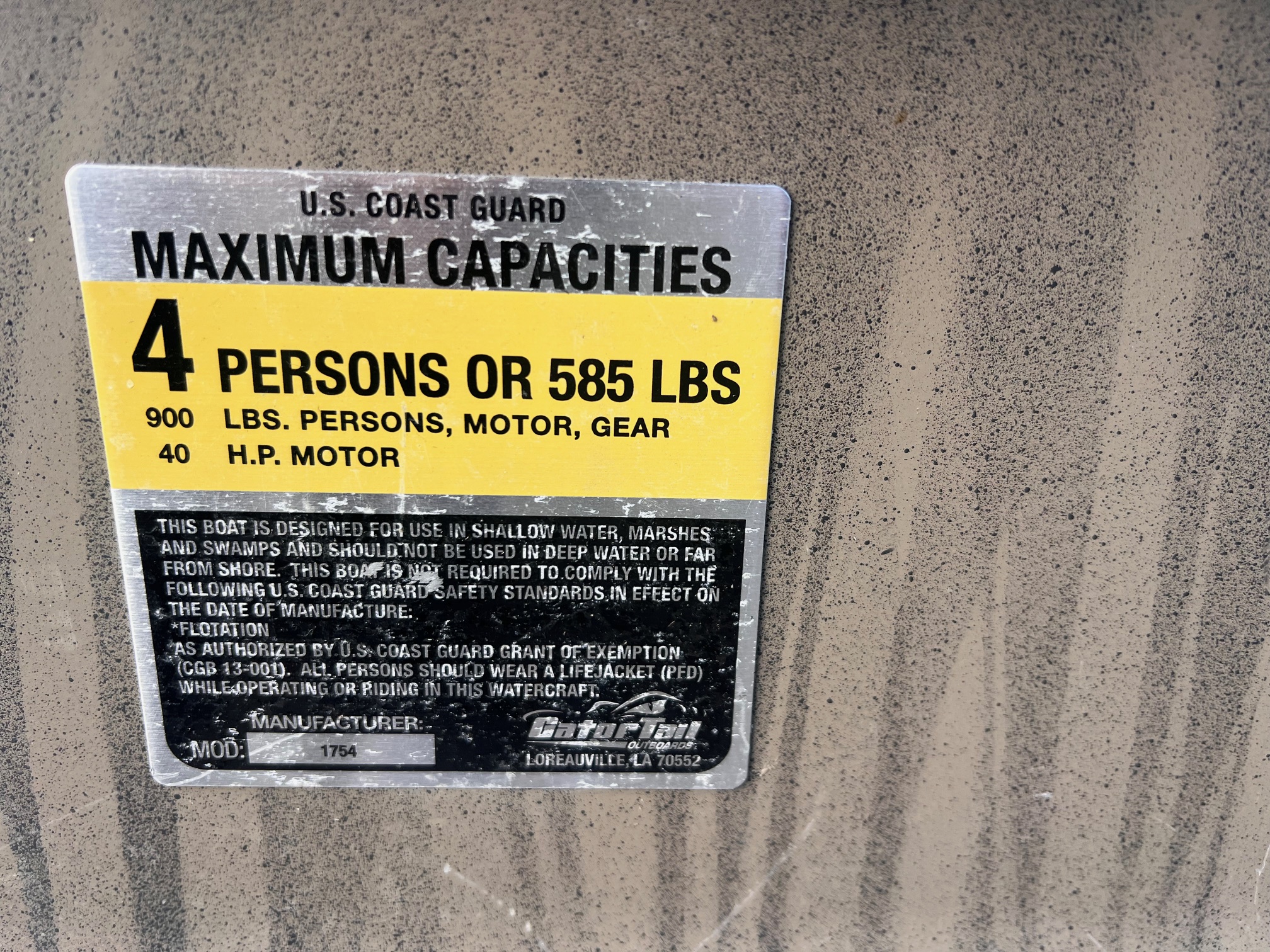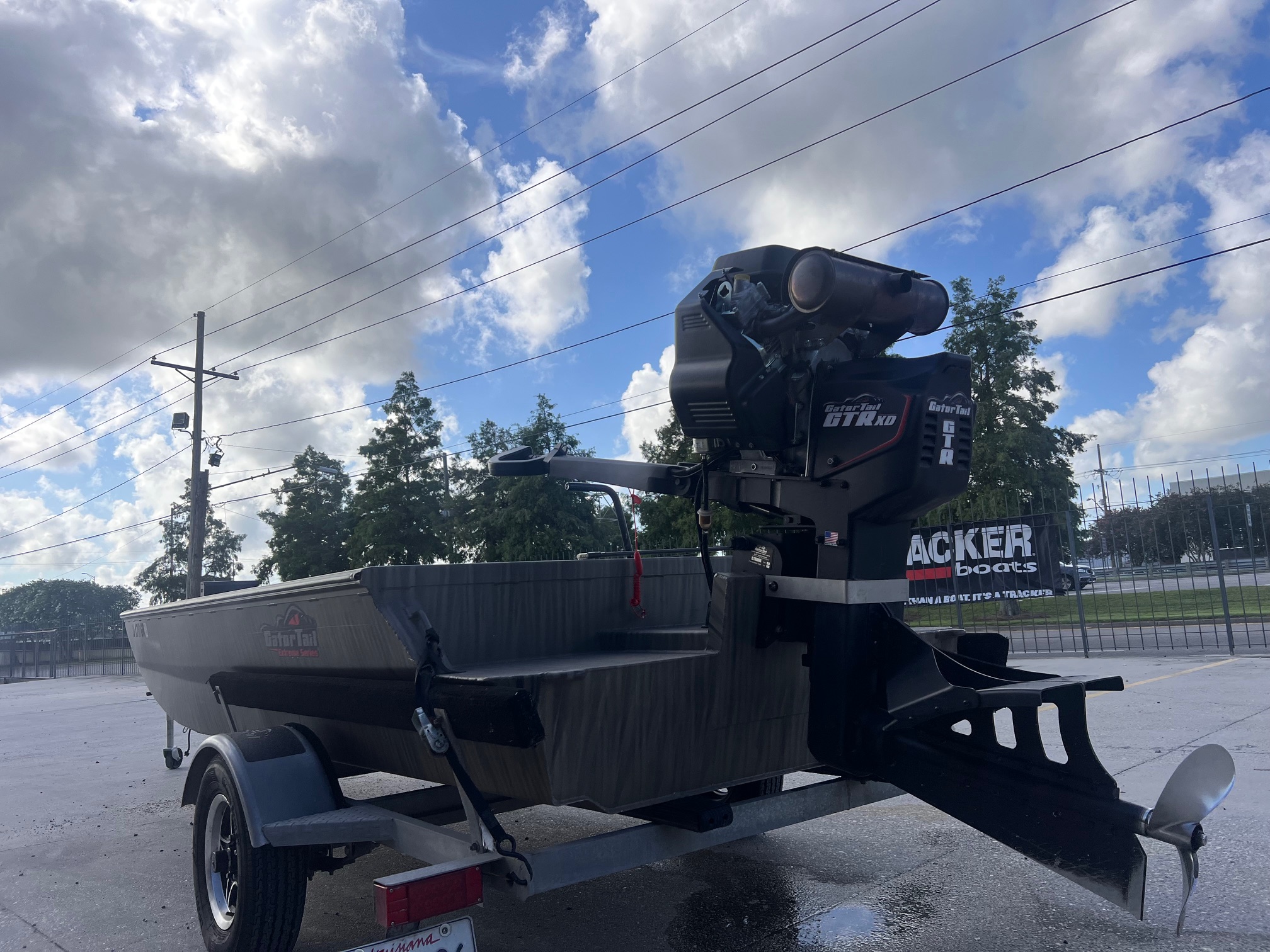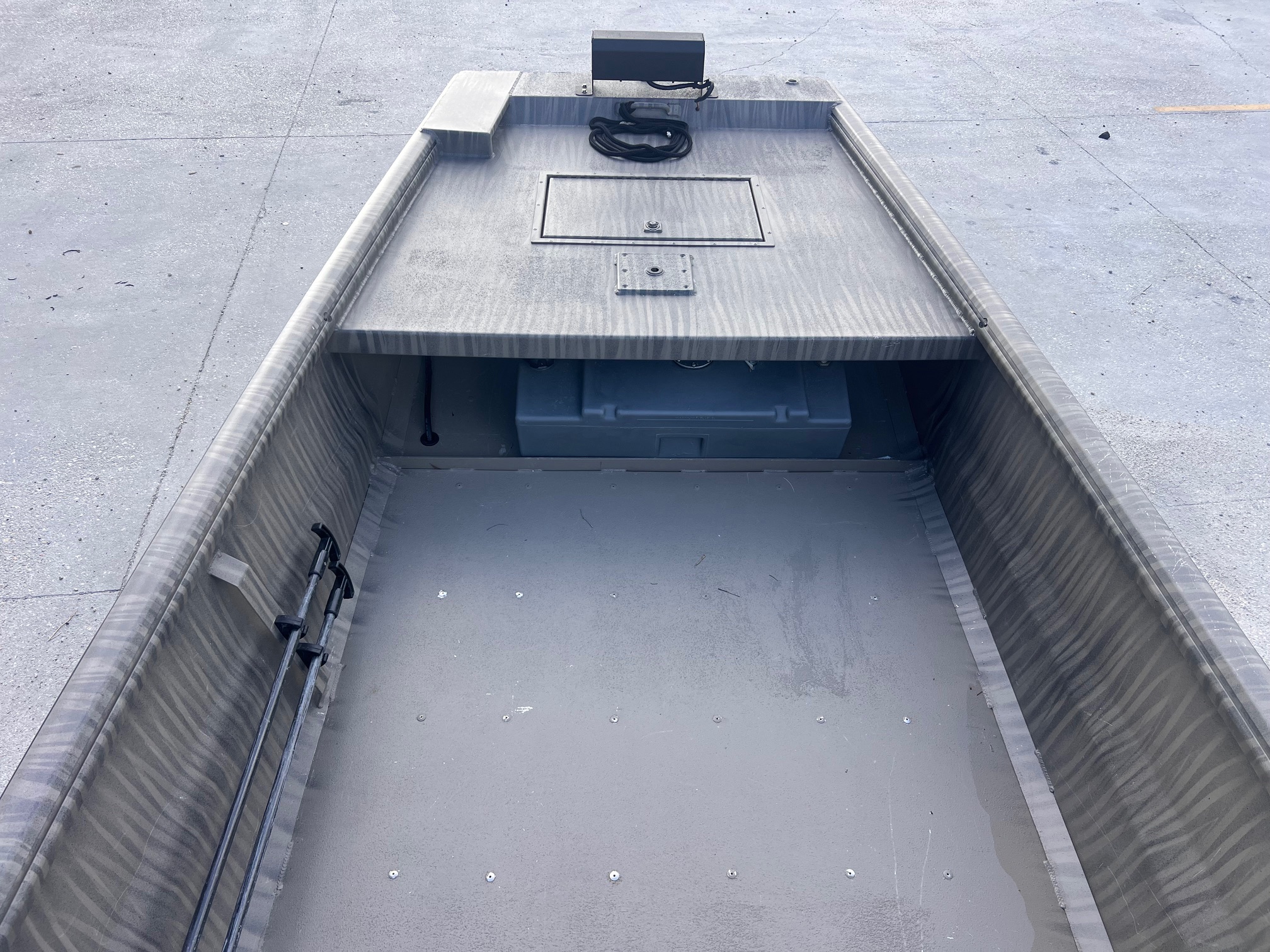 The Gator Tail 1754 Extreme is a 17-foot long, 54-inch wide boat designed for shallow water performance, particularly in flooded timber and other challenging environments. It features a stepped hull for enhanced handling and speed when paired with a mud motor. Key features include a 4-foot front deck with pedestal base, rear dual pods, T-rail gunnel, and a 21-inch transom.