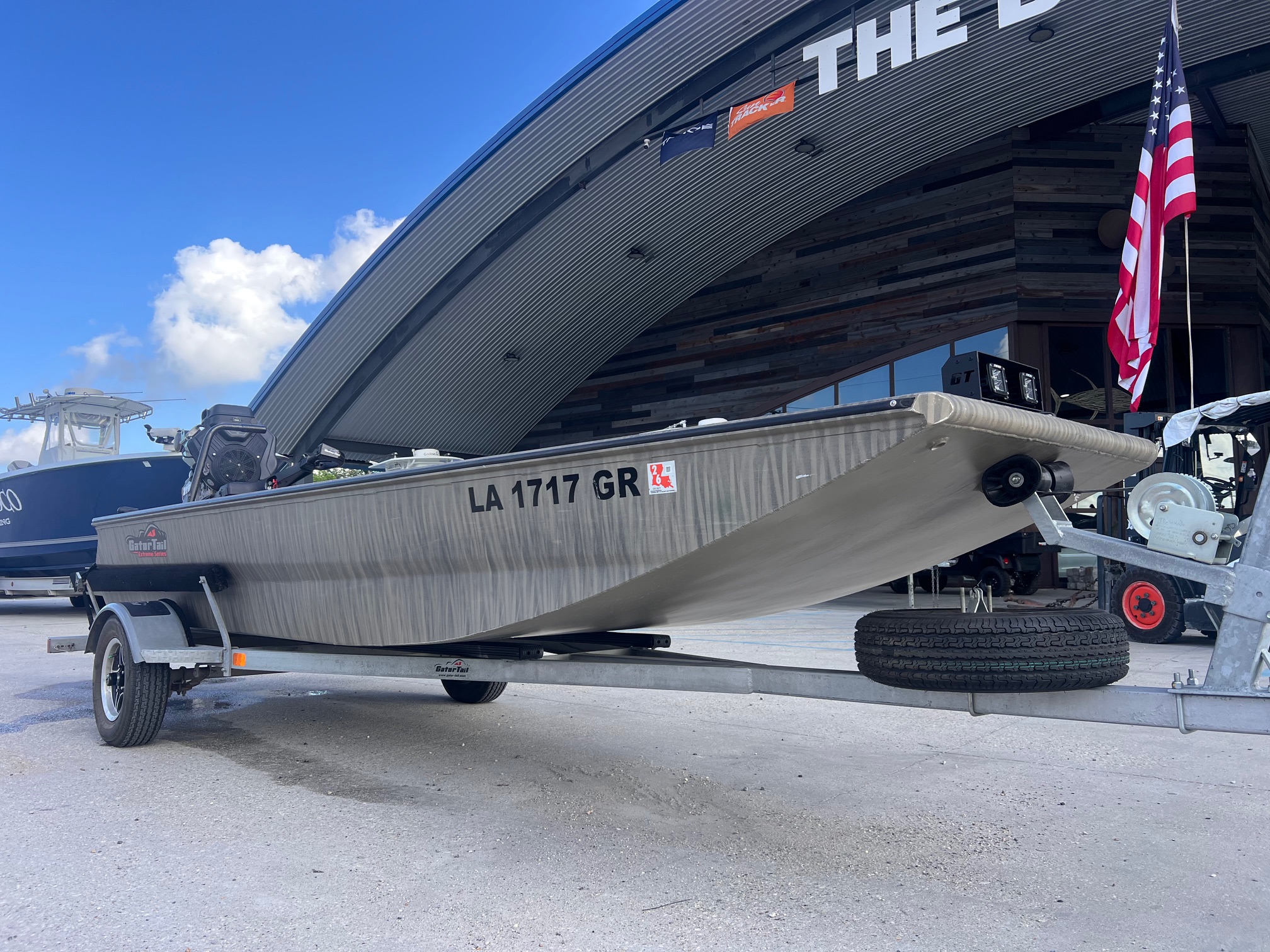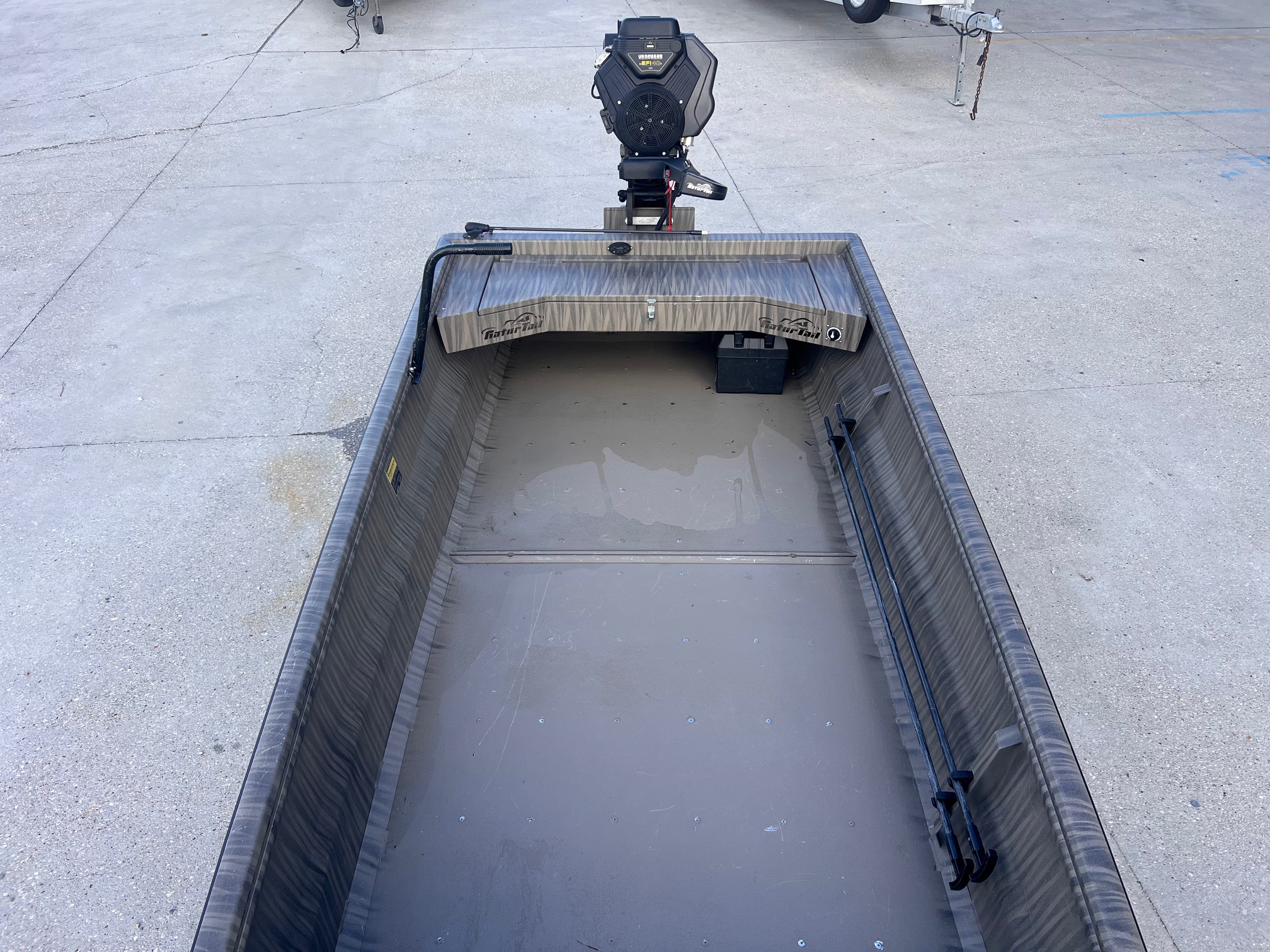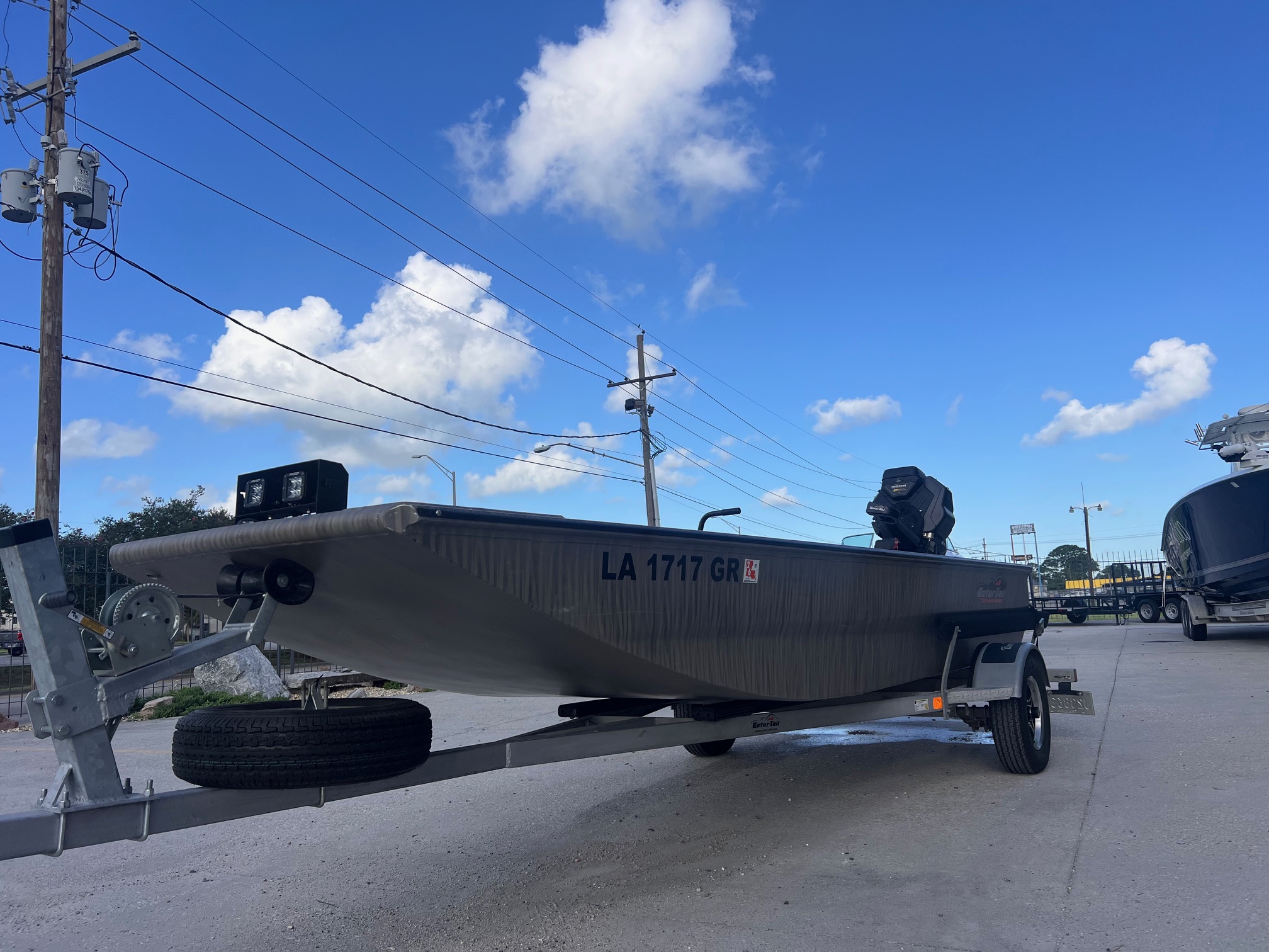 The Gator Tail 1754 Extreme is a 17-foot long, 54-inch wide boat designed for shallow water performance, particularly in flooded timber and other challenging environments. It features a stepped hull for enhanced handling and speed when paired with a mud motor. Key features include a 4-foot front deck with pedestal base, rear dual pods, T-rail gunnel, and a 21-inch transom.