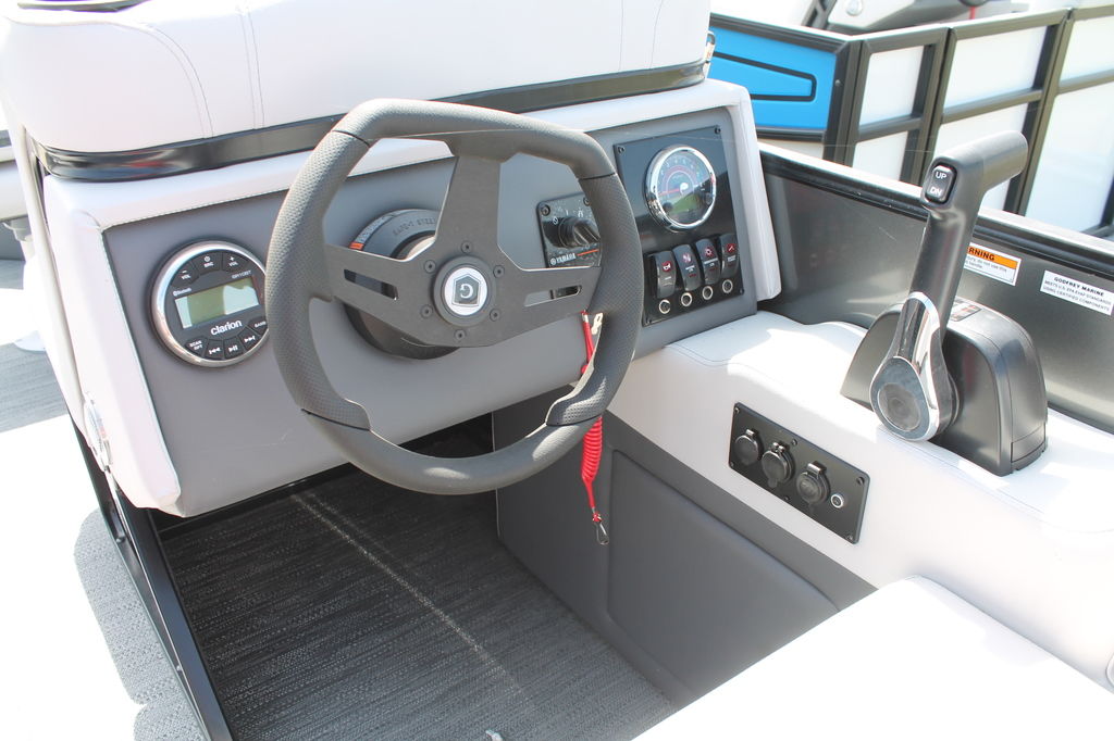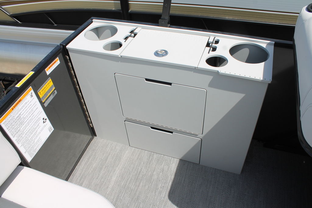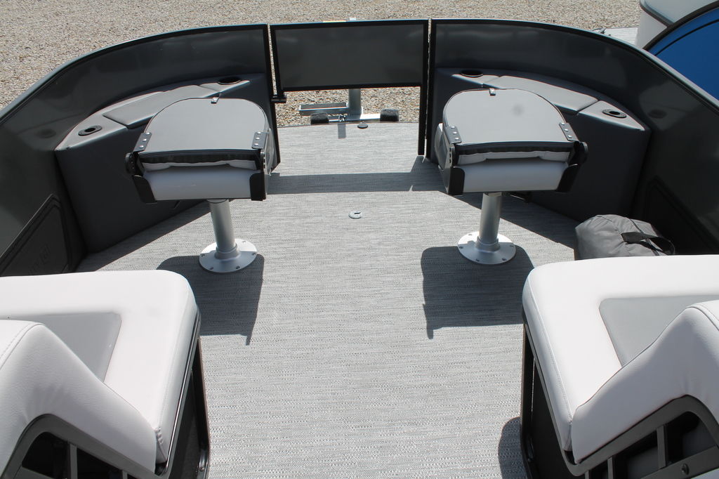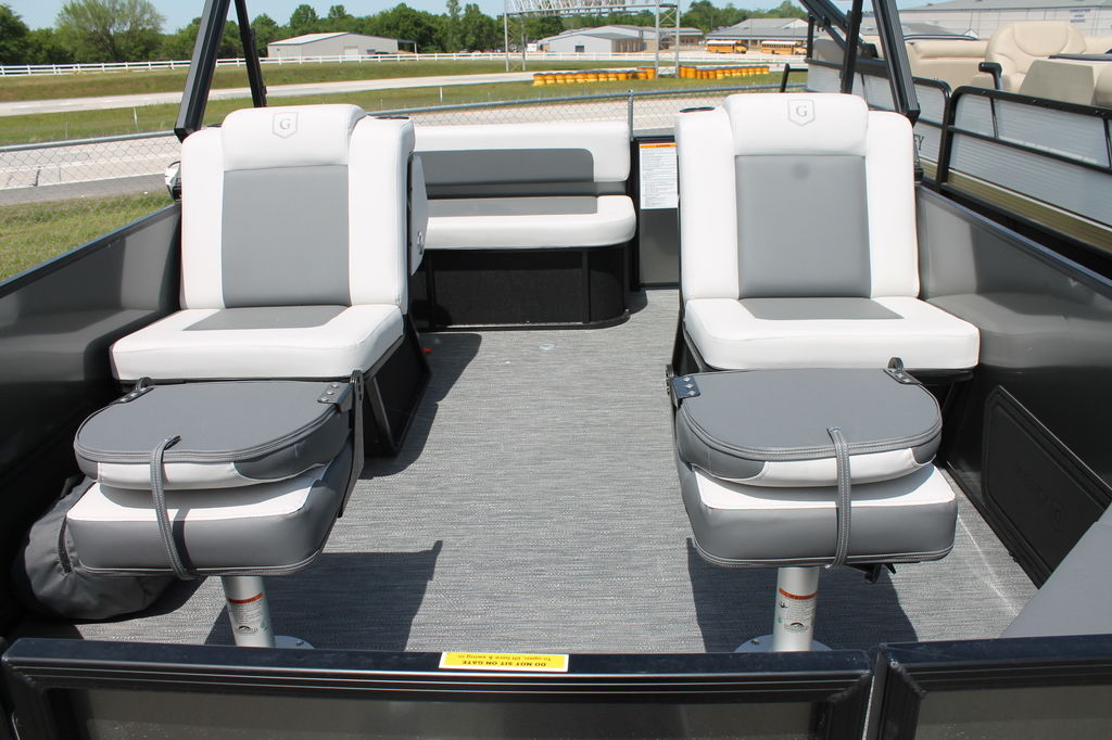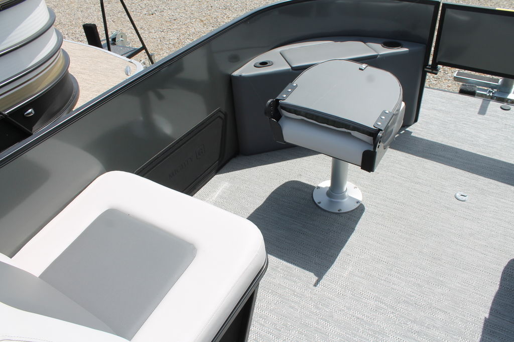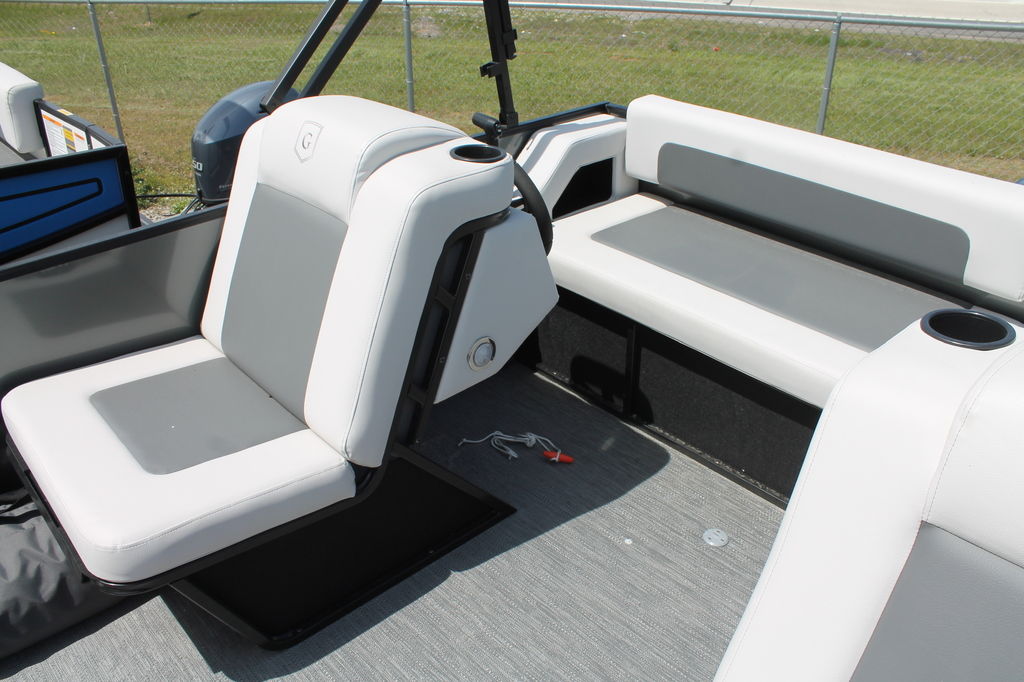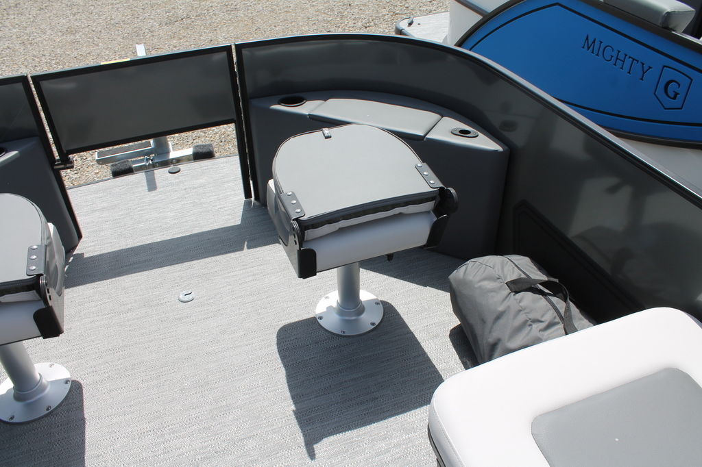 Mighty G Fishing models come standard with an aft fishing station with rod holders, tackle storage, and trolling motor ready with a motor harness kit, including a plug and half gate. For passengers, it is equipped with durable, yet comfortable bench-style seating, a telescoping EZ Climb Ladder and robust Clarion sound. Full 360-degree RGB under deck lighting is available, as well as an optional bimini for sun protection and a cell phone mount at the helm station.