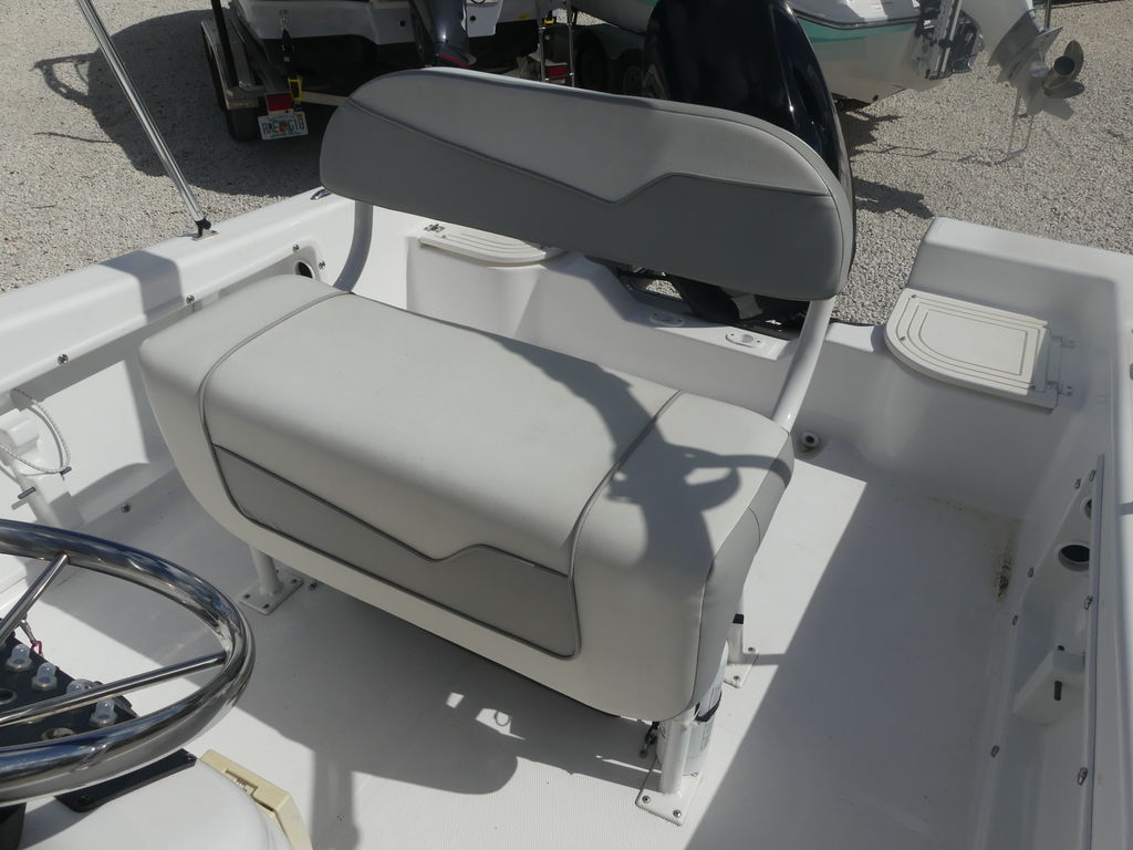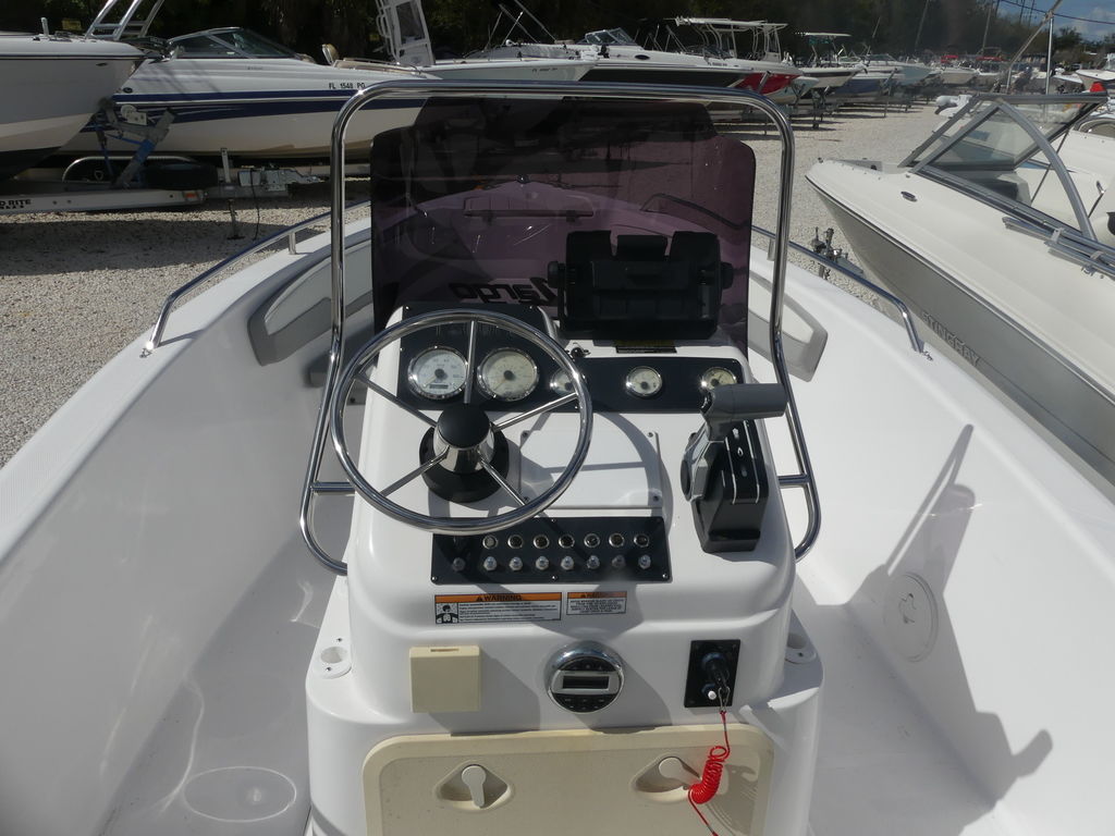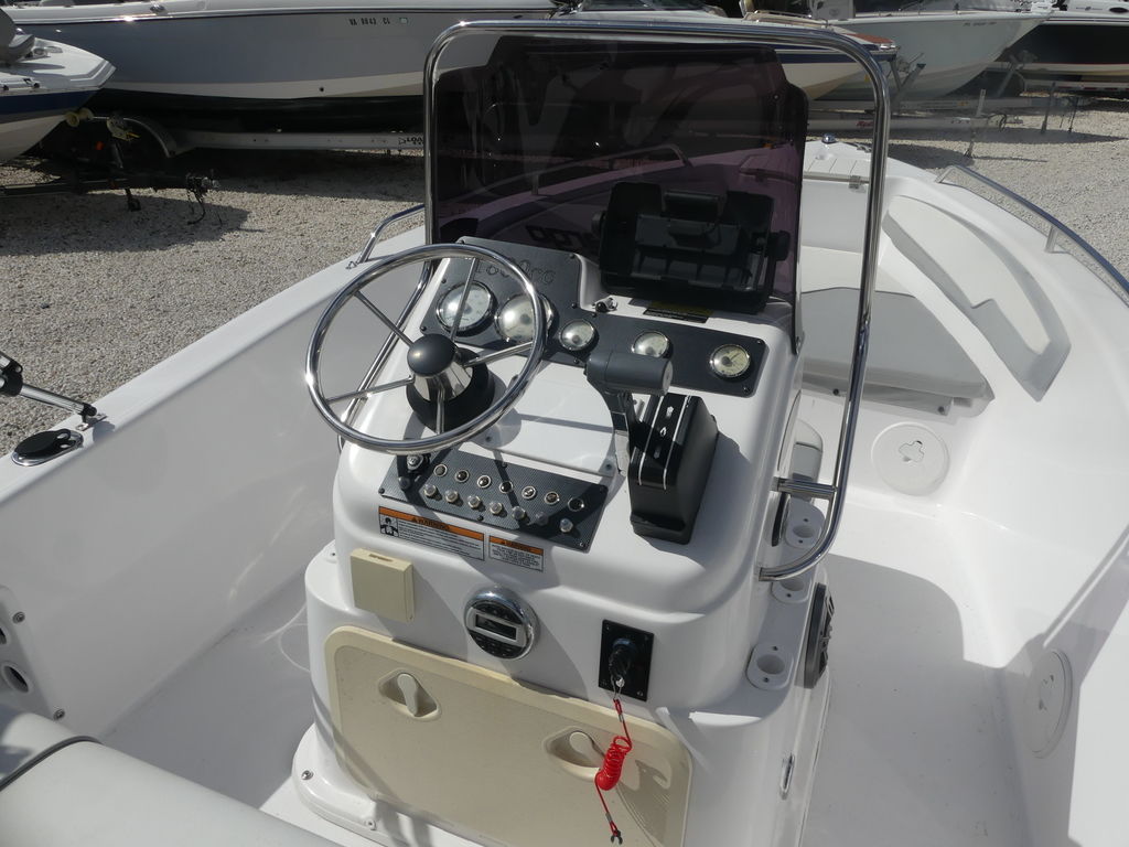 At the helm, the captain benefits from a clean and functional dashboard layout designed for simple navigation and operation. The elevated helm position provides excellent visibility, making it easier to navigate coastal waters, marinas, and channels throughout the Bradenton area. The center console design also allows for easy access around the boat, which is especially helpful when docking or landing fish.