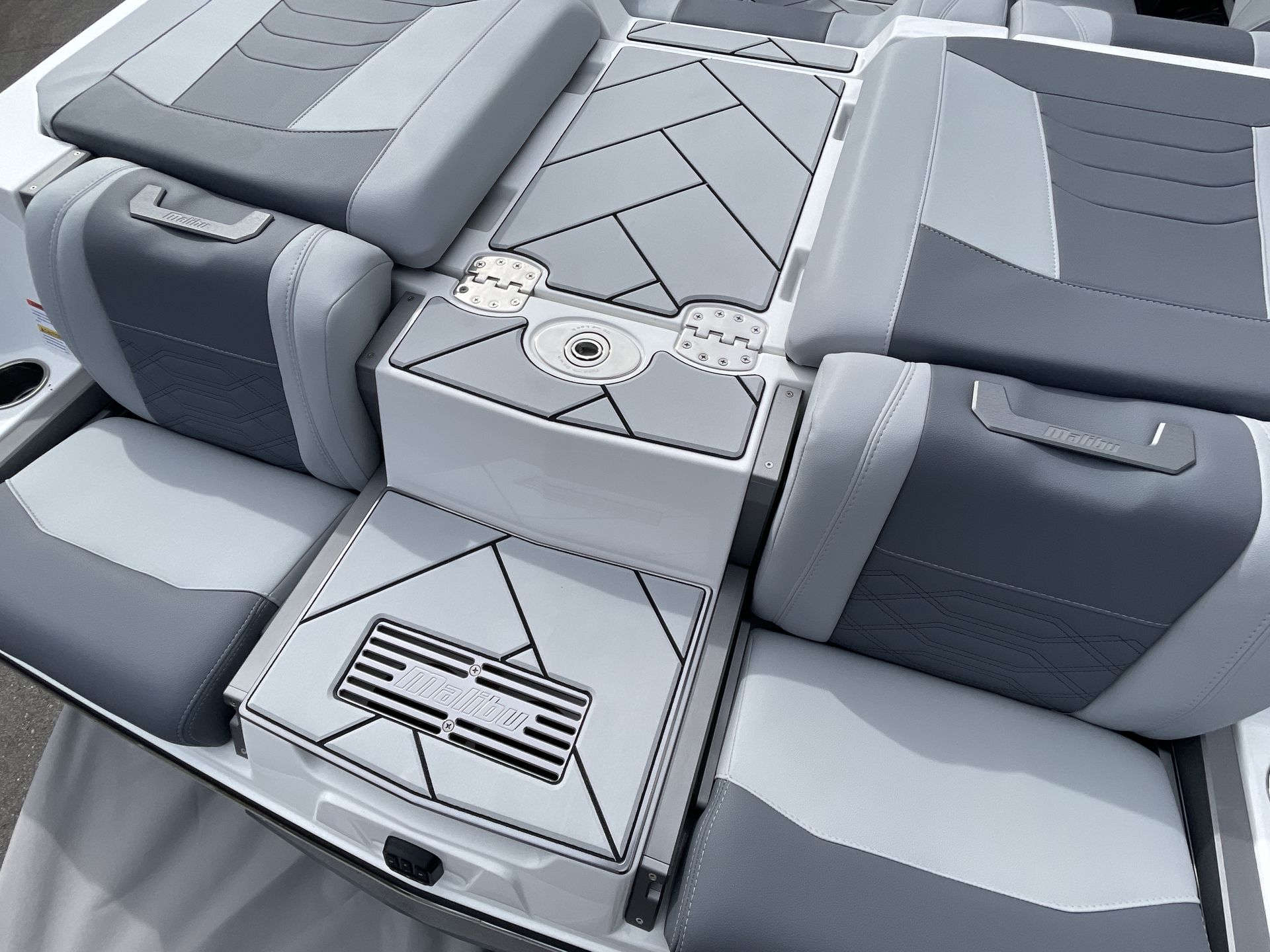 But the real magic happens when you're out on the water. The 25 LSV sound system pack with subwoofer and Wet Sounds Speakers will keep the party going, while the transom remote puts you in complete control of the music. And with the Ballast HI FLO Bow Midship & Rear, Surf Gate with Malibu Surfband, and Power Wedge III, you can customize your wake for the perfect surfing or wakeboarding experience.