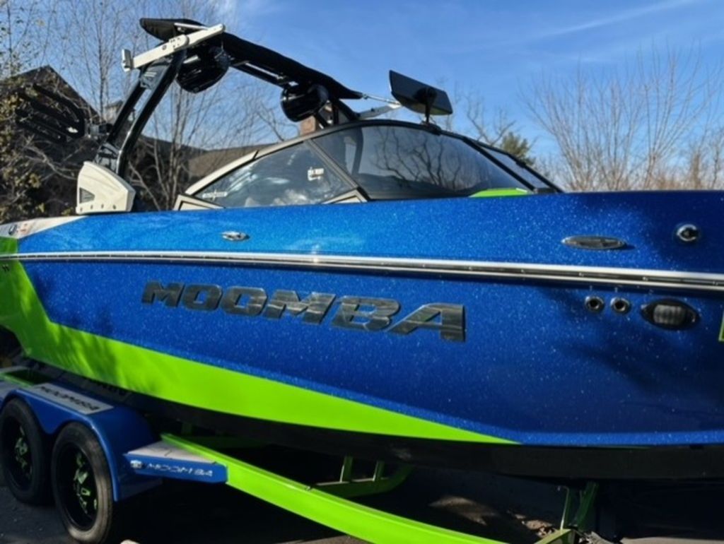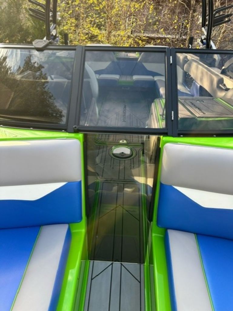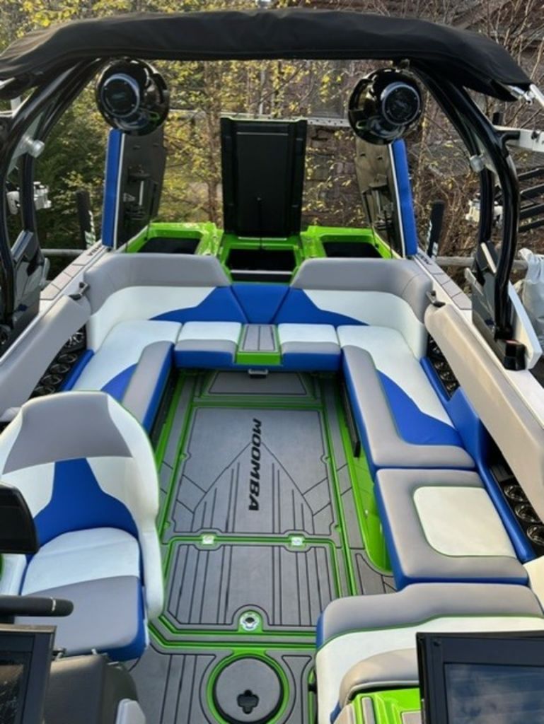 Indmar Raptor 400 Fuel Injected and Closed Cooled V8 Engine, Only 10 Hours, Flow 3 Surf System with G6 Ballast (2 pumps per zone), Center Smart WakePlate, Surf Pipe Exhaust Upgrade, Folding Pro Tower w/ Swivel board Racks, Bimini Top w/ Board Storage, Moomba 7 Touch Screen Display, Interior graphite/white with grey GatorStep Floor and Deck Kit, Stern Shade, windscreen, Premium WetSounds Stereo Upgrade w/ Rev 10 Tower Speakers, Bow Speakers, Amp, and Sub, Underwater Lights, PTM Extended Folding Ski Mirror, Dual Batteries w/ Switch, Battery Charger, Transom Side Storage Bins, Depth Finder, Water Temp, Captain's Chair w/ Bolster, Mooring Cover, Custom Matching Tandem Axle Trailer w/ Brakes, Swing Tongue, Aluminum Wheels w/ Matching Spare, runway lights, Transom Steps and Straps Included!