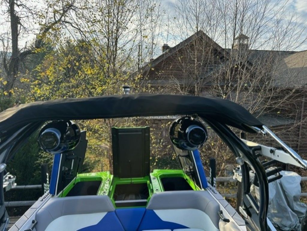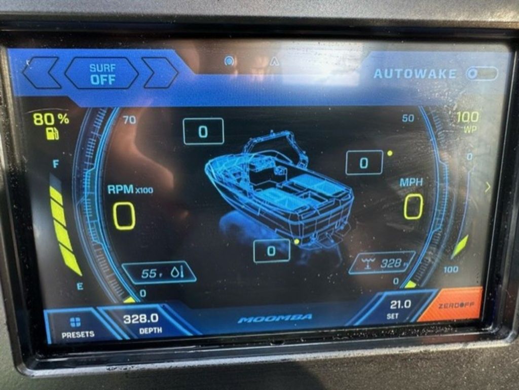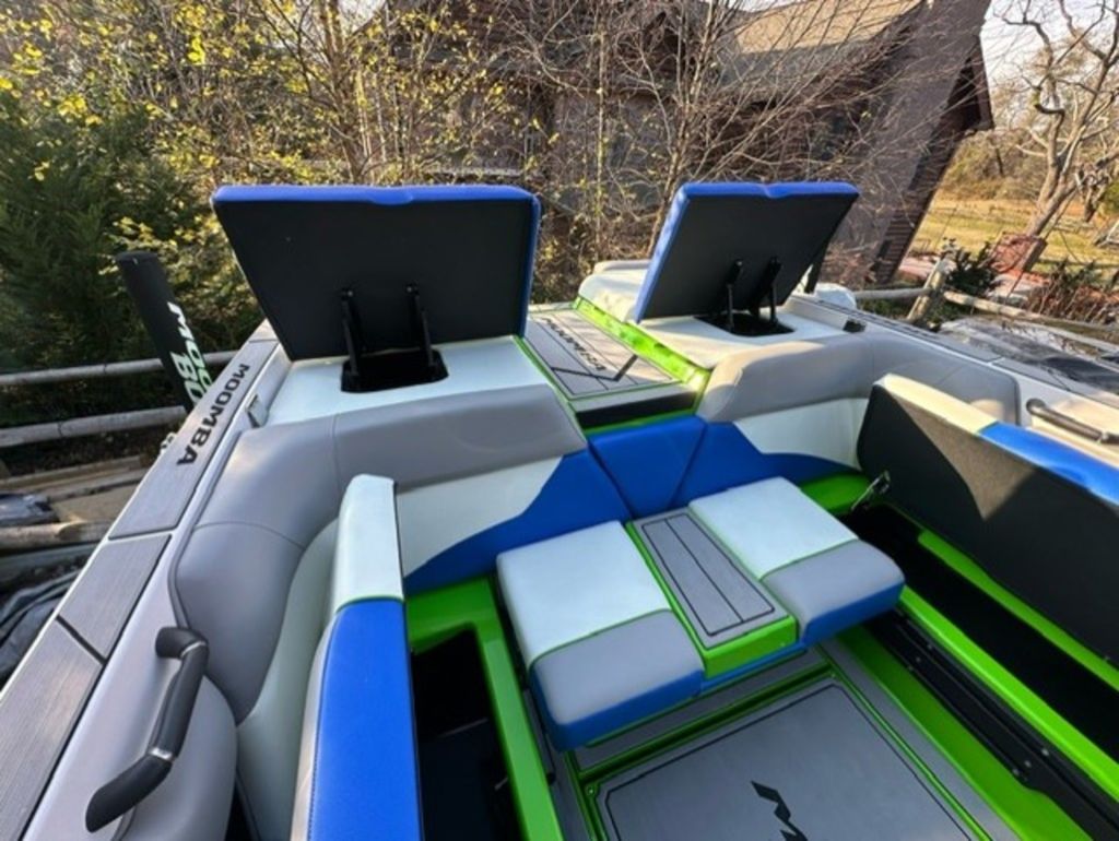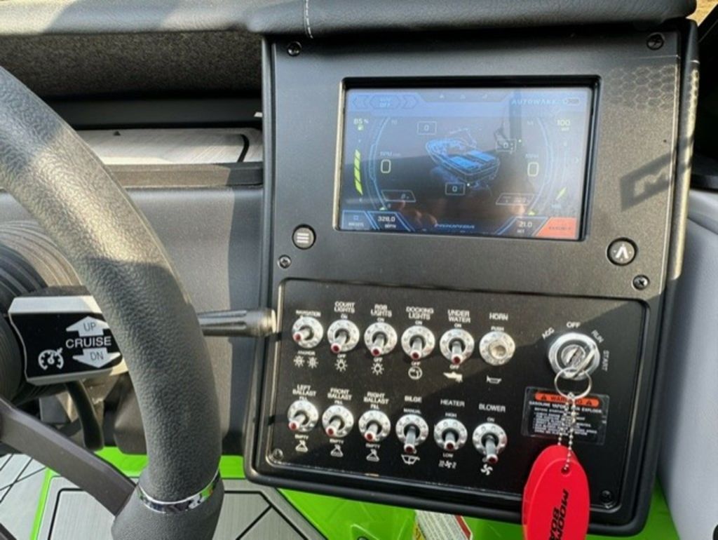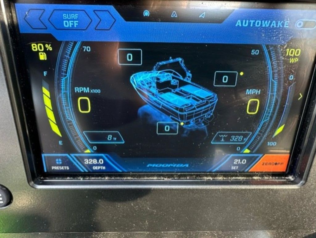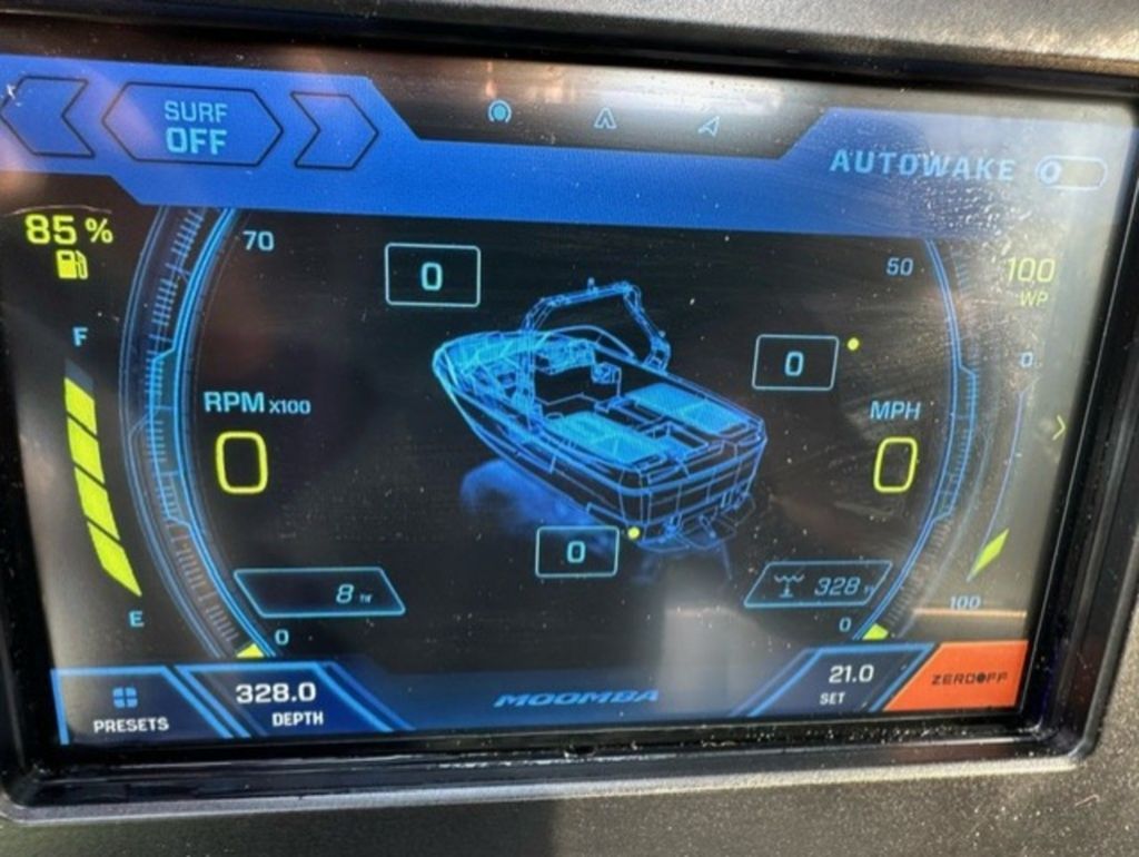 Indmar Raptor 400 Fuel Injected and Closed Cooled V8 Engine, Only 10 Hours, Flow 3 Surf System with G6 Ballast (2 pumps per zone), Center Smart WakePlate, Surf Pipe Exhaust Upgrade, Folding Pro Tower w/ Swivel board Racks, Bimini Top w/ Board Storage, Moomba 7 Touch Screen Display, Interior graphite/white with grey GatorStep Floor and Deck Kit, Stern Shade, windscreen, Premium WetSounds Stereo Upgrade w/ Rev 10 Tower Speakers, Bow Speakers, Amp, and Sub, Underwater Lights, PTM Extended Folding Ski Mirror, Dual Batteries w/ Switch, Battery Charger, Transom Side Storage Bins, Depth Finder, Water Temp, Captain's Chair w/ Bolster, Mooring Cover, Custom Matching Tandem Axle Trailer w/ Brakes, Swing Tongue, Aluminum Wheels w/ Matching Spare, runway lights, Transom Steps and Straps Included!