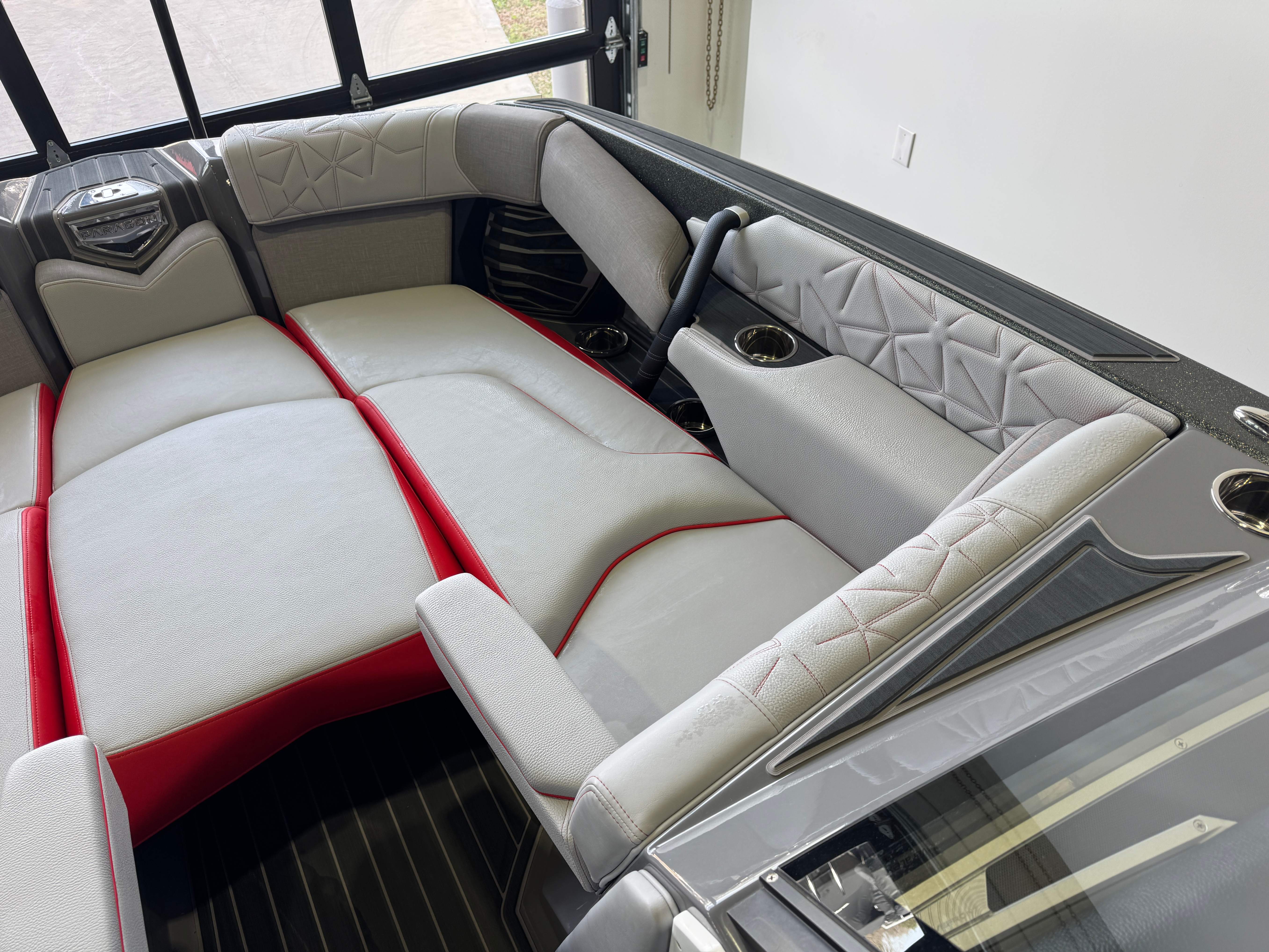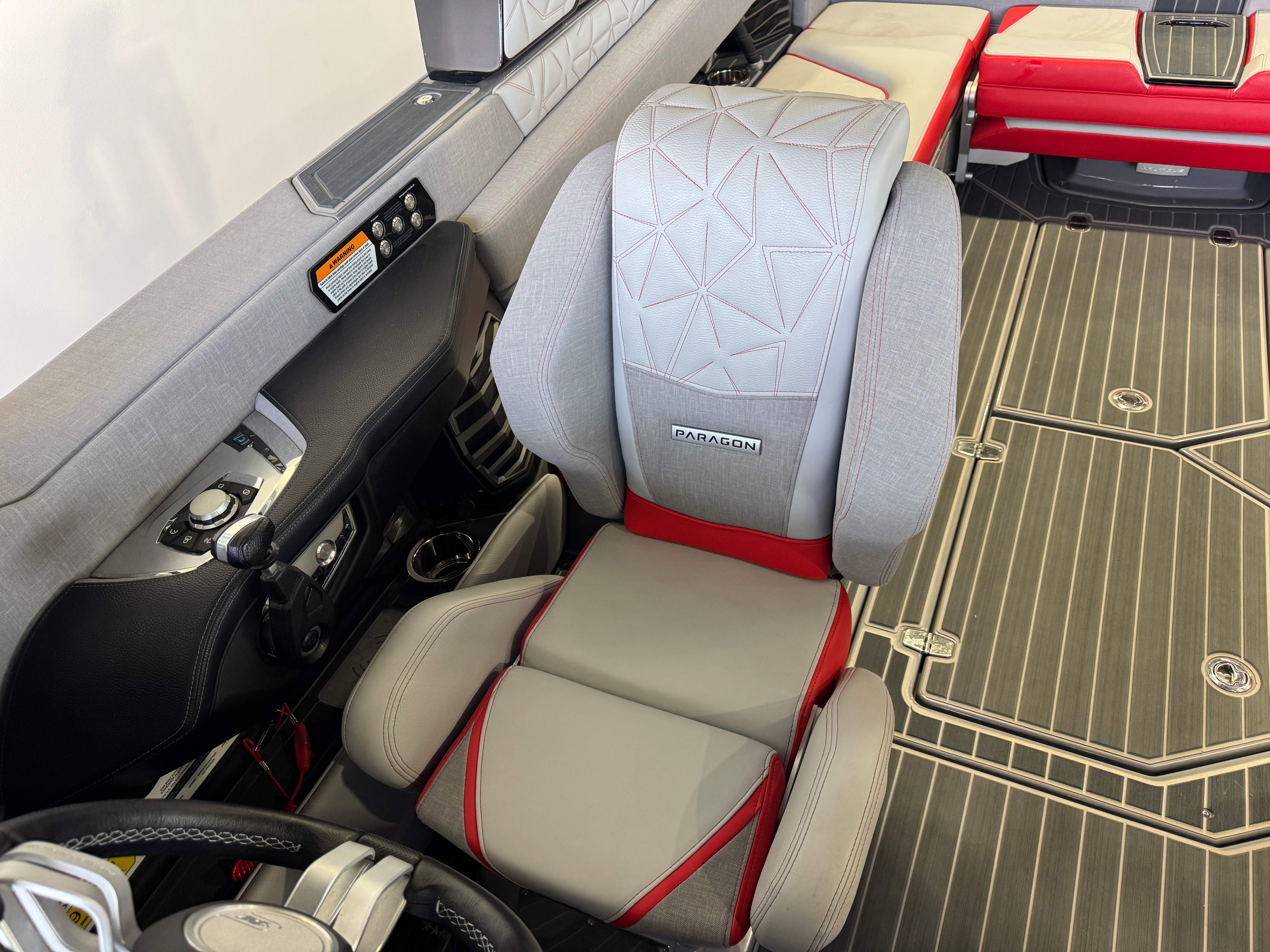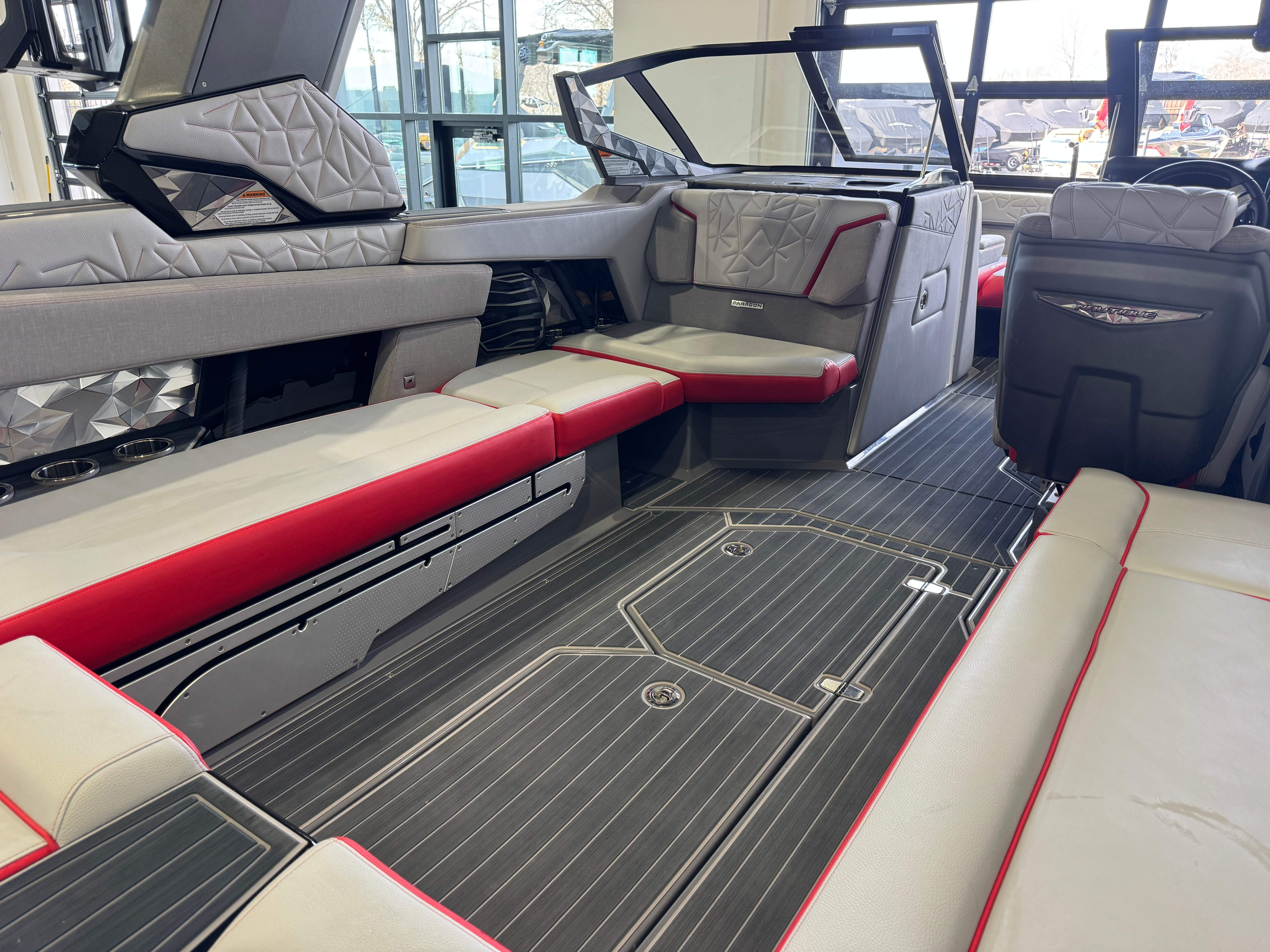 2023 Super Air Nautique Paragon 23 Standard Items Listed Below Nautique Configurable Running Surface with Hydro-Plate Nautique Dual LINC PANORAY with Helm Control, Zero Off, MyNautique™ Connectivity Platform Wireless Charging Nautique Surf System™ with WAVEPLATE & Surf Pipe Exhaust & Integrated Ballast (2,200 lbs) Paragon Telescoping Flight Control Tower System including: Nautique Awareness Camera, Strapless Board Racks, Bimini Top with Surf Pockets Stereo - JL Audio® M6 Series Studio Elite with WavefrontTM (Includes: Wavefront™, Dual Subwoofers (12"), Monoblock Subwoofer Amplifier) Tower Speakers - Dual Speaker Housing, JL Audio® M6 Series 880x Speakers (4) Stereo - Transom Mounted Remote Control Enhanced Courtesy Lighting Package (Customized Colors on Illuminated Cupholders, Courtesy Lights and Interior Chromax Badging) LED Lighting - Navigation and Docking Light Array; Courtesy Lights; Underwater Lights Power Management Including 3 AGM Batteries, with Battery Charger Coolers (Removable In-Floor and Transom),Waste Receptacle Freshwater Engine Flush System Tandem Spoke Leather Steering Wheel Sliding Reversible Stern Seat, Flip-Up Lounge Seat (Port) and Convertible Transom Seating Seating - Bow Armrests (Retractable) GoPro™ Ready Rotating Tow Point Walk-Thru Air-Dam (Pocket Door) Ladder - Platform Access Cleats (4) Premium Mirror