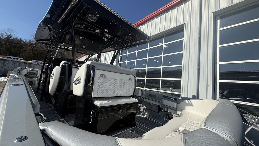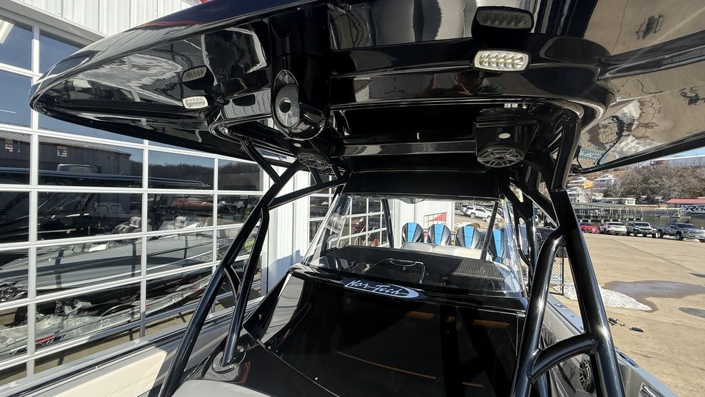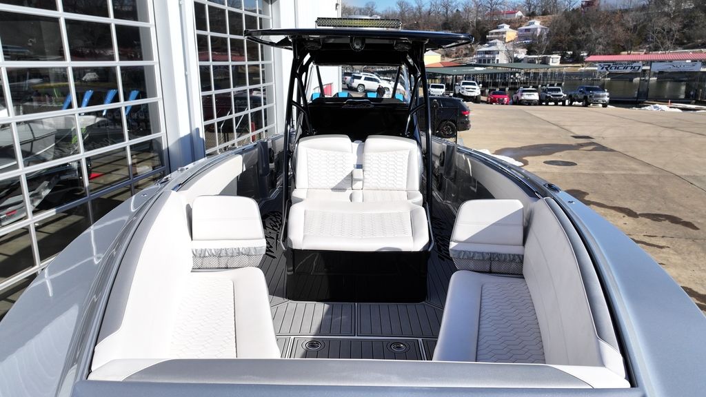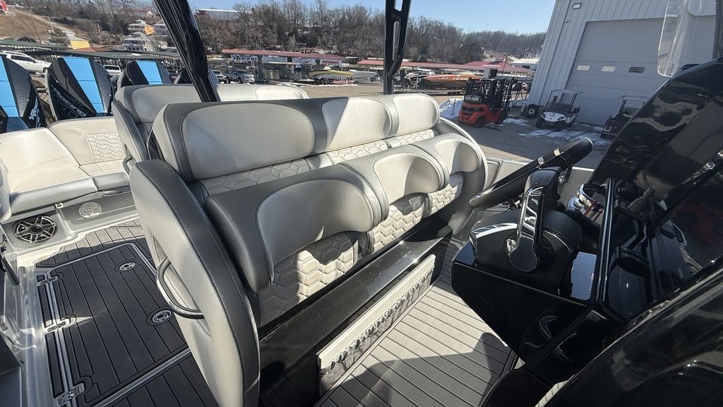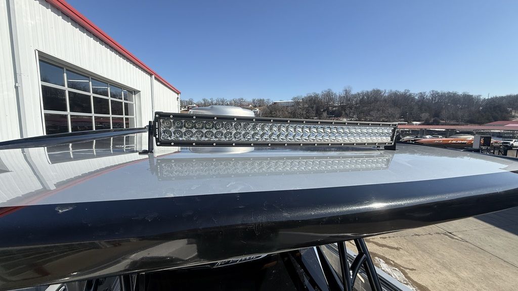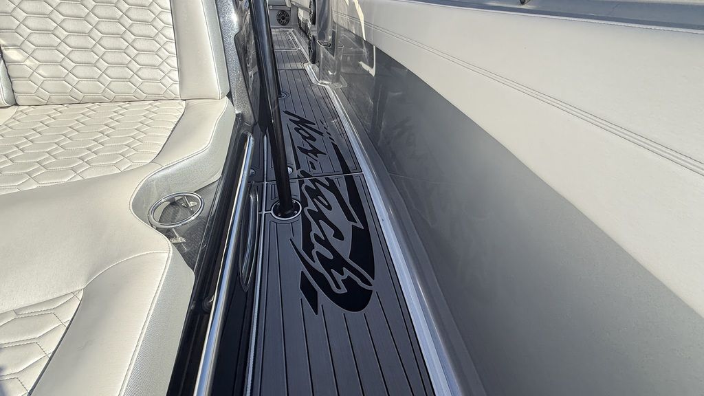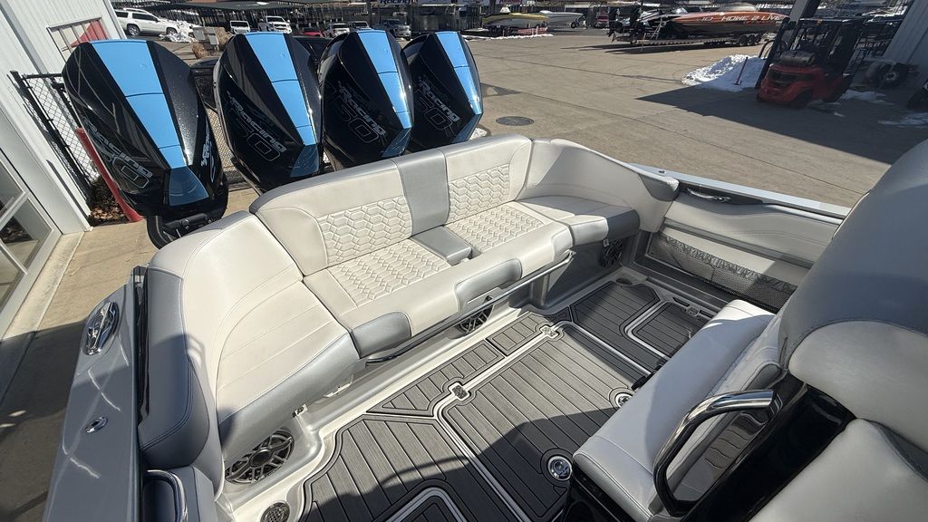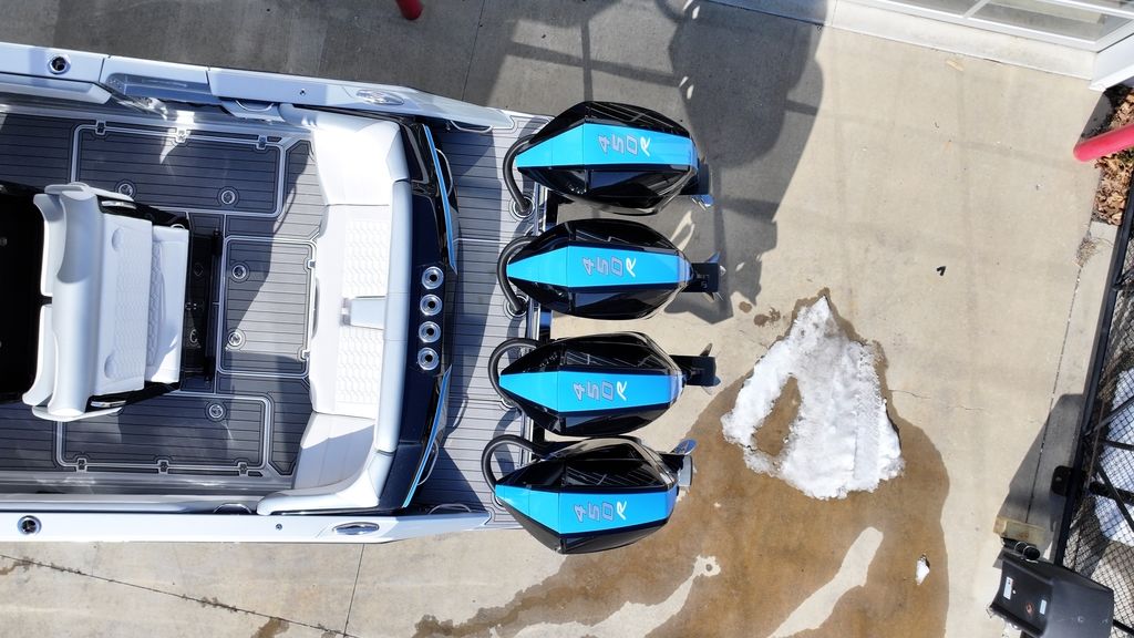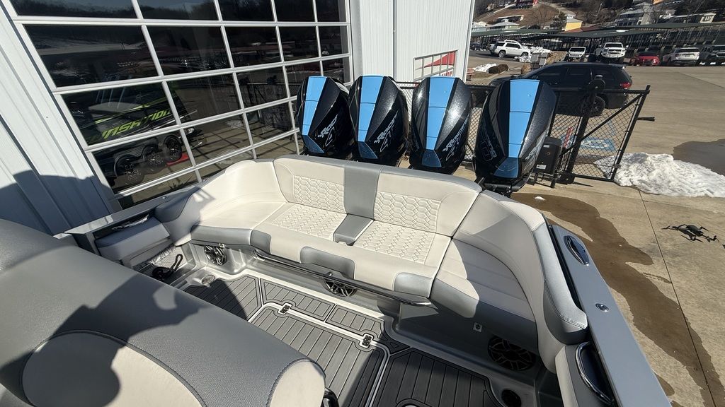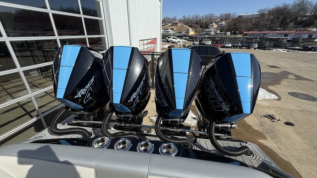 Keyless ignition, Fresh water engine flush (set up to do all motors at once), Mercury zero effort throttles, Isotta steering wheel, 30” black oak light bar, Garmin Radar, Auto pilot, Flir, Twin 22” Garmins, VHF radio xm radio and weather, Lumishore color changing lights throughout, Huge JL stereo w/ 18 speakers, Bow thruster, A/C with additional batteries, Optional 85 gal. Fuel tank bringing total to 365 gal, Power Sure shade Sea deck Flooring, Bow seat back rests, Club sport seating aft, Cabin Vacuflush Head, Cabin Sink, Second row seating with sliding cooler, Double diamond stitching, 4 rod/ drink holders, Windless Anchor, Custom paint job, Aluminum Triple Axle Sport Trail Trailer Included!
