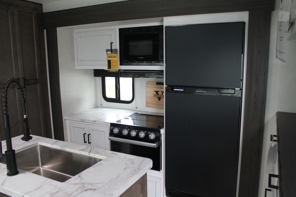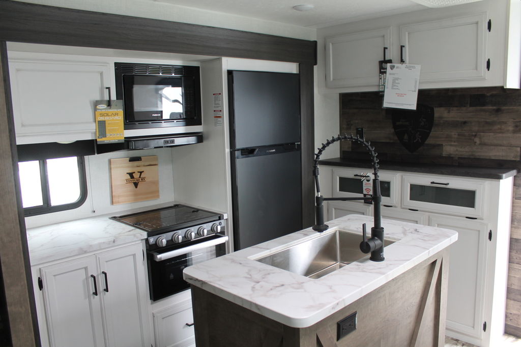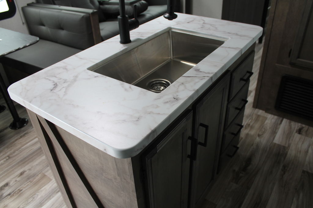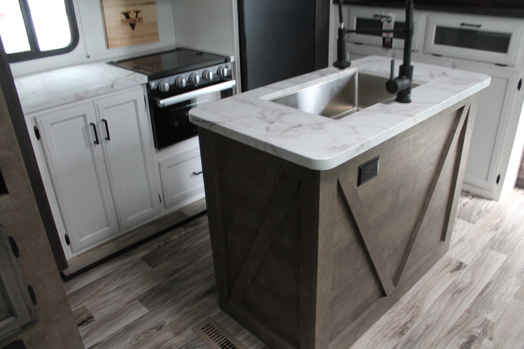 SportTrek represents user-inspired design. Purposeful residential kitchen with continuous countertops, stainless steel under-mount sink with pull-down sprayer faucet, and recessed gas cooktop with glass cover, for added counter space.