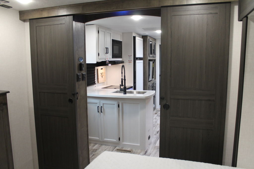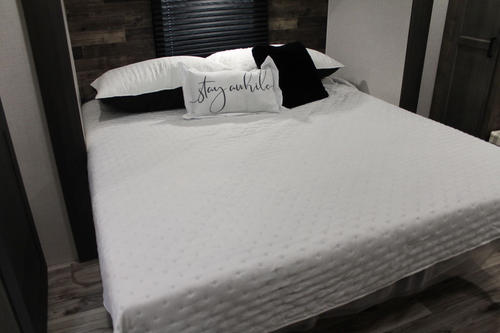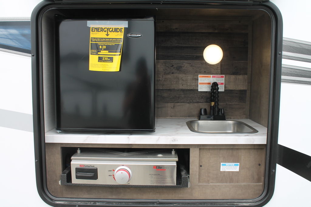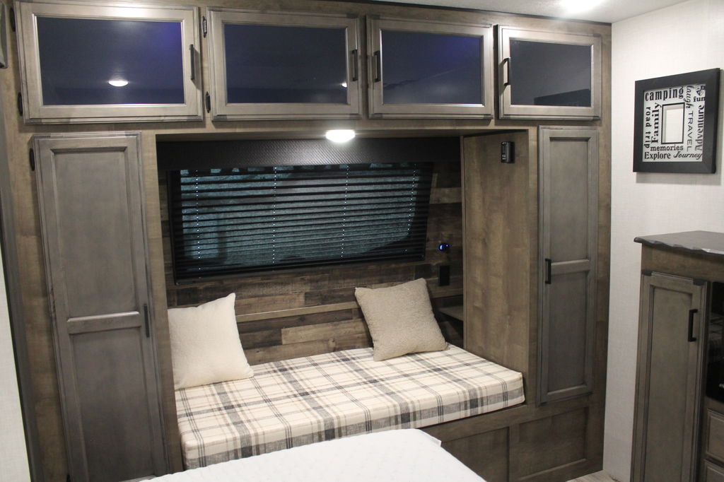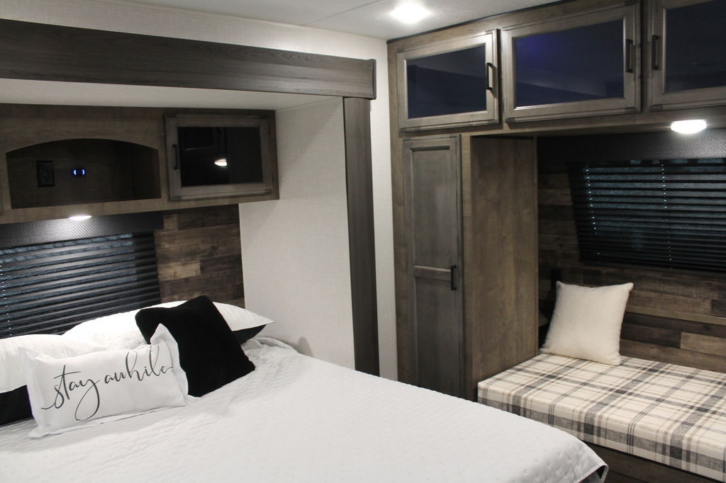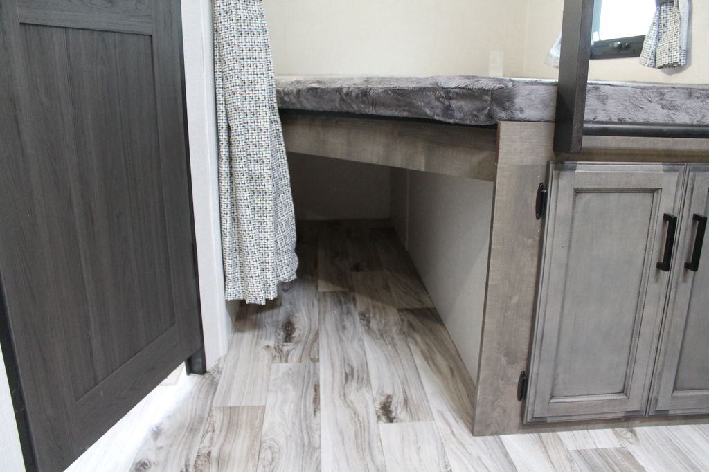 The SportTrek Touring line of luxury travel trailers offers thoughtful new features and fresh, elegant design elements inspired by people who love camping. The sophisticated residential kitchen is a highlight of Touring, with rich Mountain Walnut cabinetry, solid-surface countertops, an under-mount stainless steel sink with pull-down sprayer faucet, and recessed gas cooktop with glass cover for added counter space.