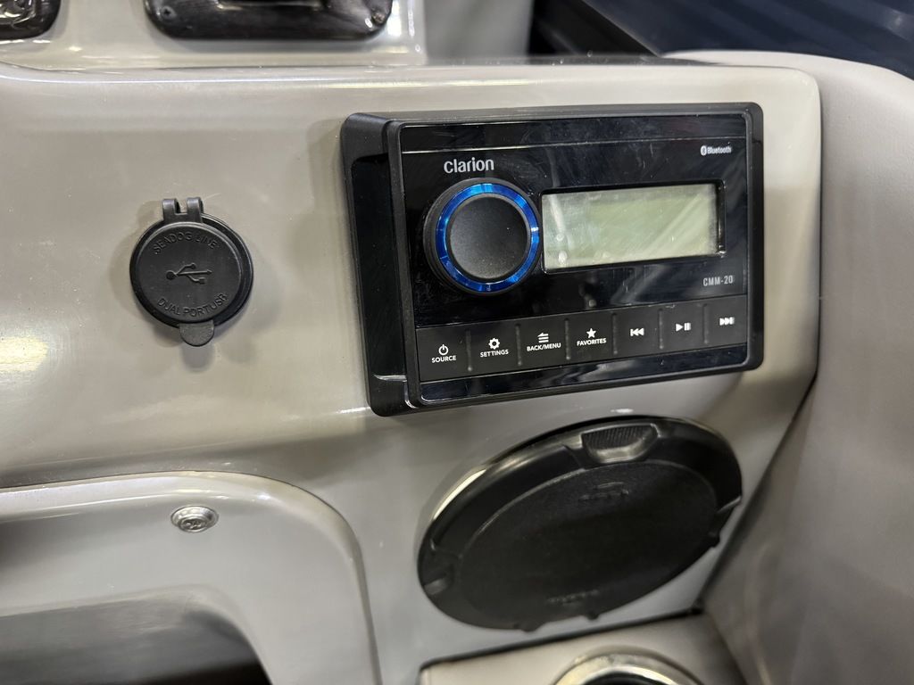 and a Tachometer, Fuel, Volt and Trim gauge. There is a Clarion Bluetooth audio