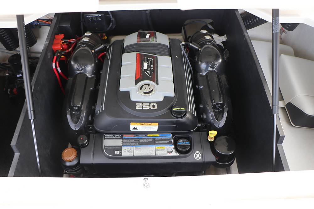 Powered by a Mercruiser 250hp engine, it delivers strong acceleration and smooth handling. A collapsible power tower with integrated Bimini top and full black canvas cover adds both style and function.
