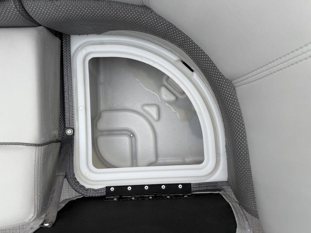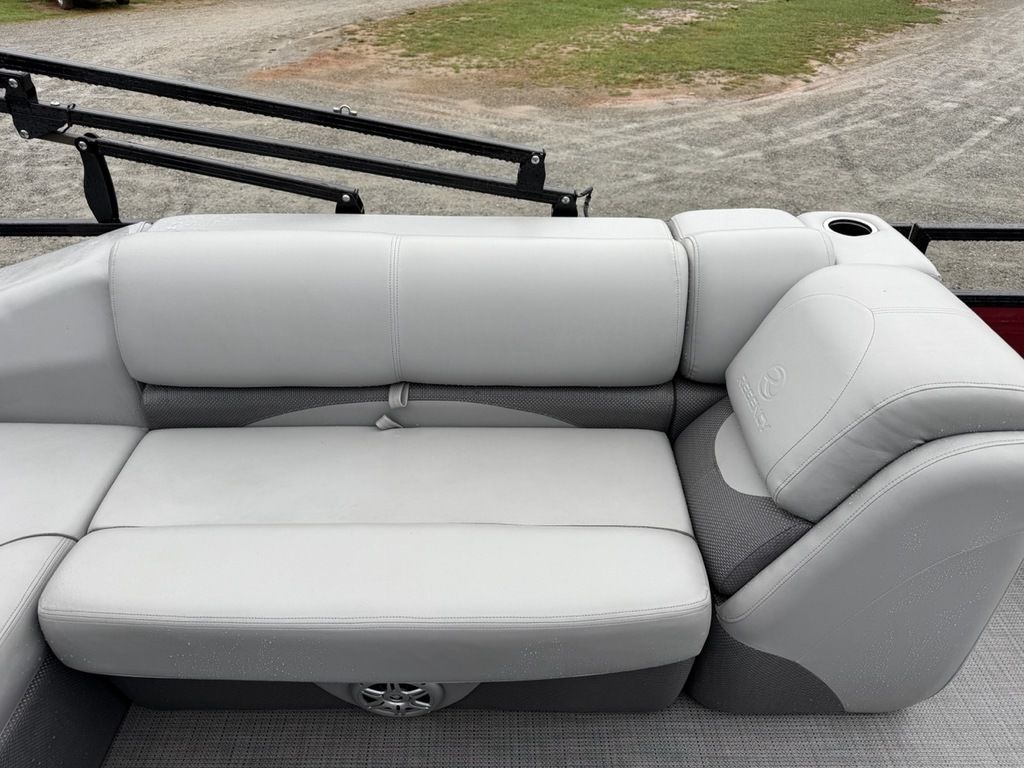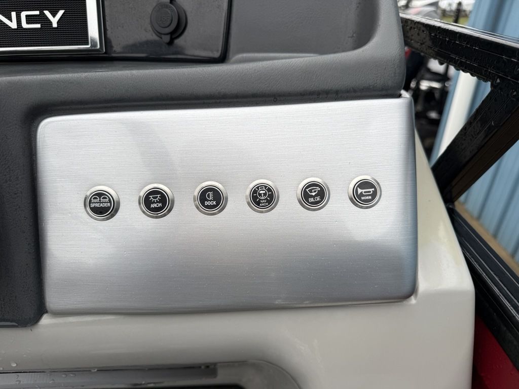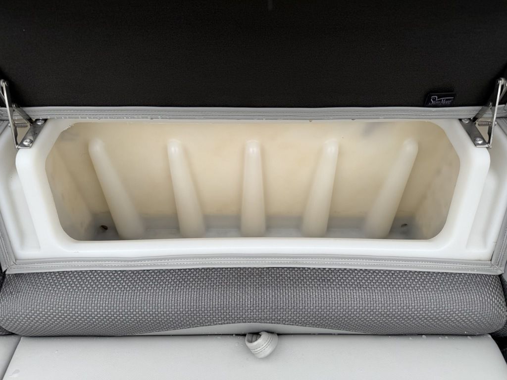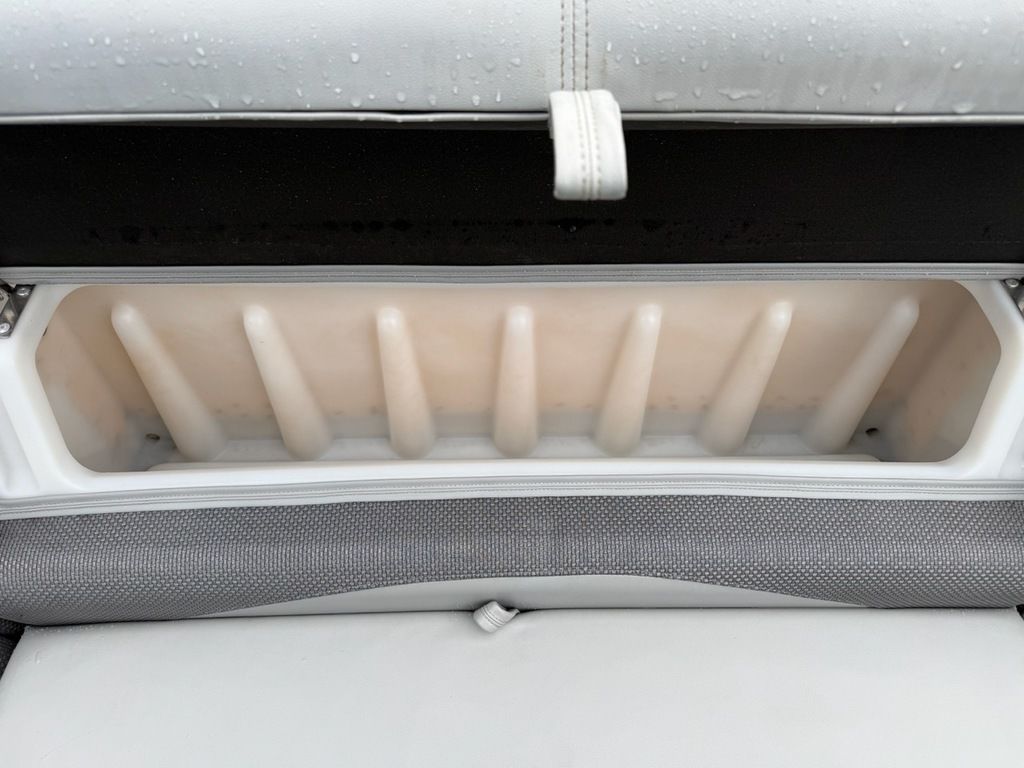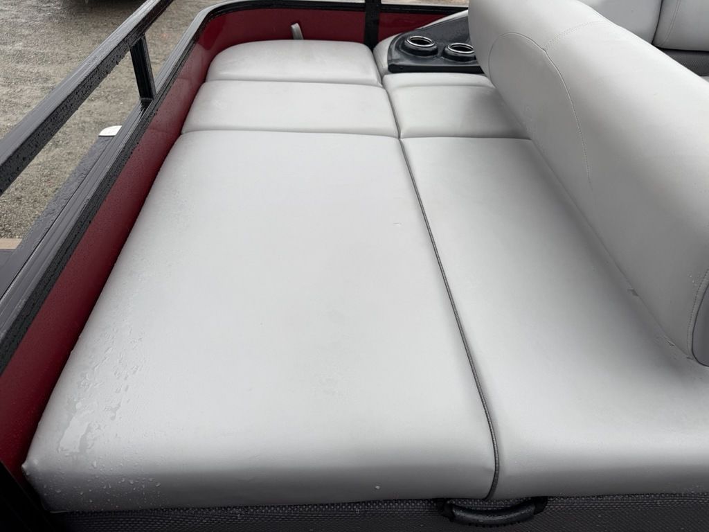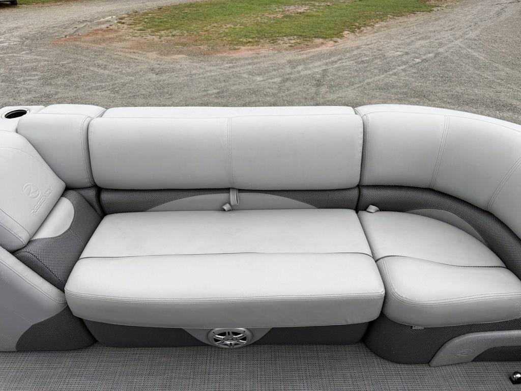 Inside, the DL3 offers an abundance of options for whiling the day away whether you take in the views from a pillowtop bow lounge or the roomy aft switch-back bed lounge. The ornate helm features LED-rimmed push-button switching, a Lowrance® depthfinder and Bluetooth® Kicker® stereo that powers four speakers. Cavernous underseat compartments complement the STOW MORE™ seatback storage and beneath the aft bed lounge is a pop-up changing enclosure for privacy. Bow to stern you’ll find blue tinted LEDs to set the mood after dark.