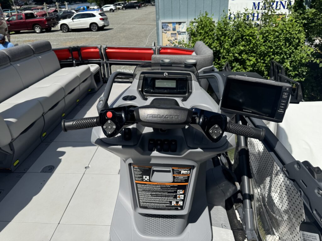Additional features include official Sea-Doo computer chip for sport mode, bimini with Air BIM hydraulic lifts, cover, Garmin maps computer, ski pylon, spare key fob (requires programming), and Leading Edge Performance tuned stainless steel impeller.