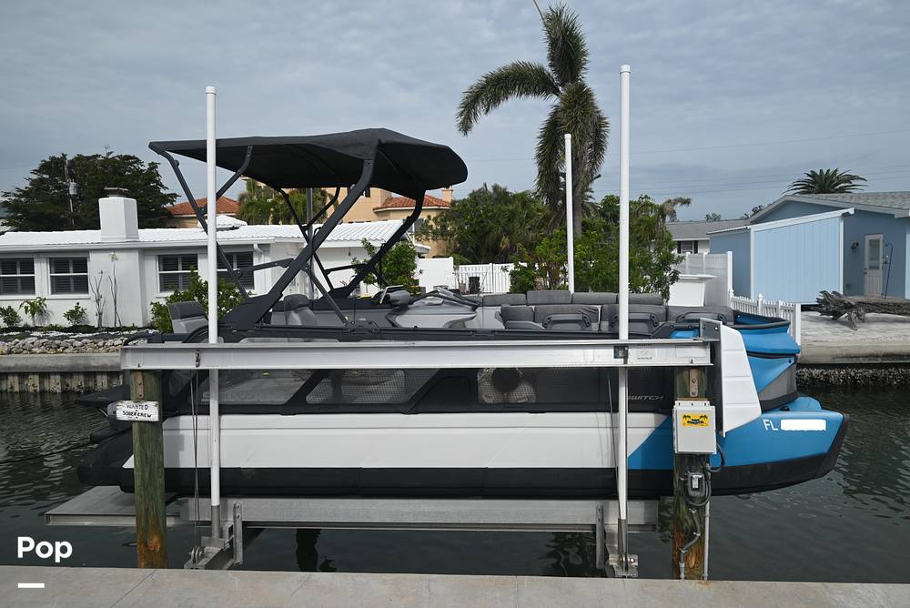The boat has an innovative layout with lounge room for up to 10 adults and storage for all their gear. The clear view side panels give the boat a more open feel. A sturdy bimini top provides shade and protection from the elements. The Switch modular deck design allows the owner to easily reconfigure the deck and lounge layout. Water access is provided by the full sized rear swim platform with retractable boarding ladder.