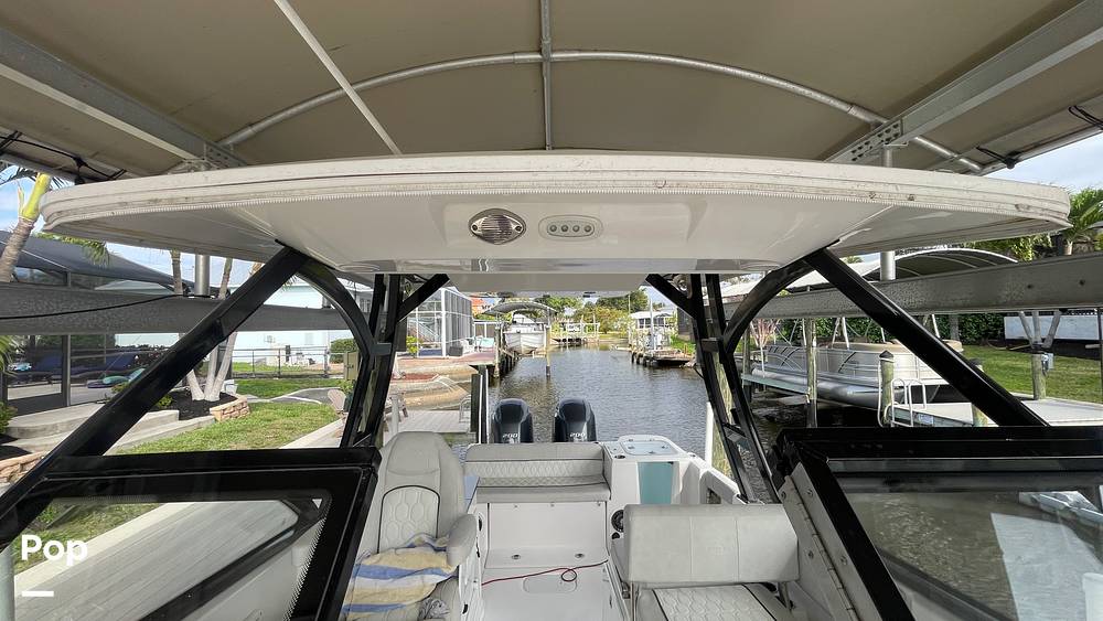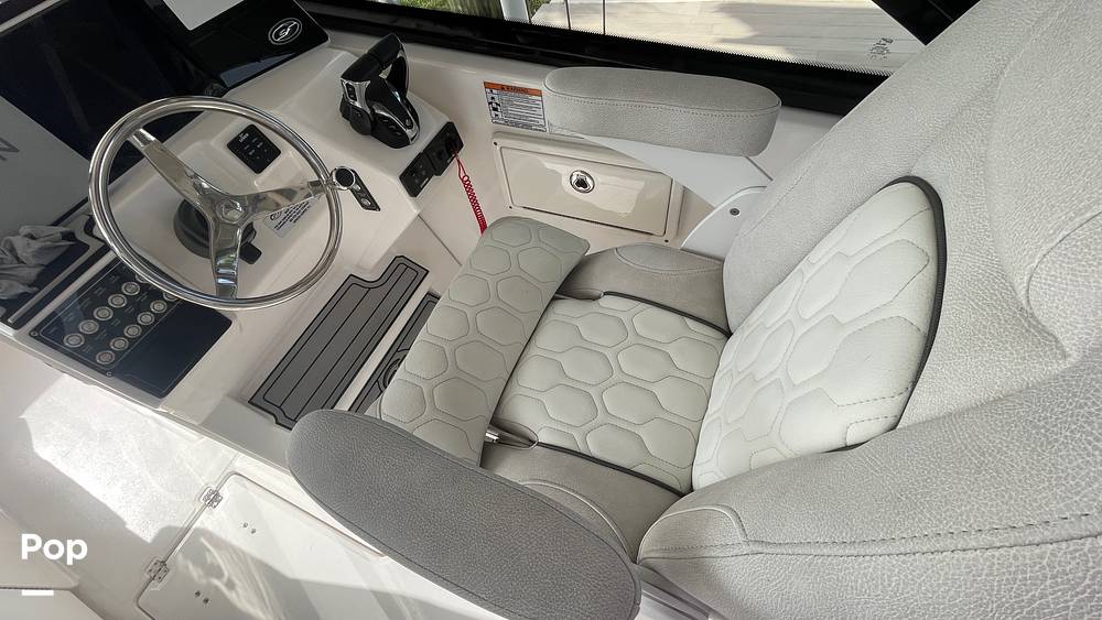 This particular 268 Traveler stands out with thoughtful upgrades that enhance both comfort and functionality. The port-side swim/dive/fish door with its sturdy stainless steel frame and secure latch provides effortless water access - perfect for swimming, diving, boarding from the dock, or quickly landing fish without climbing over high gunwales. Includes side curtains and rear curtin.