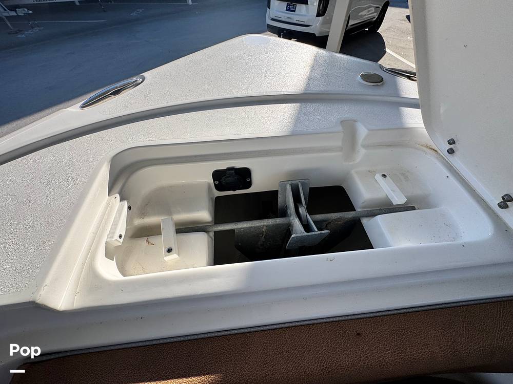 At the helm, the captain is setup with an acrylic dash with wireless phone charger, a large Garmin display, a VHF, and an integrated fiberglass T-top with tempered glass enclosure and an electric actuator to open the windscreen.