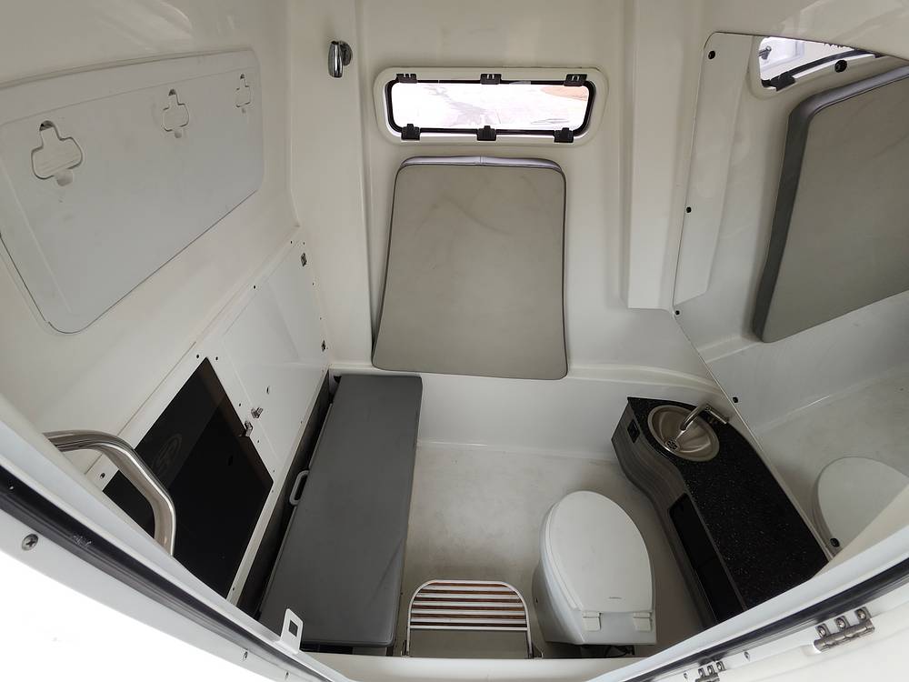 Up front features comfortable bow seating with a table that retracts flush to the deck and can be used as a table, sun pad, or casting deck. Down below, you can escape the elements in the center-console changing room equipped with a head (porcelain), freshwater sink, and fold-down bench seat with 6'2" standing headroom.