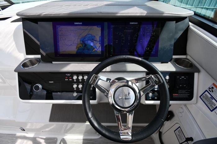 Freshwater / Great Lakes boat since new this vessel features Twin MerCruiser 6.2-litre 300-hp Gas Engine's with Bravo III Sterndrives and Axius Joy-Stick Piloting - Note only 129 original hours. Notable features include but are not limited to the following: Air-Conditioning & Heat (Cockpit / Cabin), Head (Vacuflush) w/Vanity/Sink/Shower, Cockpit Wet-Bar w/Sink/Drawer-Style Stainless-Steel Refrigerator/Kenyon Electric BBQ-Grill, Westerbeke Generator, Windlass-Anchor w/Remote Control - Note Polished Stainless-Steel Anchor, Dual Simrad Color / TouchScreen Display's w/Engine Interface/Radar/GPS/Chartplotter, Premium Fusion Sound System w/Zoned JL-Audio Speakers, Hydraulic Swim-Step, and MUCH more!