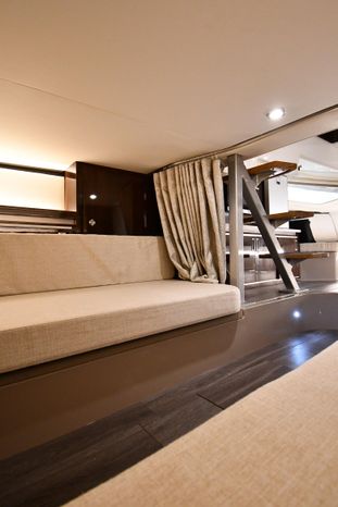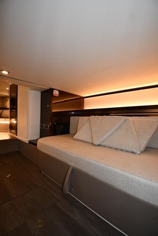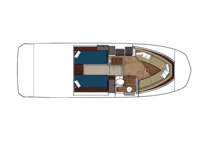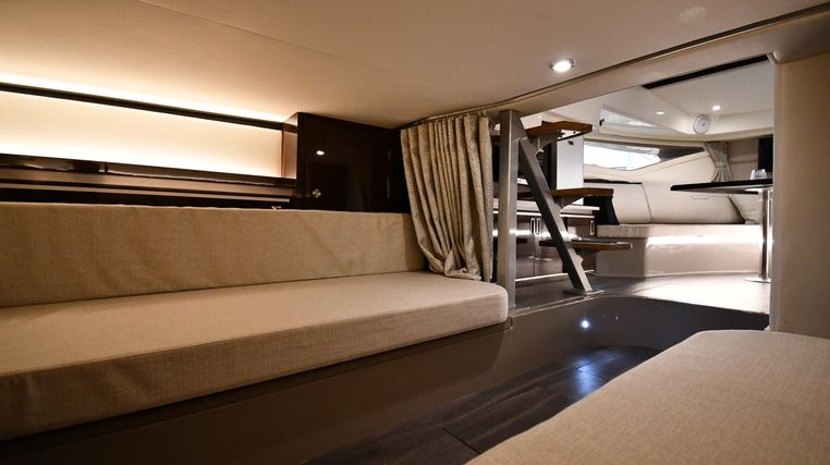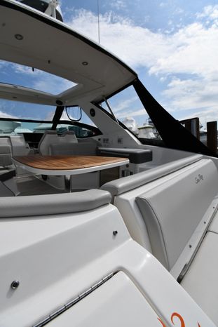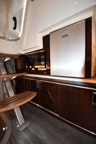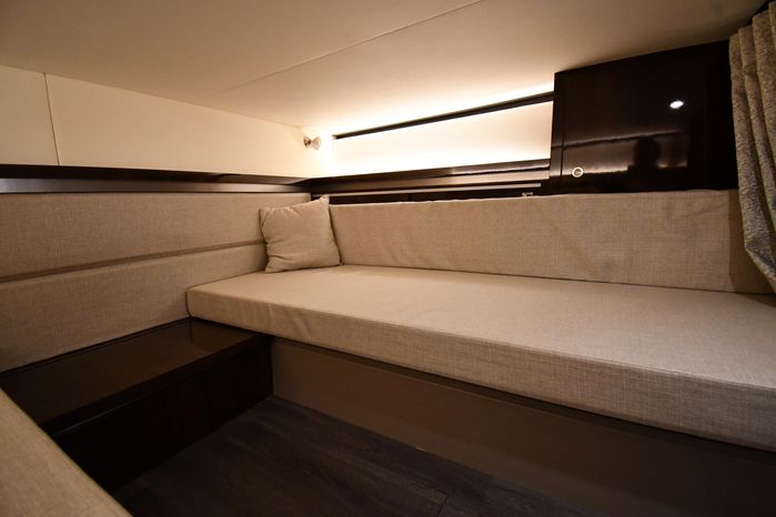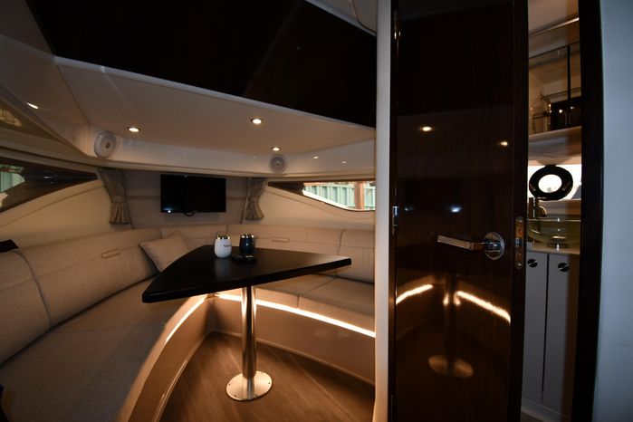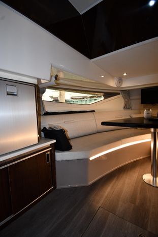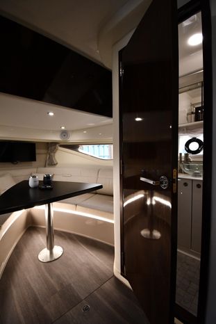 A cross between a sport cruiser and bow-rider, the forward lounge seating design of the 320 Sundancer is unique in a boat this size. Accessed from a port walkway with two 6" steps, the bow area features three individual, forward-facing lounge seats, each with an adjustable headrest and fold-down armrests. Cockpit features include a double helm seat with flip-up bolsters, an L-shaped settee with a removable table to port, a single jump seat abaft the helm, and a molded entertainment center aft of the jump seat with a Corian countertop, sink, refrigerator, trash receptacle and optional electric grill. Stowage is in the cockpit side panels, beneath the seats and in a deep transom compartment. A sun shade deploys from the hardtop to extend over the entire cockpit. Below, the 320 has a well-appointed cabin with an enclosed head and sleeping accommodations for four. In the aft cabin, sliding twin beds combine to form a queen bed, and the forward dinette converts to a V-berth. The mini-galley at the foot of the companionway steps includes a microwave and refrigerator. Twin 350hp MerCruiser Bravo III sterndrives cruise the 320 Sundancer at 24–26 knots (high 30s top).