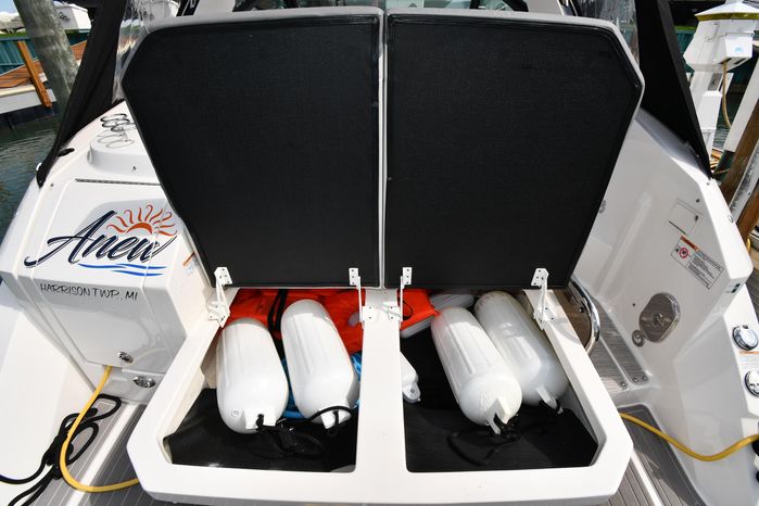Freshwater / Great Lakes boat since new this vessel features Twin MerCruiser 6.2-litre 300-hp Gas Engine's with Bravo III Sterndrives and Axius Joy-Stick Piloting - Note only 129 original hours. Notable features include but are not limited to the following: Air-Conditioning & Heat (Cockpit / Cabin), Head (Vacuflush) w/Vanity/Sink/Shower, Cockpit Wet-Bar w/Sink/Drawer-Style Stainless-Steel Refrigerator/Kenyon Electric BBQ-Grill, Westerbeke Generator, Windlass-Anchor w/Remote Control - Note Polished Stainless-Steel Anchor, Dual Simrad Color / TouchScreen Display's w/Engine Interface/Radar/GPS/Chartplotter, Premium Fusion Sound System w/Zoned JL-Audio Speakers, Hydraulic Swim-Step, and MUCH more!