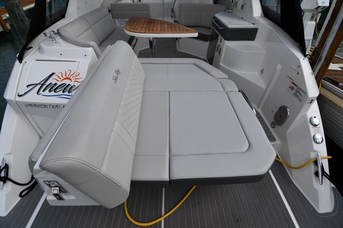 Freshwater / Great Lakes boat since new this vessel features Twin MerCruiser 6.2-litre 300-hp Gas Engine's with Bravo III Sterndrives and Axius Joy-Stick Piloting - Note only 129 original hours. Notable features include but are not limited to the following: Air-Conditioning & Heat (Cockpit / Cabin), Head (Vacuflush) w/Vanity/Sink/Shower, Cockpit Wet-Bar w/Sink/Drawer-Style Stainless-Steel Refrigerator/Kenyon Electric BBQ-Grill, Westerbeke Generator, Windlass-Anchor w/Remote Control - Note Polished Stainless-Steel Anchor, Dual Simrad Color / TouchScreen Display's w/Engine Interface/Radar/GPS/Chartplotter, Premium Fusion Sound System w/Zoned JL-Audio Speakers, Hydraulic Swim-Step, and MUCH more!