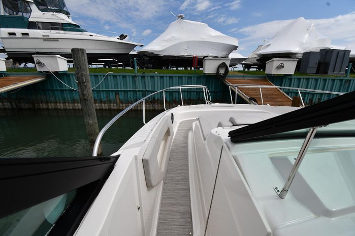 Freshwater / Great Lakes boat since new this vessel features Twin MerCruiser 6.2-litre 300-hp Gas Engine's with Bravo III Sterndrives and Axius Joy-Stick Piloting - Note only 129 original hours. Notable features include but are not limited to the following: Air-Conditioning & Heat (Cockpit / Cabin), Head (Vacuflush) w/Vanity/Sink/Shower, Cockpit Wet-Bar w/Sink/Drawer-Style Stainless-Steel Refrigerator/Kenyon Electric BBQ-Grill, Westerbeke Generator, Windlass-Anchor w/Remote Control - Note Polished Stainless-Steel Anchor, Dual Simrad Color / TouchScreen Display's w/Engine Interface/Radar/GPS/Chartplotter, Premium Fusion Sound System w/Zoned JL-Audio Speakers, Hydraulic Swim-Step, and MUCH more!