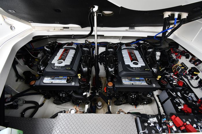 Freshwater / Great Lakes boat since new this vessel features Twin MerCruiser 6.2-litre 300-hp Gas Engine's with Bravo III Sterndrives and Axius Joy-Stick Piloting - Note only 129 original hours. Notable features include but are not limited to the following: Air-Conditioning & Heat (Cockpit / Cabin), Head (Vacuflush) w/Vanity/Sink/Shower, Cockpit Wet-Bar w/Sink/Drawer-Style Stainless-Steel Refrigerator/Kenyon Electric BBQ-Grill, Westerbeke Generator, Windlass-Anchor w/Remote Control - Note Polished Stainless-Steel Anchor, Dual Simrad Color / TouchScreen Display's w/Engine Interface/Radar/GPS/Chartplotter, Premium Fusion Sound System w/Zoned JL-Audio Speakers, Hydraulic Swim-Step, and MUCH more!