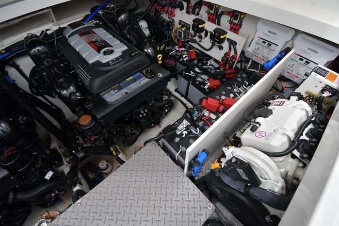 Freshwater / Great Lakes boat since new this vessel features Twin MerCruiser 6.2-litre 300-hp Gas Engine's with Bravo III Sterndrives and Axius Joy-Stick Piloting - Note only 129 original hours. Notable features include but are not limited to the following: Air-Conditioning & Heat (Cockpit / Cabin), Head (Vacuflush) w/Vanity/Sink/Shower, Cockpit Wet-Bar w/Sink/Drawer-Style Stainless-Steel Refrigerator/Kenyon Electric BBQ-Grill, Westerbeke Generator, Windlass-Anchor w/Remote Control - Note Polished Stainless-Steel Anchor, Dual Simrad Color / TouchScreen Display's w/Engine Interface/Radar/GPS/Chartplotter, Premium Fusion Sound System w/Zoned JL-Audio Speakers, Hydraulic Swim-Step, and MUCH more!
