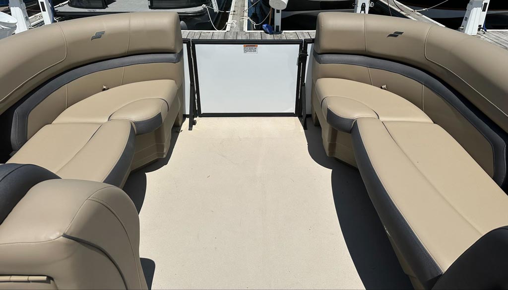 Features include full vinyl flooring in taupe, extended rear deck with closeout, black power bimini top and playpen cover, GPS with flush mount, pylon ski tow, and more!