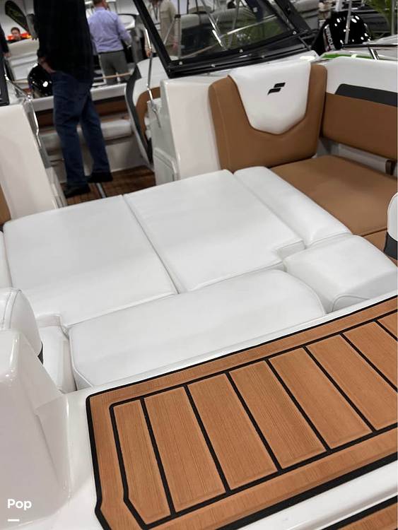 It comes with the EvA Soft Touch Traction Mat, bimini top, wraparound forward seating with a table, large swim platform both fore and aft, and a forward platform with a boarding ladder!