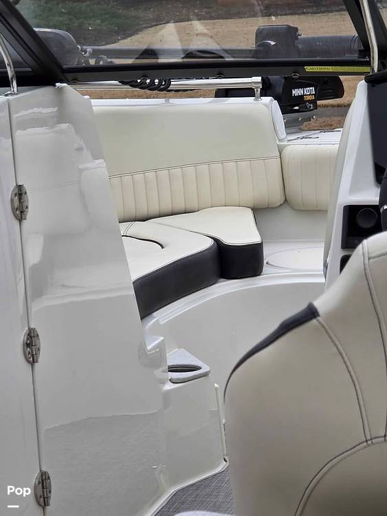 For fun on the water, it has removable forward and aft sun-pad cushions, Seagrass Flooring, removable convenience tables, and a pop-up ski tow bar along with a nice transom swim deck and both rear and aft swim ladders, a Fusion RA-60 Stereo with Bluetooth, a touch screen dash and underwater lights and many more upgrades and options.
