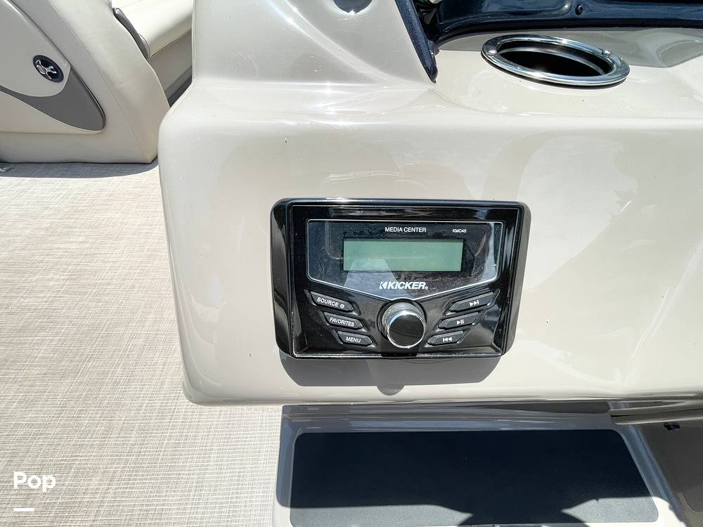 This party pontoon boat has a 38-gallon fuel tank powered by a Mercury 60 HP 4-stroke outboard with Command Thrust drive. With cup holders, a great sound system, and great seating, you and your friends will go all day and longer on this great boat.
