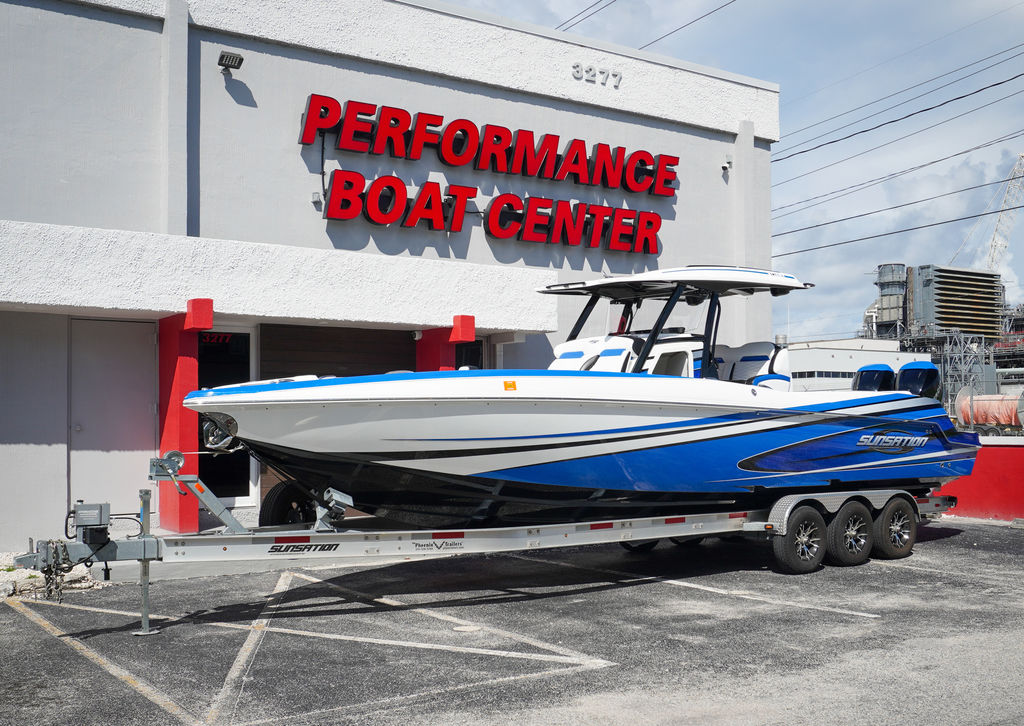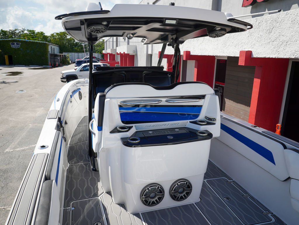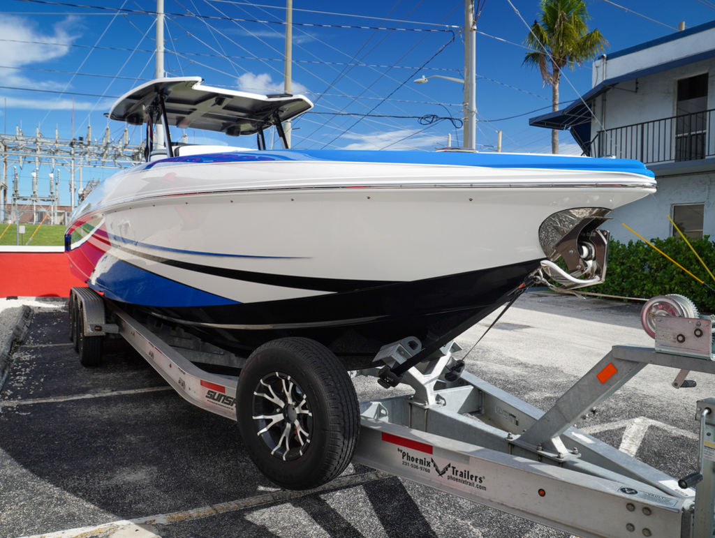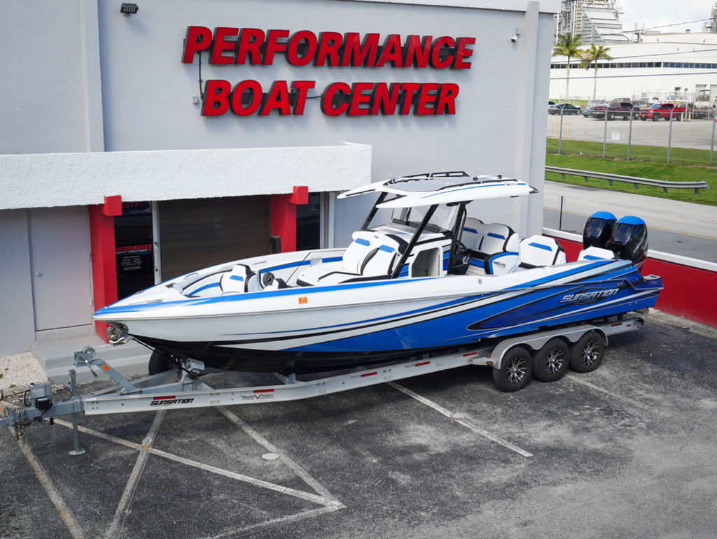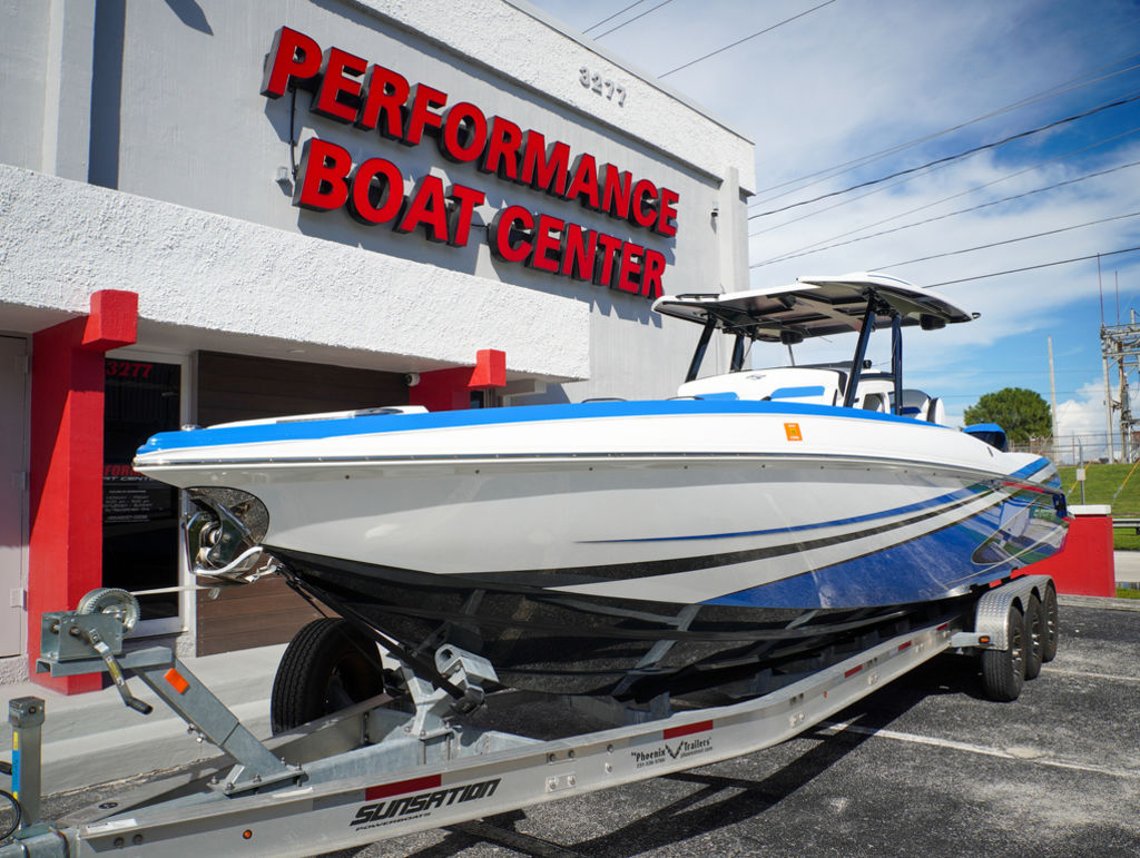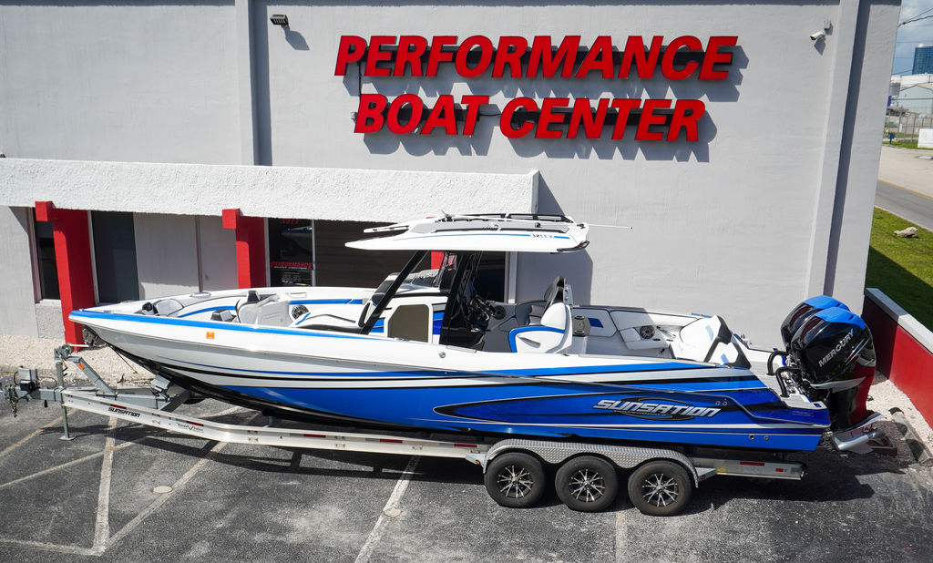 2023 Sunsation 32 CCX with twin Mercury L6 400M outboards with 2 year Mercury extended warranties and painted accents. Sold new by PBC. Optional Equipment: Beautiful detailed full paint by Mitcher T, Black Bottom gelcoat, Bow Thruster, Chill Plate in cooler seat, Electric head with holding tank and overboard discharge, VHF Radio, Full Cover with Hard Top Cover, Under Water Lights, Gunnel Rod Holders, Rear Sunshade, Transom Wash Down System, NO TRAILER. Always Dry Stored and serviced by Mercury Technician. Located in Ft.Lauderdale off site. Call for appointment to inspect.